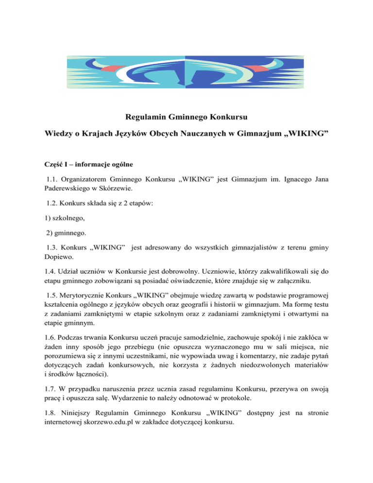 Regulamin Gminnego Konkursu Wiedzy o Krajach Języków Obcych Nauczanych w Gimnazjum „WIKING” Część I – informacje ogólne 1.1. Organizatorem Gminnego Konkursu „WIKING” jest Gimnazjum im. Ignacego Jana Paderewskiego w Skórzewie. 1.2. Konkurs składa się z 2 etapów: 1) szkolnego, 2) gminnego. 1.3. Konkurs „WIKING” jest adresowany do wszystkich gimnazjalistów z terenu gminy Dopiewo. 1.4. Udział uczniów w Konkursie jest dobrowolny. Uczniowie, którzy zakwalifikowali się do etapu gminnego zobowiązani są posiadać oświadczenie, które znajduje się w załączniku. 1.5. Merytorycznie Konkurs „WIKING” obejmuje wiedzę zawartą w podstawie programowej kształcenia ogólnego z języków obcych oraz geografii i historii w gimnazjum. Ma formę testu z zadaniami zamkniętymi w etapie szkolnym oraz z zadaniami zamkniętymi i otwartymi na etapie gminnym. 1.6. Podczas trwania Konkursu uczeń pracuje samodzielnie, zachowuje spokój i nie zakłóca w żaden inny sposób jego przebiegu (nie opuszcza wyznaczonego mu w sali miejsca, nie porozumiewa się z innymi uczestnikami, nie wypowiada uwag i komentarzy, nie zadaje pytań dotyczących zadań konkursowych, nie korzysta z żadnych niedozwolonych materiałów i środków łączności). 1.7. W przypadku naruszenia przez ucznia zasad regulaminu Konkursu, przerywa on swoją pracę i opuszcza salę. Wydarzenie to należy odnotować w protokole. 1.8. Niniejszy Regulamin Gminnego Konkursu „WIKING” dostępny jest na stronie internetowej skorzewo.edu.pl w zakładce dotyczącej konkursu. Część II – etap szkolny 2.1. Etap szkolny Konkursu „WIKING” odbędzie się 22 maja 2014 (czwartek) o godz. 9.00 w macierzystej szkole uczestników. 2.2. Czas przeznaczony na rozwiązanie zadań wynosi 45 minut. 2.3. W etapie szkolnym uczestnicy rozwiązują test złożony z zadań zamkniętych, dotyczących Zjednoczonego Królestwa Wielkiej Brytanii i Irlandii Północnej, Francji i Niemiec. Test dla uczniów, którzy uczą się języka francuskiego nie będzie zawierał pytań dotyczących Niemiec, a dla tych, którzy uczą się języka niemieckiego – pytań dotyczących Francji. 2.4. Zadania etapu szkolnego zostaną przesłane do szkoły do 19 maja 2014 r. Prosimy o wykonanie ilości kopii odpowiadającej liczbie uczestników. 2.5. Poszczególne szkoły na podstawie testu wyłonią 10 pierwszych osób z najwyższą punktacją. 2.6. Punkty uzyskane przez uczniów w I i II etapie sumują się. Prosimy o dostarczenie testów z I etapu konkursu do Gimnazjum im. Ignacego Jana Paderewskiego w Skórzewie do 10 czerwca 2014 r. Część III – etap gminny 3.1. Etap gminny Konkursu „WIKING” odbędzie się 10 czerwca 2014 r. (wtorek) o godz. 9.00 w Gimnazjum im. Ignacego Jana Paderewskiego w Skórzewie. 3.2. Czas przeznaczony na rozwiązanie zadań wynosi 60 minut. 3.3. Test na etapie gminnym składał się będzie z zadań zamkniętych i otwartych. Dotyczyć one będą podstawowej wiedzy o pozostałych krajach, które wchodzą w skład obszaru danego języka (np. Stany Zjednoczone, Kanada, Austria itd.) 3.4. Wyniki Gminnego Konkursu Wiedzy o Krajach Języków Obcych Nauczanych w Gimnazjum - WIKING zostaną ogłoszone 18 czerwca (środa) 2014 roku. Protokół Gminnego Konkursu Wiedzy o Krajach Języków Obcych Nauczanych w Gimnazjum – „WIKING” Etap szkolny I. II. Ilość uczniów biorących udział w etapie szkolnym Konkursu „WIKING”: ………………………... Do etapu gminnego zakwalifikowani zostali uczniowie: L.p. 1. 2. 3. 4. 5. 6. 7. 8. 9. 10. 11. 12. 13. 14. III. Imię i nazwisko Ilość punktów Uwagi o przebiegu etapu szkolnego Konkursu „WIKING”: ……………………………………………………………………………………………………… ……………………………………………………………………………………………………… ……………………………………………………………………………………………………… ……………………………………………………………………………………………………… …………………………………….. (miejscowość, data) ……….………………………………………… (podpis osoby przeprowadzającej konkurs) Protokół Gminnego Konkursu Wiedzy o Krajach Języków Obcych Nauczanych w Gimnazjum – „WIKING” Etap gminny I. Ilość uczniów biorących udział w etapie gminnym Konkursu „WIKING”: ……...................... II. Zwycięzcy Gminnego Konkursu Wiedzy o Krajach Języków Obcych Nauczanych w Gimnazjum „WIKING”: L.p. Imię i nazwisko Nazwa szkoły Ilość punktów 1. 2. 3. 4. 5. III. Uwagi o przebiegu etapu gminnego Konkursu „WIKING”: ……………………………………………………………………………………………………… ……………………………………………………………………………………………………… ……………………………………………………………………………………………………… ……………………………………………………………………………………………………… …………………………………….. (miejscowość, data) ……….………………………………………… (podpis osoby przeprowadzającej konkurs) ......................................................... ........................................ imiona i nazwiska rodziców (prawnych opiekunów) miejscowość, data ......................................................... adres rodziców (prawnych opiekunów) Oświadczenie W związku z udziałem w Gminnym Konkursie Wiedzy o Krajach Języków Obcych Nauczanych w Gimnazjum - „WIKING” wyrażam zgodę na przetwarzanie danych osobowych na potrzeby Konkursu syna/córki.....................................................................................................
