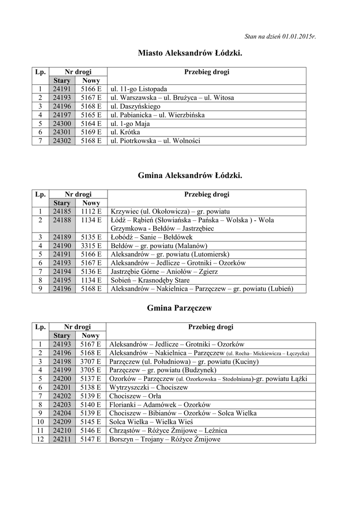 Stan na dzień 01.01.2015r. Miasto Aleksandrów Łódzki. Lp. 1 2 3 4 5 6 7 Nr drogi Stary Nowy 24191 5166 E 24193 5167 E 24196 5168 E 24197 5165 E 24300 5164 E 24301 5169 E 24302 5168 E Przebieg drogi ul. 11-go Listopada ul. Warszawska – ul. BruŜyca – ul. Witosa ul. Daszyńskiego ul. Pabianicka – ul. Wierzbińska ul. 1-go Maja ul. Krótka ul. Piotrkowska – ul. Wolności Gmina Aleksandrów Łódzki. Lp. 1 2 Nr drogi Stary Nowy 24185 1112 E 24188 1134 E 3 4 5 6 7 8 9 24189 24190 24191 24193 24194 24195 24196 5135 E 3315 E 5166 E 5167 E 5136 E 1134 E 5168 E Przebieg drogi Krzywiec (ul. Okołowicza) – gr. powiatu Łódź – Rąbień (Słowiańska – Pańska – Wolska ) - Wola Grzymkowa - Bełdów – Jastrzębiec Łobódź – Sanie – Bełdówek Bełdów – gr. powiatu (Malanów) Aleksandrów – gr. powiatu (Lutomiersk) Aleksandrów – Jedlicze – Grotniki – Ozorków Jastrzębie Górne – Aniołów – Zgierz Sobień – Krasnodęby Stare Aleksandrów – Nakielnica – Parzęczew – gr. powiatu (Lubień) Gmina Parzęczew Lp. 1 2 3 4 5 6 7 8 9 10 11 12 Nr drogi Stary Nowy 24193 5167 E 24196 5168 E 24198 3707 E 24199 3705 E 24200 5137 E 24201 5138 E 24202 5139 E 24203 5140 E 24204 5139 E 24209 5145 E 24210 5146 E 24211 5147 E Przebieg drogi Aleksandrów – Jedlicze – Grotniki – Ozorków Aleksandrów – Nakielnica – Parzęczew (ul. Rocha– Mickiewicza – Łęczycka) Parzęczew (ul. Południowa) – gr. powiatu (Kuciny) Parzęczew – gr. powiatu (Budzynek) Ozorków – Parzęczew (ul. Ozorkowska – Stodolniana)-gr. powiatu ŁąŜki Wytrzyszczki – Chociszew Chociszew – Orła Florianki – Adamówek – Ozorków Chociszew – Bibianów – Ozorków – Solca Wielka Solca Wielka – Wielka Wieś Chrząstów – RóŜyce śmijowe – Leźnica Borszyn – Trojany – RóŜyce śmijowe Miasto Ozorków Lp. 1 2 3 4 5 6 7 8 9 10 11 12 13 14 15 16 17 18 Nr drogi Stary Nowy 24193 5167 E 24200 5137 E 24203 5140 E 24204 5139 E 24600 5173 E 24601 5137 E 24602 5175 E 24603 5176 E 24604 5177 E 24605 5137 E 24607 5179 E 24608 5174 E 24609 5172 E 24611 5171 E 24612 5170 E 24613 5180 E 24614 5137 E 24615 5174 E Przebieg drogi Aleksandrów – Grotniki – Ozorków (ul. bez nazwy) ul. Konstytucji 3-go Maja ul. Adamówek – Nowe Miasto – ul. Starzyńskiego ul. Makowa – ul. śytnia ul. Zgierska – ul. Wyszyńskiego – Plac J. Pawła – ul. Listopadowa ul. Maszkowska ul. Kolejowa ul. świrki ul. Mickiewicza – ul. Kościuszki – ul. Słowackiego ul. Południowa ul. Traugutta ul. Mielczarskiego – Cegielniana – śeromskiego –Stypułkowskiego ul. Tkacka – ul. Bema – ul. Sucharskiego ul. Prosta ul. Średnia ul. Zielona Nowy Rynek Rondo Gmina Ozorków Lp. 1 2 3 4 5 6 7 8 9 10 11 Nr drogi Stary Nowy 24106 5109 E 24196 5168 E 24204 5139 E 24209 5145 E 24211 5147 E 24212 5148 E 24213 5149 E 24214 5150 E 24215 2513 E 24216 5109 E 24217 5128 E Przebieg drogi Modlna – Gieczno – Kwilno – Władysławów Aleksandrów – Nakielnica – Parzęczew – gr. powiatu – Lubień Chociszew – Bibianów – Ozorków – Solca Wielka Solca Wielka – Wielka Wieś Borszyn – Trojany – RóŜyce Nowe Sierpów – Parzyce Ozorków – Gębice – Cedrowice Ozorków – Cedrowice – Leśmierz Maszkowice – Leśmierz – AmbroŜew Modlna – Leśmierz – Mierczyn – gr. powiatu (Łęczyca) Emilia – Kania Góra – Sokolniki (ul. Narutowicza – ul. Jagiellońska) Miasto Głowno Lp. 1 2 3 4 5 6 7 8 9 Nr drogi Stary Nowy 24114 5118 E 24115 5118 E 24118 5101 E 24121 5125 E 24122 5126 E 24400 5101 E 24401 5101 E 5125 E 24402 5163 E 24403 5118 E Przebieg drogi Głowno (ul. bez nazwy) – Popów – Nowy Antoniew – gr. powiatu (Waliszew) Głowno (ul. Dąbrowskiego – Kolejowa – Główna) – Domaradzyn - Pludwiny Głowno (ul. Bielawska) – Helenów – gr. powiatu (Bielawy) Głowno (ul. Ostrołęcka - część) – Ostrołęka – Albinów Głowno (ul. Targowa) – Wola Lubiankowska – gr. powiatu (Łyszkowice) Głowno (ul. Sikorskiego) Głowno (ul. Swoboda – ul. Zgierska – ul. Łowicka) Głowno (ul. Torowa – ul. Ziewanicka - część) Głowno (ul. Zabrzeźniańska) Gmina Głowno Lp. 1 2 3 4 5 6 7 8 9 10 11 12 13 14 15 16 17 Nr drogi Stary Nowy 24105 5108 E 24107 5111 E 24109 5114 E 24110 5115 E 24111 5115 E 24112 5116 E 24113 5117 E 24114 5118 E 24115 5119 E 24116 5120 E 24117 5121 E 24118 5101 E 24119 5123 E 24120 5124 E 24121 5125 E 24122 5126 E 24125 5110 E Przebieg drogi Rogóźno – Feliksów – Gozdów Koźle – Gozdów – Mąkolice Wola Lubiankowska – Albinów – gr. powiatu (Domaniewice) Wola Mąkolska – Popów Popów – gr. powiatu (Jasionna) Popów – Mięsośnia – gr. powiatu (Waliszew) Mięsośnia – Dąbrowa – gr. powiatu (Bogumin) Głowno – Popów – Nowy Antoniew – gr. powiatu (Waliszew) Głowno – Domaradzyn – Pludwiny Bratoszewice – Domaradzyn – Popów Antoniew – Skubiki – gr. powiatu (Waliszew) Głowno – Helenów – gr. powiatu (Bielawy) Patyki – Antoniew Głowno – Wola ZbroŜkowa – gr. powiatu (Strzebieszew) Głowno – Ostrołęka – Albinów Głowno – Wola Lubiankowska – gr. powiatu (Łyszkowice) Stryków – Koźle – Pludwiny – Mąkolice – gr. powiatu (Jasionna) Miasto Stryków Lp. 1 2 3 4 5 67 Nr drogi Stary Nowy 24101 5104 E 24125 5110 E 24129 5100 E 24130 5162 E 24801 5113 E 24802 5113 E Przebieg drogi Stryków (ul. Sowińskiego) – Swędów – Cyprianów Stryków (ul. Kolejowa) – Koźle – Pludwiny – gr. powiatu (Jasionna) Stryków (ul. Targowa) – SierŜnia – gr. powiatu (Brzeziny) Stryków (ul. Wczasowa) – Cesarka – Bartolin Stryków (ul. Sienkiewicza) Stryków (ul. Kolejowa - część) Gmina Stryków Lp. 1 2 3 4 5 6 7 8 9 10 11 12 13 14 15 16 17 18 19 Nr drogi Stary Nowy 24101 5104 E 24105 5108 E 24107 5111 E 24115 5119 E 24116 5120 E 24123 5127 E 24124 5112 E 24125 5110 E 24126 5112 E 24127 1150 E 24128 5103 E 24129 5100 E 24130 5162 E 24131 5129 E 24132 5129 E 24133