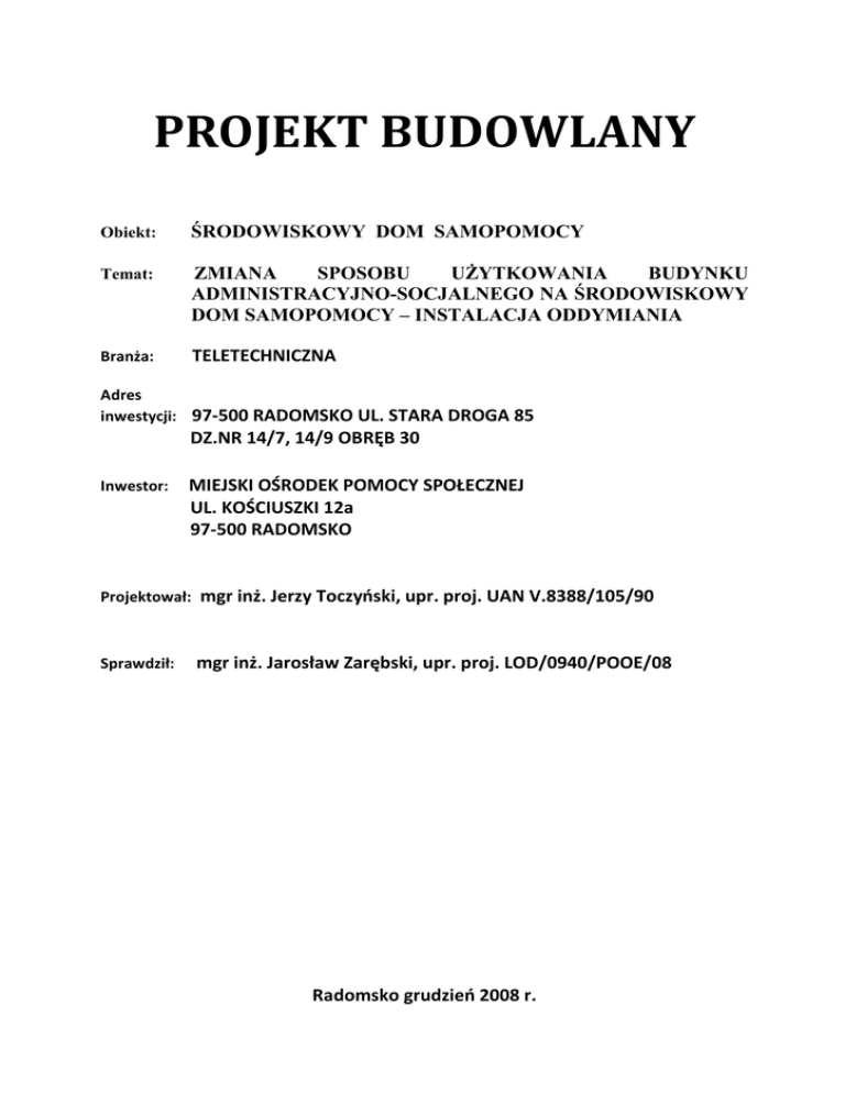 PROJEKT BUDOWLANY Obiekt: ŚRODOWISKOWY DOM SAMOPOMOCY Temat: ZMIANA SPOSOBU UŻYTKOWANIA BUDYNKU ADMINISTRACYJNO-SOCJALNEGO NA ŚRODOWISKOWY DOM SAMOPOMOCY – INSTALACJA ODDYMIANIA Branża: TELETECHNICZNA Adres inwestycji: 97-500 RADOMSKO UL. STARA DROGA 85 DZ.NR 14/7, 14/9 OBRĘB 30 Inwestor: MIEJSKI OŚRODEK POMOCY SPOŁECZNEJ UL. KOŚCIUSZKI 12a 97-500 RADOMSKO Projektował: mgr inż. Jerzy Toczyński, upr. proj. UAN V.8388/105/90 Sprawdził: mgr inż. Jarosław Zarębski, upr. proj. LOD/0940/POOE/08 Radomsko grudzień 2008 r. Projekt budowlany –Instalacja oddymiania – Środowiskowy Dom Samopomocy. 97-500 Radomsko, ul. Stara Droga 85 OŚWIADCZENIE Stosownie do art. 20 ust. 4 ustawy z dnia 7 lipca 1995 r. – Prawo Budowlane (Dz. U. Nr 207, poz. 2016 z 2003r.) oświadczam, że projekt budowlany – Zmiana sposobu użytkowania budynku administracyjno-socjalnego na Środowiskowy Dom Samopomocy – Instalacja oddymiania w Radomsku ul. Stara Droga 85 jest sporządzony zgodnie z obowiązującymi przepisami oraz zasadami wiedzy technicznej. Jakiekolwiek odstępstwa od rozwiązań przyjętych w dokumentacji projektowej dokonane bez zgody projektanta zwalniają go od wszelkiej odpowiedzialności za skutki wynikłe z dokonanej zmiany. 2 Projekt budowlany –Instalacja oddymiania – Środowiskowy Dom Samopomocy. 97-500 Radomsko, ul. Stara Droga 85 Spis treści: Przedmiot opracowania. Podstawa opracowania. Zakres opracowania. Centrala oddymiania. Instalacja sygnalizacji pożaru. Instalacja oddymiania i napowietrzania klatki schodowej. 6.1. Drzwi dopływu powietrza kompensacyjnego. 6.2. Obliczenia dla systemu oddymiania w klatce schodowej. 6.3. Instalacja zwory elektromagnetycznej. 7. Funkcjonowanie systemu w stanie dozoru i alarmu. 8. Montaż urządzeń i instalacji przewodowej. 9. Wykonawstwo i odbiór robót. 9.1. Wykonawstwo robót. 9.2. Odbiór robót. 9.3. Uwagi końcowe. 10. Wykaz ważniejszych urządzeń. 11. Rys. 1 – Schemat połączeń urządzeń. 12. Rys. 2 – Rzut parteru. 13. Rys. 3 – Rzut piętra. 1. 2. 3. 4. 5. 6. 4 4 5 5 5 5 6 6 7 7 7 8 8 8 9 9 10 11 12 3 Projekt budowlany –Instalacja oddymiania – Środowiskowy Dom Samopomocy. 97-500 Radomsko, ul. Stara Droga 85 1. Przedmiot opracowania. Przedmiotem opracowania jest projekt instalacji oddymiania w budynku Środowiskowego Domu Samopomocy w Radomsku ul. Stara Droga 85. 2. Podstawa opracowania: • • • • • • zlecenie Inwestora, Postanowienie Łódzkiego Komendanta Wojewódzkiego Państwowej Straży Pożarnej w Łodzi z dnia 22.10.2008 r., Ekspertyza techniczna warunków bezpieczeństwa pożarowego budynku Środowiskowego domu Samopomocy opracowana przez Biuro Doradztwa Ochrony Przeciwpożarowej GARDA w Piotrkowie Tryb. z września 2008 r., ustalenia dotyczące klap dymowych oraz drzwi dopływu powietrza kompensacyjnego, wizja lokalna, obowiązujące przepisy i normy, w tym m.in.: − Ustawa z dnia 24 sierpnia 1991 r. o ochronie przeciwpożarowej (Dz.U. z 2002 r. Nr 147 poz. 1229 z późniejszymi zmianami), − Ustawa z dnia 7 lipca 1994 r. Prawo Budowlane (Dz.U. z 2006 r. Nr 156 poz. 1118 z późniejszymi zmianami), − Rozporządzenie Ministra Infrastruktury z 12 kwietnia 2002 r. w sprawie warunków technicznym, jakim powinny odpowiadać budynki i ich usytuowanie (Dz.U. z 2002 r. Nr 75 poz. 690 z późniejszymi zmianami), − Rozporządzenie Ministra Spraw Wewnętrznych i Administracji z dnia 21 kwietnia 2006 r. w sprawie ochrony przeciwpożarowej budynków, innych obiektów budowlanych i terenów (Dz.U. z 2006 r. Nr 80 poz. 563), − Rozporządzenie Ministra Spraw Wewnętrznych i Administracji z dnia 20 czerwca 2006 r. w sprawie wyrobów służących zapewnieniu bezpieczeństwa publicznego lub ochronie zdrowia i życia oraz mienia, a także zasad wydawania dopuszczeń tych wyrobów do użytkowania (Dz.U. z 2006 r. Nr 143 poz. 1002), − Rozporządzenie Ministra Spraw Wewnętrznych i Administracji z dnia 16 czerwca 2003 r. w sprawie uzgadniania projektu budowlanego pod względem ochrony przeciwpożarowej (Dz.U. z 2003 r. Nr 121 poz. 1137), − Rozporządzenie Ministra Infrastruktury z dnia 3 lipca 2003 r. w sprawie szczegółowego zakresu i formy projektu budowlanego (Dz.U. z 2003 r. Nr 120 poz. 1133), − Rozporządzenie Ministra Infrastruktury z dnia 11 sierpnia 2004 r. w sprawie sposobów deklarowania zgodności wyrobów budowlanych oraz sposobu znakowania ich znakiem budowlanym (Dz.U. z 2004 r. Nr 198 poz. 2041), − PN-B-02877-4:2001 Ochrona przeciwpożarowa budynków. Instalacja grawitacyjna do odprowadzania dymu i ciepła. Zasady projektowania., − PN-E-08350-14 Polska Norma Systemy Sygnalizacji Pożarowej. Wytyczne w zakresie projektowania, wykonania, odbioru, użytkowania i konserwacji instalacji. 4 Projekt budowlany –Instalacja oddymiania – Środowiskowy Dom Samopomocy. 97-500 Radomsko, ul. Stara Droga 85 3. Zakres opracowania. Projekt wykonawczy obejmuje: • ustalenie sposobu zapewnienia usuwania dymów i gazów pożarowych w oparciu o obowiązująca normę, • zestawienie urządzeń i materiałów podstawowych. Projekt zakłada uruchamianie instalacji oddymiania wraz z napowietrzaniem w sposób automatyczny. Instalacja uruchamiana będzie po podaniu sygnału alarmowego z centrali systemu sygnalizacji pożaru do centrali oddymiania i napowietrzania typu RZN. Centrala systemu sygnalizacji pożaru poda ten sygnał po zadziałaniu czujek dymu lub uruchomieniu jednego z ręcznych ostrzegaczy pożarowych. Rozmieszczenie czujek dymu i ręcznych ostrzegaczy pożarowych pokazane jest na rysunkach projektu sygnalizacji pożaru. Wszystkie projektowane urządzenia posiadają aktualne certyfikaty zgodności CNBOP i/lub atesty Instytutu techniki Budowlanej. Wykaz certyfikatów w tabelce. Lp. Wyszczególnienie 1 2 3 4 5 7 Symbol Atest CNBOP lub Aprobata ITB Centrala sterowania oddymianiem RZN—4404K 2410/2007 Klapa oddymiająca REWA DYMKLAP AT-15-4372/2006 Siłownik zębatkowy ZA-101/800 2400/2007 Siło