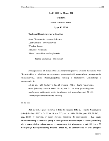 ©Kancelaria Sejmu s. 1/12 Dz.U. 2000 Nr 22 poz. 291 WYROK z dnia 28 marca 2000 r. Sygn. K. 27/99 Trybunał Konstytucyjny w składzie: Jerzy Ciemniewski – przewodniczący Lech Garlicki – sprawozdawca Wiesław Johann Krzysztof Kolasiński Biruta Lewaszkiewicz-Petrykowska Joanna Szymczak – protokolant po rozpoznaniu 28 marca 2000 r. na rozprawie sprawy z wniosku Rzecznika Praw Obywatelskich z udziałem umocowanych przedstawicieli uczestników postępowania: wnioskodawcy, Sejmu Rzeczypospolitej Polskiej i Prokuratora Generalnego o stwierdzenie, że: art. 23 ust. 1 pkt 4 ustawy z dnia 26 stycznia 1982 r. – Karta Nauczyciela (tekst jednolity z 1997 r. Dz.U. Nr 56, poz. 357 ze zm.), prowadzący do nierównego traktowania kobiet i mężczyzn jest niezgodny z art. 32 i 33 Konstytucji Rzeczypospolitej Polskiej o r z e k a: Art. 23 ust. 1 pkt 4 ustawy z dnia 26 stycznia 1982 r. – Karta Nauczyciela (tekst jednolity z 1997 r. Dz.U. Nr 56, poz. 357; zm.: z 1998 r. Nr 106, poz. 668, Nr 162, poz. 1118) w zakresie, w jakim stwarza podstawę do rozwiązania – bez zgody zainteresowanej – stosunku pracy z nauczycielem mianowanym – kobietą wcześniej niż z nauczycielem mianowanym – mężczyzną jest niezgodny z art. 32 i art. 33 Konstytucji Rzeczypospolitej Polskiej przez to, że ustanowione w tym przepisie 05/29/00 2 zróżnicowanie sytuacji prawnej kobiet i mężczyzn przybiera charakter dyskryminacji ze względu na płeć. Uzasadnienie: I 1. Rzecznik Praw Obywatelskich pismem z 20 września 1999 r. wystąpił z wnioskiem do Trybunału Konstytucyjnego o stwierdzenie, że art. 23 ust. 1 pkt 4 ustawy z 26 stycznia 1982 r. – Karta Nauczyciela jest niezgodny z art. 32 i 33 Konstytucji RP. W uzasadnieniu wniosku Rzecznik Praw Obywatelskich podniósł, iż zaskarżony przepis jest przykładem uregulowania z zakresu stosunków pracy, które odsyła do rozwiązań prawnych z dziedziny ubezpieczeń społecznych. Normatywną konsekwencją takiego odesłania w niniejszej sprawie jest to, że stosunek pracy z nauczycielem mianowanym – kobietą ulega rozwiązaniu z mocy prawa o pięć lat wcześniej niż z nauczycielem mianowanym – mężczyzną. Pracodawca może również o ten sam okres wcześniej rozwiązać stosunek pracy z kobietą zatrudnioną na podstawie umowy o pracę zawartej na czas nieokreślony. Zgodnie bowiem z art. 24 ust. 1 ustawy z dnia 17 grudnia 1998 r. o emeryturach i rentach z Funduszu Ubezpieczeń Społecznych (Dz.U. Nr 162, poz. 1118 ze zm.) prawodawca zróżnicował wiek emerytalny kobiet i mężczyzn, ustalając granicę tego wieku odpowiednio na 60 i 65 lat. Zdaniem wnioskodawcy powyższy stan prawny jest niezgodny z art. 32 konstytucji. Zasada równości odnosi się w szczególności do praw kobiet i mężczyzn, co znajduje dodatkowy wyraz w treści art. 33 konstytucji. Z obu tych przepisów wynika, że ustawodawca podmioty praw i obowiązków, które charakteryzują się tą samą istotną cechą (relewantną), powinien traktować równo. Do takich rozwiązań prawnych ustawodawcę dodatkowo obliguje art. 2 konstytucji, który statuuje zasadę sprawiedliwości społecznej, która nakazuje równe traktowanie kobiet i mężczyzn. W przekonaniu wnioskodawcy za cechę relewantną – która w świetle powołanych zasad konstytucji uzasadniałaby zróżnicowanie w prawach i obowiązkach kobiet i mężczyzn – nie może być uznana na płaszczyźnie pracowniczej przynależność do jednej bądź drugiej płci. Powołując się na wypowiedzi orzecznicze Trybunału Konstytucyjnego wnioskodawca zauważył, że o pięć lat krótszy wiek emerytalny kobiet skraca o taki sam 3 okres ich szanse zawodowe. Takiego zaś ograniczenia szans zawodowych nie uzasadniają biologiczne i społeczne różnice kobiet w stosunku do mężczyzn, a w konsekwencji ograniczenie to pozostaje w drastycznej kolizji z powołanymi wzorcami konstytucyjnymi. Rzecznik Praw Obywatelskich zauważył nadto, iż powyższe zróżnicowanie jest także niedopuszczalne w świetle wiążących Polskę aktów prawa międzynarodowego, w tym przede wszystkim z art. 11 Konwencji Narodów Zjednoczonych z 18 grudnia 1979 r. w sprawie likwidacji wszelkich form dyskryminacji kobiet, który gwarantuje kobietom m.in. takie same możliwości zatrudnienia, w tym przestrzeganie równych kryteriów doboru podczas zatrudniania. Również przepisy art. 68 i 69 Układu Europejskiego ustanawiającego stowarzyszenie między Rzecząpospolitą a Wspólnotami Europejskimi i ich Państwami Członkowskimi z 16 grudnia 1991 r., nałożyły na Polskę obowiązek dostosowywania polskiego ustawodawstwa w zakresie ochrony pracownika w miejscu pracy do standardów prawnych Wspólnot. Wśród tych ostatnich doniosłą rolę odgrywa art. 119 Traktatu Rzymskiego, na podstawie którego wydano dyrektywę nr 207/1976 r. z 9 lutego 1976 r. w sprawie urzeczywistniania zasad równego traktowania mężczyzn i kobiet w zakresie dostępu do zatrudnienia, kształcenia zawodowego i awansu zawodowego oraz w zakresie warunków pracy. Z art. 5 tej dyrektywy wynika, iż zróżnicowany wiek emerytalny dla kobiet i mężczyzn „stanowi dyskryminację ze względu na płeć, niezgodną z dyrektywą”. W podsumowaniu wniosku Rzecznik Praw Obywatelskich podkreślił, iż niezgodności z konstytucją zaskarżonego art. 23 ust. 1 pkt 4 ustawy – Karta Nauczyciela nie podważa fakt, że ustawodawca stworzył emerytom – kobietom po osiągnięciu wieku emerytalnego możliwość kontynuowania zatrudnienia. Dotychczasowy pracodawca nie musi bowiem nawiązać z takim pracownikiem zatrudnienia. Z tego też powodu zakwestionowana regulacja skraca długość kariery zawodowej nauczyciela – kobiety w porównaniu do nauczyciela – mężczyzny i prowadzi do niedopuszczalnego w świetle konstytucji zróżnicowania ich szans zawodowych. 2. Pismem z 20 listopada 1999 r. stanowisko w sprawie zajął Prokurator Generalny, który w całości podzielił argumenty wnioskodawcy. P