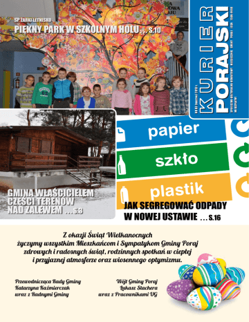 NR 03 (marzec) 2013 r. piękny park w szkolnym holu . . . s.10 SPOŁECZNO-KULTURALNO-OŚWIATOWY MIESIĘCZNIK GMINY PORA J ISSN 1506-9699 NR BEZPŁATNY SP. Żarki Letnisko papier Gmina właścicielem części terenów nad zalewem . . . s.3 plastik jak segregować odpady w nowej ustawie . . . s.16 Z okazji Świąt Wielkanocnych życzymy wszystkim Mieszkańcom i Sympatykom Gminy Poraj zdrowych i radosnych świąt, rodzinnych spotkań w ciepłej i przyjaznej atmosferze oraz wiosennego optymizmu. Przewodnicząca Rady Gminy Katarzyna Kaźmierczak wraz z Radnymi Gminy Wójt Gminy Poraj Łukasz Stachera wraz z Pracownikami UG Nr1 1 /2 0 1 2 Ku rier Pora jski 1 informacje Będzie się działo – kalendarium kwiecień Urząd Gminy Poraj, Gminny Ośrodek Kultury im . J.Gniatkowskiego, Referat Promocji UG oraz organizacje pozarządowe zadbały aby kwiecień był atrakcyjny. 22.3 – 23.4 - Wystawa malarstwa Klaudii Zalegi „Chodź, zapomnij się na chwilę”; Galeria GOK w Poraju; 20.4 – Jubileusz 65- lecia KGW „Choronianki”; remiza OSP w Choroniu; 19.4 godz. 12 – spotkanie z żeglarzem Piotrem Kuźniarem (organizator Yacht Clubu Zefir Drakkar 27.4 - „Bal Mecenasa Kultury” 6/7.4 (g. 17.00) - mecz Polonia Poraj – Warta Kamieńskie Młyny; Przekaż 1% ze swojego podatku Na terenie Gminy Poraj działają Organizacje Pożytku Publicznego, którym mogą Państwo przekazać jeden procent swojego podatku. Dzięki przekazaniu tych środków organizacje mogą prowadzić działalność na rzecz mieszkańców naszej gminy. Aktualny wykaz organizacji pożytku publicznego uprawnionych do otrzymania 1% podatku dochodowego od osób fizycznych za rok 2012 wraz z rachunkami bankowymi, rokrocznie publikuje Departament Pożytku Publicznego Ministerstwa Pracy i Polityki Społecznej. Z terenu Gminy Poraj w wykazie MPiPS znajdują się: KRS 0000298334 TOWARZYSTWO PRZYJACIÓŁ ŻAREK LETNISKA IM. HRABINY STEFANII RACZYŃSKIEJ 13/14.4 (g. 17.00) – mecz Znicz Kłobuck - Polonia Poraj; 20/21.4 (g. 17.00) – mecz Polonia Poraj – Pogoń Kamyk; 27/28.4 (g.17.00) – mecz Unia Kalety - Polonia Poraj; 14.4 (g.10.00 – 14.00) – III Jurajski Puchar Nordic Walking w Masłońskim; 21.4 (g.9.00) – Rejonowe Zawody Strzeleckie o Puchar Wójta Gminy Poraj (Miejska Strzelnica w Myszkowie). Nr konta 33827900000123278920010001 KRS 0000036754 STOWARZYSZENIE ROZWOJU WSI MASŁOŃSKIE Nr konta 59105011681000002253335760 KRS 0000222551 FUNDACJA „PORAJ” Nr konta 53105011681000002290421102 Zbiórka elektrośmieci – 12 kwietnia Ci z mieszkańców, którzy nie dostarczyli z różnych względów elektrośmieci odbieranych w trakcie tegorocznych akcji organizowanych przez Urząd Gminy mogą skorzystać z dodatkowej szansy na wywóz śmieci elektronicznych. Prosimy mieszkańców o dostarczenie do wyznaczonych punktów odpadów: zużyte telewizory, pralki, lodówki, komputery, telefony oraz inną zużytą elektronikę (obowiązują dotychczasowe punkty odbioru). Sprzęt należy wystawić do godz. 8.00. Przyszła wiosna, ruszają gminne inwestycje Szanowni Państwo, Nadeszła długo oczekiwana przez wszystkich wiosna. Czekał na nią każdy z nas. Był jednak ktoś kto czekał z niecierpliwością - to wykonawcy gminnych inwestycji. Stopnienie śniegu i nadejście cieplejszych, wiosennych dni przyniosły zdecydowane ożywienie na placach budów gminnych inwestycji. Urząd Gminy pracować będzie pełną parą, a zaplanowane inwestycje wchodzą w ostrą fazę realizacji. W tym główne zadania inwestycyjne: Kontynuacja modernizacji drogi wojewódzkiej DW 791 w Poraju wraz z budową ścieżek pieszo-rowerowych (ze środków Urzędu Marszałkowskiego – inwestor WZD w Katowicach); Budowa oczyszczalni dla Masłońskiego i Żarek Letniska; Budowa sieci kanalizacyjnej w Jastrzębiu - II etap; Budowa kanalizacji w Żarkach Letnisku i Masłońskim - I etap; Budowa Przedszkola w Żarkach Letnisku; Zagospodarowanie infrastruktury wokół kompleksu sportowego „Moje boisko Orlik 2012” w Poraju; Przebudowa i modernizacja Kina „Bajka” w Poraju; 2 Kurier Pora js ki Nr 03/ 2 0 1 3 Termomodernizacja budynku Szkoły Podstawowej w Poraju; Termomodernizacja budynku Gminnego Ośrodka Zdrowia w Poraju; Budowa nawierzchni, chodników, oświetlenia ulicznego i kontynuacja prac związanych z odwodnieniem gminy Intensywne działania w obszarze: oświaty, pomocy społecznej, służby zdrowia, ekologii, bezpieczeństwa publicznego, promocji, kultury, kultury fizycznej i sportu oraz ładu przestrzennego. Oczywiście realizowanych zadań inwestycyjnych będzie dużo więcej. W tym wydaniu „Kuriera” zwracamy uwagę na realizację najważniejszych z nich. Jednocześnie przepraszamy Państwa za wszelkie utrudnienia, które będą związane z realizacją inwestycji, w tym głównie inwestycji drogowych. Katarzyna Kaźmierczak Przewodnicząca Rady Gminy Poraj wraz z Radnymi Łukasz Stachera Wójt Gminy Poraj informacje Gmina właścicielem części terenów nad Zalewem W częstochowskiej siedzibie Regionalnego Funduszu Gospodarczego S.A., odbył się ustny przetarg, w wyniku którego Gmina Poraj nabyła prawa wieczystego użytkowania części działek oraz prawa własności znajdujących się na nich budynków. Chodzi o tereny, na których mieszczą się obecnie ośrodki wodne. Jedną z działek nabył prywatny przedsiębiorca. „To historyczny moment dla Gminy Poraj. Pierwszy krok na drodze do przejęcia większości terenów przy Zalewie. Ich pozyskanie to bardzo ważny krok w realizacji planów inwestycyjnych i rozwojowych gminy” - podkreśla wójt Łukasz Stachera. Przed kilkoma laty nieudane okazały się próby przejęcia budynków od Huty przez poprzednie władze gminy. Przez ostatnich kilkanaście lat teren dzierżawiony był przez środowisko żeglarskie, którego przedstawiciele z uwagi na brak dostatecznych środków finansowych i nie posiadając praw własności terenu, ponosili tylko niewielkie nakłady służące do bieżąceg