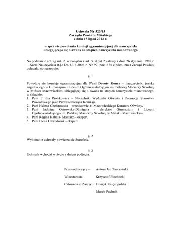 Uchwała Nr 523/13 Zarządu Powiatu Mińskiego z dnia 15 lipca 2013 r. w sprawie powołania komisji egzaminacyjnej dla nauczyciela ubiegającego się o awans na stopień nauczyciela mianowanego Na podstawie art. 9g ust. 2 w związku z art. 91d pkt 2 ustawy z dnia 26 stycznia 1982 r. – Karta Nauczyciela (t.j.: Dz. U. z 2006 r. Nr 97, poz. 674 z późn. zm.) Zarząd Powiatu uchwala, co następuje: §1 Powołuje się komisję egzaminacyjną dla Pani Doroty Konca – nauczycielki języka angielskiego w Gimnazjum i Liceum Ogólnokształcącym im. Polskiej Macierzy Szkolnej w Mińsku Mazowieckim, ubiegającej się o awans na stopień nauczyciela mianowanego, w składzie: 1. Pani Emilia Piotrkowicz – Naczelnik Wydziału Oświaty i Promocji Starostwa Powiatowego jako Przewodnicząca Komisji, 2. Pani Helena Chełstowska – przedstawiciel Mazowieckiego Kuratora Oświaty, 3. Pani Jadwiga Ostrowska-Dźwigała - dyrektor Gimnazjum i Liceum Ogólnokształcącego im. Polskiej Macierzy Szkolnej w Mińsku Mazowieckim, 4. Pani Regina Kabala- Maziarz – ekspert, 5. Pani Elena Chwedoruk - ekspert. §2 Wykonanie uchwały powierza się Staroście. §3 Uchwała wchodzi w Ŝycie z dniem podjęcia. Przewodniczący – Antoni Jan Tarczyński Wicestarosta - Krzysztof Płochocki Członkowie Zarządu: Henryk KsięŜopolski Marek Pachnik