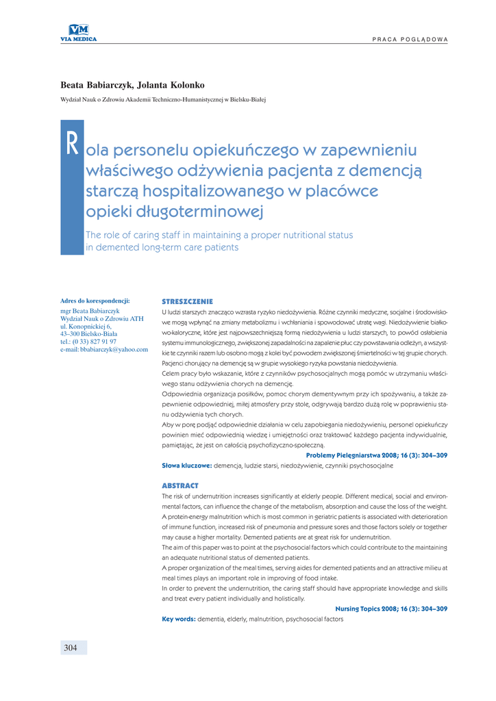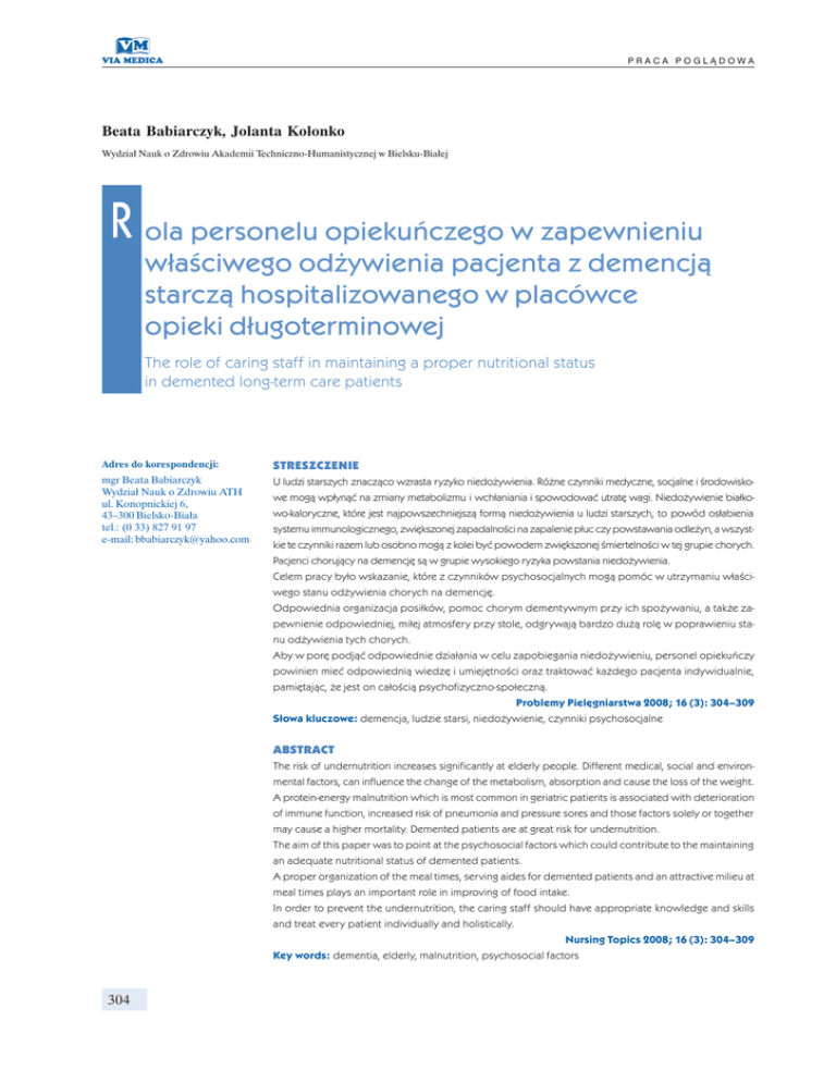 PRACA POGLĄDOWA Beata Babiarczyk, Jolanta Kolonko Wydział Nauk o Zdrowiu Akademii Techniczno-Humanistycznej w Bielsku-Białej R ola personelu opiekuńczego w zapewnieniu właściwego odżywienia pacjenta z demencją starczą hospitalizowanego w placówce opieki długoterminowej The role of caring staff in maintaining a proper nutritional status in demented long-term care patients Adres do korespondencji: STRESZCZENIE mgr Beata Babiarczyk Wydział Nauk o Zdrowiu ATH ul. Konopnickiej 6, 43–300 Bielsko-Biała tel.: (0 33) 827 91 97 e-mail: [email protected] U ludzi starszych znacząco wzrasta ryzyko niedożywienia. Różne czynniki medyczne, socjalne i środowiskowe mogą wpłynąć na zmiany metabolizmu i wchłaniania i spowodować utratę wagi. Niedożywienie białkowo-kaloryczne, które jest najpowszechniejszą formą niedożywienia u ludzi starszych, to powód osłabienia systemu immunologicznego, zwiększonej zapadalności na zapalenie płuc czy powstawania odleżyn, a wszystkie te czynniki razem lub osobno mogą z kolei być powodem zwiększonej śmiertelności w tej grupie chorych. Pacjenci chorujący na demencję są w grupie wysokiego ryzyka powstania niedożywienia. Celem pracy było wskazanie, które z czynników psychosocjalnych mogą pomóc w utrzymaniu właściwego stanu odżywienia chorych na demencję. Odpowiednia organizacja posiłków, pomoc chorym dementywnym przy ich spożywaniu, a także zapewnienie odpowiedniej, miłej atmosfery przy stole, odgrywają bardzo dużą rolę w poprawieniu stanu odżywienia tych chorych. Aby w porę podjąć odpowiednie działania w celu zapobiegania niedożywieniu, personel opiekuńczy powinien mieć odpowiednią wiedzę i umiejętności oraz traktować każdego pacjenta indywidualnie, pamiętając, że jest on całością psychofizyczno-społeczną. Problemy Pielęgniarstwa 2008; 16 (3): 304–309 Słowa kluczowe: demencja, ludzie starsi, niedożywienie, czynniki psychosocjalne ABSTRACT The risk of undernutrition increases significantly at elderly people. Different medical, social and environmental factors, can influence the change of the metabolism, absorption and cause the loss of the weight. A protein-energy malnutrition which is most common in geriatric patients is associated with deterioration of immune function, increased risk of pneumonia and pressure sores and those factors solely or together may cause a higher mortality. Demented patients are at great risk for undernutrition. The aim of this paper was to point at the psychosocial factors which could contribute to the maintaining an adequate nutritional status of demented patients. A proper organization of the meal times, serving aides for demented patients and an attractive milieu at meal times plays an important role in improving of food intake. In order to prevent the undernutrition, the caring staff should have appropriate knowledge and skills and treat every patient individually and holistically. Nursing Topics 2008; 16 (3): 304–309 Key words: dementia, elderly, malnutrition, psychosocial factors 304 Beata Babiarczyk, Jolanta Kolonko, Rola personelu opiekuńczego w zapewnieniu właściwego odżywienia pacjenta z demencją starczą Wstęp Coraz więcej pacjentów hospitalizowanych w placówkach opieki długoterminowej to ludzie cierpiący na różne formy demencji starczej. Ludzie starsi jedzą generalnie mniej niż zdrowi dorośli ludzie, a jeśli dodatkowo cierpią na demencję, to cały skomplikowany proces spożywania pokarmu, a przez to dostarczania składników odżywczych, jest ekstremalnie zaburzony. Konsekwencje niedożywienia w wieku starszym są znaczne i obejmują między innymi zwiększone ryzyko złamań szyjki kości udowej, skłonność do zapadania na zapalenie płuc, występowania odleżyn czy trudnego gojenia się ran, a wszystkie te czynniki razem lub osobno prowadzą do zwiększonej śmiertelności [1–3]. Cel pracy Celem niniejszej pracy jest wskazanie na demencję starczą jako jedną z głównych przyczyn zaburzeń odżywiania i zaproponowanie rozwiązań poprawiających jakość opieki i zapobiegających niedożywieniu tej grupy osób. Termin „niedożywienie” większości kojarzy się z głodującymi krajami Trzeciego Świata, podczas gdy coraz częściej wskazuje się na występowanie tego zjawiska wśród starszych ludzi w krajach także wysoko rozwiniętych. W Polsce jest wciąż jeszcze zbyt mało danych na temat niedożywienia w tej grupie ludzi, ale dane międzynarodowe są niepokojące [1, 2, 4–6]. Niedożywienie może według wielu autorów dotyczyć nawet 50% ludzi starszych leczonych na oddziałach opieki krótkoterminowej i znacznie więcej, bo aż do 85% chorych objętych opieką długoterminową. Zaskakującym wydaje się być fakt, że to właśnie w instytucjach opiekuńczych, zapewniających przecież regularne i prawidłowo skomponowane posiłki, wielu pacjentów jest faktycznie niedożywionych [1, 4–6]. U starszych chorych najczęstszą postacią niedożywienia jest typ białkowo-kaloryczny. Jest ono spowodowane niedostateczną podażą, złym wchłanianiem się składników odżywczych lub ich nadmiernym zużyciem. Postacią niedożywienia białkowo-kalorycznego jest uwiąd (marasmus) i kwashiorkor [7–9]. Uwiąd jest wyniszczeniem, w przebiegu którego dochodzi do zmniejszenia masy mięśniowej i rezerw tłuszczu w ustroju, ale zawartość białka w narządach pozostaje prawidłowa. Ponieważ jednak rezerwa białka jest zmniejszona i procesy homeostazy zaburzone, każdy dodatkowy bodziec metaboliczny (np. zabieg operacyjny, sytuacja stresowa) może doprowadzić do stanu nazywanego „kwashiorkor”, w którym dominuje obraz niedoborów białkowych. Zaburzenia odżywiania w starszym wieku mogą być spowodowane różnorodnymi czynnikami zewnętrzi wewnątrzpochodnymi. Wiele ostrych i przewlekłych chorób, takich jak nadczynność tarczycy, cukrzyca, nowotwory, zaburzenia wchłaniania, choroby układu sercowo-naczynio