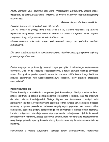 Każdy poranek jest pozornie taki sam. Pospiesznie pokonujemy znaną trasę, wsiadamy do autobusu lub auta i jedziemy do miejsc, w których tego dnia spędzimy dużo czasu. Rutyna nie jest zła, bo porządkuje. Czasem jednak coś może być inne niż zwykle. Gdy na drodze do pracy, którą pokonujesz od lat, właśnie rozpoczął się remont, wybierasz inną trasę. Jeśli autobus numer 13 uciekł Ci sprzed nosa, szybko znajdziesz inny, który również dowiezie Cię do celu. Nieprzewidziane zdarzenia mogą pokrzyżować plany, ale potrafisz znaleźć rozwiązanie. Dla osób z zaburzeniami ze spektrum autyzmu niewiele znacząca sprawa staje się poważnym problemem. Osoby autystyczne potrzebują wewnętrznego porządku i dokładnego zaplanowania czynności. Daje im to poczucie bezpieczeństwa, a także pozwala uniknąć zbytniego stresu. Porządek w pewien sposób ułatwia też chorym odbiór świata i jego bodźców, pozwala zapanować nad wszechogarniającym chaosem, który przynosi otaczająca rzeczywistość. Komunikowanie się Ważną kwestią w kontaktach z autyzmem jest komunikacja. Osoby z zaburzeniami z tego spektrum są czasem ponadprzeciętnie inteligentne i dojrzałe. Mają też stosowną do wieku wiedzę i umiejętności. Dlatego błędem jest traktowanie dorosłych ludzi z autyzmem jak dzieci. Problematyczna pozostaje jednak kwestia tzw. skojarzeń. Podczas rozmowy w głowie posiadacza zaburzeń autystycznych pojawiają się bowiem różne skojarzenia, czasem z pozoru bardzo odległe od pierwotnego i stałego tematu rozmowy. Ludzie z autyzmem potrzebują zatem doprecyzowania, pełniejszego objaśniania kwestii poruszanych w rozmowie, zadają dodatkowe pytania, które nie oznaczają niezrozumienia, a wynikają z potrzeby uporządkowania wiedzy i przekonania się, że dobrze zrozumiało się rozmowę. Komunikacja z osobą autystyczną wymaga zatem zaangażowania, cierpliwości i wyrozumiałości. Powinniśmy pamiętać o zadawaniu pytań, aby upewnić się, że w pełni zrozumieliśmy autystycznego rozmówcę. Życie za mgłą Autyzm to także pewne nieprawidłowości w sferze zmysłów. Osoby z zaburzeniem z tego spektrum są bardzo wrażliwe na bodźce zewnętrzne, często mają problemy z dotykiem (czują obciążenie mięśni, utrudnienia przy pracach manualnych), czasem też widzą nieostro i w sposób rozmyty. Każda osoba autystyczna jest jednak inna, może mieć różne objawy. Zachowania, które zaobserwujemy u jednej osoby z autyzmem, mogą nie występować u innej. Jest to świat różnych planet, a na każdej z nich jest konkretny człowiek ze swoimi indywidualnymi problemami, sukcesami, marzeniami. Przekonaliśmy się o tym podczas warsztatów z osobami autystycznymi. Staraliśmy się poznać tę chorobę, by przygotować się do stworzenia tej książki. Dwa światy – wspólny świat Wszyscy żyjemy w tym samym świecie – chociaż czasem się różnimy… W erze rozkwitu nowych mediów i ogromnego tempa życia wszyscy doświadczamy chaosu, nadmiaru bodźców, mamy problemy z odpowiednim odbiorem rzeczywistości. W kontakcie z autyzmem nie chodzi o poznanie odrębnych światów, a o zrozumienie drugiego człowieka. Temu właśnie służy ta książka – ma być pomocą w poznaniu i zrozumieniu osób z zaburzeniem ze spektrum autyzmu. Ma skruszyć lody oraz zburzyć mury lęku. Doczytać W Lublinie ma swój oddział Krajowe Towarzystwo Autyzmu (ul. Droga Męczenników Majdanka 20). Podczas warsztatów przygotowujących nas do napisania książki spotykaliśmy się z pracownikami tej placówki. Dodatkowe informacje na temat działalności KTA można znaleźć na stronie: www.kta.lublin.pl Scenariusz1 Czas trwania: 1,5 godz. Cel: przybliżenie uczestnikom świata osób autystycznych oraz uwrażliwienie na ich problemy. Metody pracy: aktywizujące, działania plastyczne. Materiały potrzebne do przeprowadzenia zajęć: książka „Codzień” włóczka taśma izolacyjna lub papierowa okulary zniekształcające widzenie (np. okulary do czytania) zimowe rękawice obciążniki na ręce lub coś utrudniającego ruchy rąk (np. woreczki wypełnione grochem) lista zniekształconych numerów telefonów [załącznik nr 1] obrazki z załącznika [załącznik nr 2] szary papier nożyczki klej sznurek spinacze mazaki, markery Przebieg zajęć: „Pajęczyna” – działanie integracyjne, wprowadzające w tematykę zajęć Uczniowie stoją w kole. Każdy uczestnik ma za zadanie zakończyć zdania: Gdy jestem w grupie wielu osób… Gdy poznaję kogoś nowego… Gdy jestem zestresowany... Rozpoczyna osoba, która w danej chwili trzyma w ręce włóczkę. Następnie przekazuje motek kolejnej osobie, jednocześnie trzymając nitkę. W ten sposób między uczestnikami powstaje symboliczna pajęcza nić. 1 Scenariusz nawiązuje do pierwszej części broszury. Ćwiczenie ma celu pokazanie, że każdy z nas odbiera świat inaczej. Prowadzący pyta uczestników o doświadczenia związane z autyzmem. Pokazuje książkę „Codzień”, przedstawia historię jej powstania (książka jest wynikiem spotkań artystów z osobami z autyzmem), wyjaśnia cel warsztatu – czyli uwrażliwienie na niepełnosprawność oraz przybliżenie schorzenia, jakim jest autyzm. Ćwiczenie ma na celu zwrócenie uwagi na sposób odbioru osób autystycznych przez społeczeństwo oraz spowodowane brakiem wiedzy stereotypy na temat autyzmu. Książka „Codzień” Prowadzący rozpoczyna czytanie książki. Czytanie przerywane jest działaniami, które mają pomóc uczestnikom w zrozumieniu problemu podejmowanego w publikacji. Kiedy koniec? Zaczyna się dzień Codzień będzie trudno za bardzo za bardzo za mocne za mocno za dużo za dużo za głośne za głośno chowam się wtedy przed światem tu jest bezpiecznie. „Rój pszczół” Prowadzący wyznacza taśmą pole „bezpiecznego kokonu”. Jedna osoba odgrywa rolę osoby autystycznej, reszta uczestników to symboliczny ,,rój pszczół”. Na znak pr
