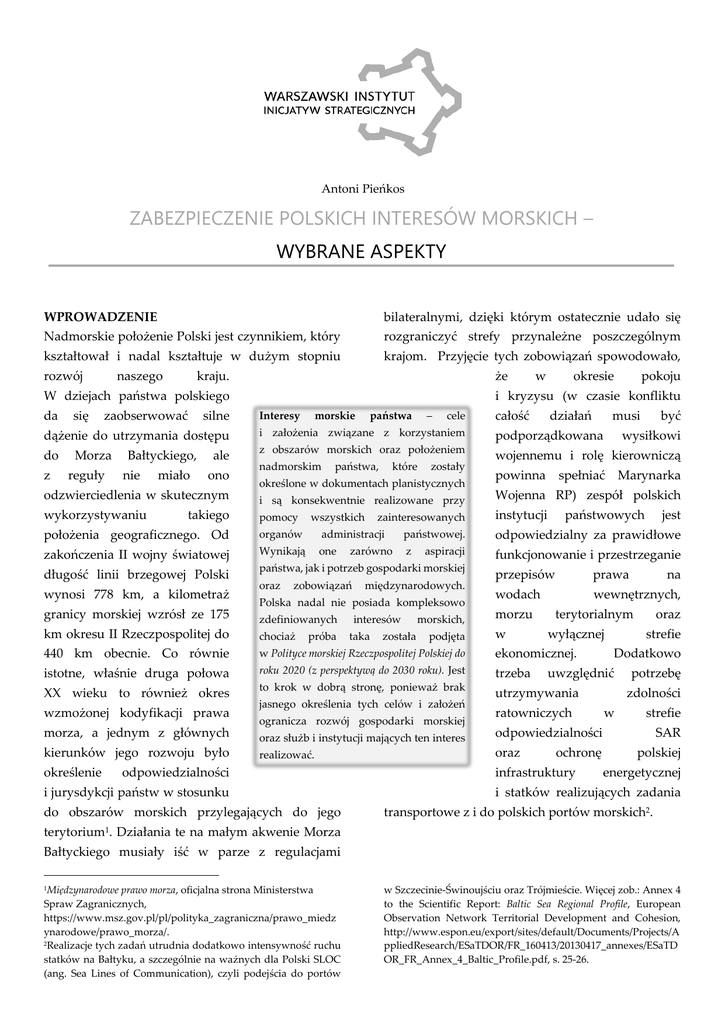 Antoni Pieńkos ZABEZPIECZENIE POLSKICH INTERESÓW MORSKICH – WYBRANE ASPEKTY WPROWADZENIE bilateralnymi, dzięki którym ostatecznie udało się Nadmorskie położenie Polski jest czynnikiem, który rozgraniczyć strefy przynależne poszczególnym kształtował i nadal kształtuje w dużym stopniu krajom. Przyjęcie tych zobowiązań spowodowało, rozwój naszego kraju. że W dziejach państwa polskiego da się zaobserwować silne w okresie pokoju i kryzysu (w czasie konfliktu Interesy morskie państwa – cele całość działań musi być dążenie do utrzymania dostępu i założenia związane z korzystaniem podporządkowana do z obszarów morskich oraz położeniem wojennemu i rolę kierowniczą z Morza reguły Bałtyckiego, nie miało ale ono odzwierciedlenia w skutecznym wykorzystywaniu takiego nadmorskim państwa, które zostały określone w dokumentach planistycznych powinna wysiłkowi spełniać Marynarka i są konsekwentnie realizowane przy Wojenna RP) zespół polskich pomocy instytucji wszystkich zainteresowanych państwowych jest położenia geograficznego. Od organów administracji państwowej. odpowiedzialny za prawidłowe zakończenia II wojny światowej Wynikają one z funkcjonowanie i przestrzeganie długość linii brzegowej Polski państwa, jak i potrzeb gospodarki morskiej wynosi 778 km, a kilometraż granicy morskiej wzrósł ze 175 oraz zarówno zobowiązań aspiracji międzynarodowych. Polska nadal nie posiada kompleksowo zdefiniowanych interesów morskich, przepisów prawa wodach wewnętrznych, morzu chociaż 440 km obecnie. Co równie w Polityce morskiej Rzeczpospolitej Polskiej do ekonomicznej. istotne, właśnie druga połowa roku 2020 (z perspektywą do 2030 roku). Jest trzeba XX wieku to również okres to krok w dobrą stronę, ponieważ brak utrzymywania wzmożonej kodyfikacji prawa morza, a jednym z głównych kierunków jego rozwoju było określenie taka została podjęta jasnego określenia tych celów i założeń ogranicza rozwój gospodarki morskiej w terytorialnym km okresu II Rzeczpospolitej do próba wyłącznej ratowniczych odpowiedzialności realizować. oraz i jurysdykcji państw w stosunku do obszarów morskich przylegających do jego ochronę infrastruktury oraz strefie Dodatkowo uwzględnić oraz służb i instytucji mających ten interes odpowiedzialności na potrzebę zdolności w strefie SAR polskiej energetycznej i statków realizujących zadania transportowe z i do polskich portów morskich2. terytorium1. Działania te na małym akwenie Morza Bałtyckiego musiały iść w parze z regulacjami Międzynarodowe prawo morza, oficjalna strona Ministerstwa Spraw Zagranicznych, https://www.msz.gov.pl/pl/polityka_zagraniczna/prawo_miedz ynarodowe/prawo_morza/. 2Realizacje tych zadań utrudnia dodatkowo intensywność ruchu statków na Bałtyku, a szczególnie na ważnych dla Polski SLOC (ang. Sea Lines of Communication), czyli podejścia do portów 1 w Szczecinie-Świnoujściu oraz Trójmieście. Więcej zob.: Annex 4 to the Scientific Report: Baltic Sea Regional Profile, European Observation Network Territorial Development and Cohesion, http://www.espon.eu/export/sites/default/Documents/Projects/A ppliedResearch/ESaTDOR/FR_160413/20130417_annexes/ESaTD OR_FR_Annex_4_Baltic_Profile.pdf, s. 25-26. ZABEZPIECZENIE POLSKICH INTERESÓW MORSKICH – WYBRANE ASPEKTY Położenie nadmorskie to nie tylko przywilej przeanalizowanie aktów prawnych stanowiących i szansa, ale również obowiązek – jego odpowiednie o wypełnianie jest w stanie przyczynić się do międzynarodowych wzmocnienia prestiżu państwa i jego gospodarki opracowanych (zarówno i regionalnych organizacji międzynarodowych oraz poprzez wymianę handlową, istocie całego systemu, (w na czyli tym forum porozumień powszechnych jak i przemysł stoczniowy i rybołówstwo), ale brak porozumień odpowiedniego struktur prawnych, które w dużym stopniu są również bardzo kształtowane przez ustalenia wynikające z tych państwowych przygotowania może prowadzić do poważanych konsekwencji, ponieważ środowisko 3 morskie jest niezwykle wymagające . bilateralnych umów pierwszych. Podstawową krajowych umową aktów regulującą Znaczenie wyznaczanie polskich obszarów morskich jest gospodarki morskiej dla Polski (a szczególnie dla Konwencja o prawie morza z Montego Bay z 1982 roku, województw pomorskiego, zachodniopomorskiego która w sposób kompleksowy ujęła tą problematykę i warmińsko-mazurskiego) jest bardzo istotne, i stała się podstawą do opracowania polskich ponieważ rozwiązań, w tym przede wszystkim Ustawy gwarantuje możliwość dostarczenia towarów, dywersyfikacji źródeł dostaw surowców o energetycznych oraz daje zatrudnienie dużej liczbie i administracji morskiej z dnia 21 marca 1991 roku4. mieszkańców miast i miejscowości nadmorskich. Zgodnie Z tego powodu potrzeba stworzenia przez instytucje wyznaczyła zasięg wód wewnętrznych (do których państwowe środowiska stabilnego rozwoju urasta zaliczają się przede wszystkim: Zalew Wiślany, do roli kluczowego zadania, a jednym z głównych Zatoka Gdańska oraz Zalew Szczeciński – sama obszarów działania staje się właśnie bezpieczeństwo zatoka to 1216 km2), morza terytorialnego (łączna na morzu, rozumiane tutaj jako zabezpieczenie powierzchnia morza terytorialnego to 8813 km2) oraz polskich obszarów morskich oraz kluczowych wyłącznej strefy ekonomicznej (22 570 km², w tym szlaków do obszar sporny z Danią, czyli około 3500 km2). portów morskich (akwenów o żywotnym znaczeniu W związku z tym całkowita powierzchnia polskich dla Polski). obszarów komunikacyjnych prowadzących obszarach z morskich tymi Rzeczpospolitej aktami morskich to prawnymi 32 599 Polskiej Polska kilometrów 5 kwadratowych . KRAJOWE I MIĘDZYNARODOWE REGULACJE PRAWNE Żeby delimitacji granicy stref ekonomicznych pomiędzy przez Polską i Danią, chociaż prace nad porozumieniem instytucje i organy państwowe