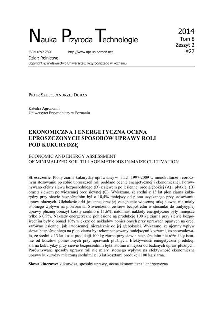 Nauka Przyroda Technologie ISSN 1897-7820 http://www.npt.up-poznan.net 2014 Tom 8 Zeszyt 2 #27 Dział: Rolnictwo Copyright ©Wydawnictwo Uniwersytetu Przyrodniczego w Poznaniu PIOTR SZULC, ANDRZEJ DUBAS Katedra Agronomii Uniwersytet Przyrodniczy w Poznaniu EKONOMICZNA I ENERGETYCZNA OCENA UPROSZCZONYCH SPOSOBÓW UPRAWY ROLI POD KUKURYDZĘ ECONOMIC AND ENERGY ASSESSMENT OF MINIMALIZED SOIL TILLAGE METHODS IN MAIZE CULTIVATION Streszczenie. Plony ziarna kukurydzy uprawianej w latach 1997-2009 w monokulturze i corocznym stosowaniu po sobie uproszczeń roli poddano ocenie energetycznej i ekonomicznej. Porównywano efekty siewu bezpośredniego (D) z siewem po jesiennej orce głębokiej (A) i płytkiej (B) oraz z siewem po wiosennej orce siewnej (C). Wykazano, że średni z 13 lat plon ziarna kukurydzy przy siewie bezpośrednim był o 10,4% mniejszy od plonu uzyskanego przy stosowaniu upraw płużnych. Głębokość orki jesiennej oraz jej zastąpienie wiosenną orką siewną nie miały istotnego wpływu na plon ziarna. Stwierdzono, że siew bezpośredni w stosunku do tradycyjnej uprawy płużnej obniżył koszty średnio o 11,6%, natomiast nakłady energetyczne były mniejsze tylko o 0,9%. Nakłady energetyczne poniesione na produkcję 100 kg ziarna przy siewie bezpośrednim były o ponad 10% większe od nakładów poniesionych przy uprawach opartych na orce, zarówno jesiennej, jak i wiosennej, niezależnie od jej głębokości. Wykazano, że ujemny wpływ siewu bezpośredniego na plon ziarna był rekompensowany mniejszymi kosztami, co spowodowało, że średni z 13 lat koszt produkcji 100 kg ziarna przy siewie bezpośrednim nie różnił się istotnie od kosztów poniesionych przy uprawach płużnych. Efektywność energetyczna produkcji ziarna kukurydzy przy siewie bezpośrednim była istotnie mniejsza od badanych upraw płużnych. Porównywane sposoby uprawy roli nie miały istotnego wpływu na efektywność ekonomiczną uprawy kukurydzy mierzoną średnimi z 13 lat kosztami produkcji 100 kg ziarna. Słowa kluczowe: kukurydza, sposoby uprawy, ocena ekonomiczna i energetyczna 2 Szulc P., Dubas A., 2014. Ekonomiczna i energetyczna ocena uproszczonych sposobów uprawy roli pod kukurydzę. Nauka Przyr. Technol. 8, 2, #27. Wstęp Uprawa kukurydzy wymaga dużych nakładów pracy i energii oraz zaangażowania wielu środków produkcji. Opłacalność ekonomiczna jej produkcji zależy nie tylko od wielkości i wartości rynkowej uzyskiwanych plonów oraz cen środków produkcji, lecz także, a może nawet przede wszystkim, od wysokości nakładów ponoszonych w całym procesie uprawy. Z tych względów we wszystkich elementach jej agrotechniki poszukuje się rozwiązań prowadzących do ograniczenia nakładów, zwłaszcza energetycznych, sprzyjających uzyskaniu większej opłacalności produkcji. Dotyczy to zwłaszcza uprawy roli, która w powszechnie stosowanej agrotechnice kukurydzy jest oparta na orce i licznych mechanicznych zabiegach pielęgnacyjnych, stanowiących od 20 do 40% wszystkich nakładów i kosztów produkcji (GONET 1991, MACHUL i KSIĘŻAK 2007, KRASOWICZ i MACHUL 2008). Uzasadnione są zatem poszukiwania technologii uprawy kukurydzy, w których stosuje się uproszczone i mniej energochłonne sposoby uprawy roli. Początkowo sprowadzały się one do pomijania niektórych mechanicznych zabiegów, jak np. podorywki lub bronowania, do stosowania wielofunkcyjnych agregatów uprawowych, do spłycania orki lub jej zastępowania kultywatorem czy broną talerzową, a ostatnio ograniczano się tylko do siewu bezpośredniego w ściernisko. Bezorkowa uprawa kukurydzy jest już powszechnie stosowana w Stanach Zjednoczonych AP i w niektórych krajach europejskich (PUDEŁKO i WRIGHT 1994). W Polsce jest stosowana tylko w nielicznych gospodarstwach i to w różnych wariantach agrotechnicznych, zależnych od posiadanego sprzętu technicznego, głównie służącego do uprawy roli i siewu bezpośredniego. Jest ona przedmiotem licznych badań naukowych prowadzonych w różnych warunkach środowiskowych i agrotechnicznych (TEBRÜGGE i BÖHRNSEN 2000, CORDES 2001). Badania nad wpływem wieloletniej uprawy kukurydzy w monokulturze i siewu bezpośredniego w ściernisko na zmiany w środowisku glebowym oraz na przebieg wegetacji i plonowanie kukurydzy są prowadzone w Uniwersytecie Przyrodniczym w Poznaniu od 1997 roku. Efekty przyrodnicze stosowanych przez 13 lat różnych sposobów uprawy roli opublikowało Wydawnictwo Uniwersytetu Przyrodniczego w Poznaniu (DUBAS i IN. 2012). Uzyskane w tych badaniach wyniki poddano ocenie ekonomicznej i energetycznej, przedstawiając w pracy energochłonność badanych sposobów uprawy roli oraz ich wpływ na koszty i opłacalność produkcji ziarna kukurydzy. Materiał i metody Ocenie poddano następujące sposoby uprawy roli: A – jesienna orka głęboka (30 cm), wiosną kultywator z wałem strunowym, B – jesienna orka płytka (15 cm), wiosną kultywator z wałem strunowym, C – wiosenna orka siewna (15 cm), kultywator z wałem strunowym, D – uprawa bezorkowa – siew bezpośredni. Stosowane w nich zabiegi agrotechniczne przedstawiono w tabeli 1. Warunki glebowe i meteorologiczne w latach prowadzenia doświadczenia oraz szczegółowy opis badanych sposobów uprawy roli wraz z towarzyszącymi im zabiegami 3 Szulc P., Dubas A., 2014. Ekonomiczna i energetyczna ocena uproszczonych sposobów uprawy roli pod kukurydzę. Nauka Przyr. Technol. 8, 2, #27. Tabela 1. Zabiegi agrotechniczne stosowane w badanych sposobach uprawy roli Table 1. Agrotechnical measures of examined soil tillage methods Obiekty uprawowe – Cultivation objects Zabieg agrotechniczny Agrotechnical measure jesienna orka głęboka autumn deep ploughing (A) Rozdrabniacz resztek pożniwnych Crop residue shredder + Jesienna orka głęboka Autumn deep ploughing + Jesienna orka płytka Autumn shallow ploughing jesienna orka wiosenna orka płytka siewna autumn shallow spring ploughing ploughing (C) (