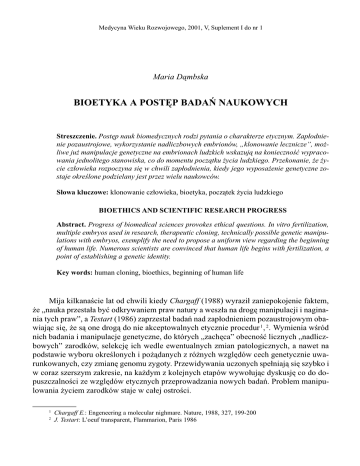 Medycyna Wieku Rozwojowego, 2001, V, Suplement I do nr 1 Maria D¹mbska BIOETYKA A POSTÊP BADAÑ NAUKOWYCH Streszczenie. Postêp nauk biomedycznych rodzi pytania o charakterze etycznym. Zap³odnienie pozaustrojowe, wykorzystanie nadliczbowych embrionów, klonowanie lecznicze, mo¿liwe ju¿ manipulacje genetyczne na embrionach ludzkich wskazuj¹ na koniecznoæ wypracowania jednolitego stanowiska, co do momentu pocz¹tku ¿ycia ludzkiego. Przekonanie, ¿e ¿ycie cz³owieka rozpoczyna siê w chwili zap³odnienia, kiedy jego wyposa¿enie genetyczne zostaje okrelone podzielany jest przez wielu naukowców. S³owa kluczowe: klonowanie cz³owieka, bioetyka, pocz¹tek ¿ycia ludzkiego BIOETHICS AND SCIENTIFIC RESEARCH PROGRESS Abstract. Progress of biomedical sciences provokes ethical questions. In vitro fertilization, multiple embryos used in research, therapeutic cloning, technically possible genetic manipulations with embryos, exemplify the need to propose a uniform view regarding the beginning of human life. Numerous scientists are convinced that human life begins with fertilization, a point of establishing a genetic identity. Key words: human cloning, bioethics, beginning of human life Mija kilkanacie lat od chwili kiedy Chargaff (1988) wyrazi³ zaniepokojenie faktem, ¿e nauka przesta³a byæ odkrywaniem praw natury a wesz³a na drogê manipulacji i naginania tych praw, a Testart (1986) zaprzesta³ badañ nad zap³odnieniem pozaustrojowym obawiaj¹c siê, ¿e s¹ one drog¹ do nie akceptowalnych etycznie procedur 1 , 2. Wymienia wród nich badania i manipulacje genetyczne, do których zachêca obecnoæ licznych nadliczbowych zarodków, selekcjê ich wedle ewentualnych zmian patologicznych, a nawet na podstawie wyboru okrelonych i po¿¹danych z ró¿nych wzglêdów cech genetycznie uwarunkowanych, czy zmianê genomu zygoty. Przewidywania uczonych spe³niaj¹ siê szybko i w coraz szerszym zakresie, na ka¿dym z kolejnych etapów wywo³uj¹c dyskusjê co do dopuszczalnoci ze wzglêdów etycznych przeprowadzania nowych badañ. Problem manipulowania ¿yciem zarodków staje w ca³ej ostroci. 1 2 Chargaff E.: Engeneering a molecular nighmare. Nature, 1988, 327, 199-200 J. Testart: Loeuf transparent, Flammarion, Paris 1986 Maria D¹mbska 46 Niedawno prze¿ylimy prawdziwy wstrz¹s wobec zbli¿enia siê mo¿liwoci klonowania cz³owieka czyli reprodukowania go jako jednostki biologicznej genetycznie identycznej z t¹, od której pochodzi, w wyniku przeniesienia j¹dra komórki somatycznej do pozbawionej j¹dra komórki jajowej. Szczêliwie procedury prowadz¹ce do klonowania cz³owieka zosta³y powszechnie odrzucone, co zosta³o jednoznacznie sformu³owane w aneksie do konwencji o ochronie praw cz³owieka i godnoci istoty ludzkiej wydanym przez pañstwa cz³onkowskie Rady Europy oraz niektóre inne pañstwa. Klonowanie mog³oby jednak mieæ za cel poza kreowaniem nowych osobników równie¿ uzyskiwanie okrelonych tkanek b¹d linii komórkowych dla celów dowiadczalnych b¹d leczniczych. Wi¹¿e siê to z zagadnieniem wywo³uj¹cym szczególne zainteresowanie, budz¹cym nadziejê, co do mo¿liwoci leczniczych, a jednoczenie stwarzaj¹cym problemy natury etycznej czyli ze spraw¹ komórek macierzystych (stem cells). S¹ to niezró¿nicowane jeszcze komórki, które zarówno w hodowli, jak po wszczepieniu do organizmu mog¹ rozwijaæ siê w kierunku ró¿nych typów tkanek. W tej sytuacji spojrzenia badaj¹cych zwracaj¹ siê w kierunku komórek macierzystych pochodz¹cych z wêz³ów zarodkowych wczesnego zarodka ludzkiego. Materia³em niejako predysponowanym do badañ i dalszego wykorzystania wydaj¹ siê nadliczbowe zarodki powsta³e przy zap³odnieniu pozaustrojowym, skazane dot¹d na zag³adê. Pamiêtamy, ¿e zniszczenie ich wielkiej liczby w Wielkiej Brytanii odbi³o siê echem poza jej granicami. Komórki macierzyste uzyskane przez klonowanie by³yby szczególnie cenne, bo ich zastosowanie pozwoli³oby unikn¹æ ryzyka odrzucenia przeszczepu. Jak wiêc odpowiedzieæ na tak¹ propozycjê? Otrzymywanie zarodków ludzkich dla produkowania komórek macierzystych nie jest zgodne ze stanowiskiem Europejskiej Konwencji Praw Cz³owieka i Biomedycyny. Pytanie bywa wiêc formu³owane nastêpuj¹co: czy pobieranie komórek macierzystych z zarodków ludzkich mo¿e byæ w ogóle dozwolone? Rozstrzyganie tego problemu w ró¿nych krajach nie jest jednakowe. Wielka Brytania jest jednym z nielicznych, gdzie tworzenie zarodków dla celów badawczych jest akceptowane. Europejski Komitet Etyki uzna³ jedynie, ¿e tego typu postêpowanie dla badañ nad terapi¹ z u¿yciem komórek macierzystych jest przedwczesne 3. Komórki macierzyste w niewielkiej liczbie znajduj¹ siê tak¿e w ju¿ wykszta³conych tkankach np. miêniowej, nerwowej czy w szpiku kostnym. Komórki macierzyste szpiku s¹ ju¿ izolowane z krwi obwodowej i stosowane na drodze przeszczepiania np. w leczeniu bia³aczek. Dalsze mo¿liwoci zastosowania komórek macierzystych w chorobach prowadz¹cych do uszkodzenia lub zwyrodnienia komórek np. w uk³adzie nerwowym wymagaj¹ d³ugich jeszcze badañ. Niestety, wydaje siê, ¿e pobrane od doros³ych osobników komórki wykazuj¹ tendencjê do zbyt szybkiego starzenia. Kontrowersje co do u¿ycia komórek macierzystych z zarodków kieruj¹ jednak ku badaniom nad pozyskaniem ich z dojrza³ych tkanek 4 . Mimo zastrze¿eñ co do ich wydolnoci mo¿emy liczyæ na dalsze postêpy badawcze m.in. wspomnieæ tu nale¿y równie¿ o próbie pozyskiwania materia³u z poronionych p³odów. 3 4 Dickson D.: European panel rejects eration of human embryos for research, Nature: 408, 277 (2000) Ethies can boost science, Nature: 408, 275 (2000) Bioetyka a postêp badañ naukowych 47 Pozwoli³am sobie na przypomnienie aktualnie powstaj¹cych problemów zwi¹zanych z u¿ytkowaniem do badañ i ewentualnych prób terapeutycznych komórek macierzystych z tworzonych pozaustrojowo zarodków ludzkich. Mo¿na przewidzieæ, ¿e przy d