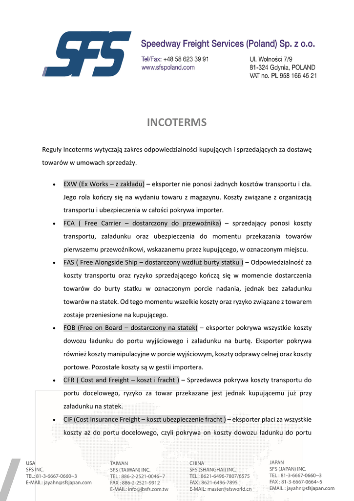 INCOTERMS Reguły Incoterms wytyczają zakres odpowiedzialności kupujących i sprzedających za dostawę towarów w umowach sprzedaży. EXW (Ex Works – z zakładu) – eksporter nie ponosi żadnych kosztów transportu i cła. Jego rola kończy się na wydaniu towaru z magazynu. Koszty związane z organizacją transportu i ubezpieczenia w całości pokrywa importer. FCA ( Free Carrier – dostarczony do przewoźnika) – sprzedający ponosi koszty transportu, załadunku oraz ubezpieczenia do momentu przekazania towarów pierwszemu przewoźnikowi, wskazanemu przez kupującego, w oznaczonym miejscu. FAS ( Free Alongside Ship – dostarczony wzdłuż burty statku ) – Odpowiedzialność za koszty transportu oraz ryzyko sprzedającego kończą się w momencie dostarczenia towarów do burty statku w oznaczonym porcie nadania, jednak bez załadunku towarów na statek. Od tego momentu wszelkie koszty oraz ryzyko związane z towarem zostaje przeniesione na kupującego. FOB (Free on Board – dostarczony na statek) – eksporter pokrywa wszystkie koszty dowozu ładunku do portu wyjściowego i załadunku na burtę. Eksporter pokrywa również koszty manipulacyjne w porcie wyjściowym, koszty odprawy celnej oraz koszty portowe. Pozostałe koszty są w gestii importera. CFR ( Cost and Freight – koszt i fracht ) – Sprzedawca pokrywa koszty transportu do portu docelowego, ryzyko za towar przekazane jest jednak kupującemu już przy załadunku na statek. CIF (Cost Insurance Freight – koszt ubezpieczenie fracht ) – eksporter płaci za wszystkie koszty aż do portu docelowego, czyli pokrywa on koszty dowozu ładunku do portu wyjściowego i załadunku na burtę, koszty manipulacyjne w porcie wyjściowym, koszty odprawy celnej oraz koszty portowe, a także koszty transportu i ubezpieczenia. CPT ( Carriage paid to – przewóz opłacony do ) – Przewoźne opłacone do (… określonego miejsca przeznaczenia). Odpowiednik CFR w transporcie innym, niż morskim i wodnym śródlądowym (w tym multimodalnym) CIP ( Carriage and Insurance paid to – przewóz i ubezpieczenie opłacone do) DDU (Delivery Duty Unpaid – dostarczone cło nieopłacone ) – eksporter pokrywa wszystkie koszty transportu „od drzwi do drzwi” czyli miejsca wyjazdu towaru po dostarczenie go do punktu wskazanego przez importera. Wyjątkiem są koszty odprawy celnej i cła, które zobowiązany jest pokryć importer. DDP (Delivery Duty Paid – dostarczone cło opłacone ) – eksporter pokrywa wszystkie koszty transportu i cła. Importer praktycznie nie ponosi żadnych kosztów związanych z dostarczeniem towaru. RODZAJE KONTENERÓW Dry Van (DV) – kontener uniwersalny ogólnego przeznaczenia High Cube (HC) – kontener o podwyższonej wysokości High Cube PalletWide (HCPW) – kontener o podwyższonej wysokości i szerokości kontener o kontrolowanej temperaturze – do przewozu ładunków w temperaturze od –25 °C do +25 °C Reefer (RF) – kontener chłodniczy Open Top (OT) – kontener z otwartym dachem Open Side (OS) – kontener o bokach otwartych Flat Rack (FR) – kontener z otwartym dachem i bokiem SŁOWNIK POJĘĆ SPEDYCYJNYCH o Spedytor – firma zajmująca się, w imieniu załadowcy bądź odbiorcy towaru, przewozem ładunków oraz wszelkimi formalnościami z tym związanymi o FCL – (ang. Full Container Load) transport pełno-kontenerowy o TEU – (z ang. Twenty – Feet Equivalent Unit) – jednostka miary odpowiadająca pojemności (1TEU=20’) o LCL – ( ang. Less than Container Load) drobnicowe przewozy kontenerowe o Załadowca – inaczej eksporter (najczęściej) to firma, od której rozpoczyna się transport o Odbiorca – inaczej importer (najczęściej) to firma będąca odbiorcą towaru o Shipper (inaczej Consignor) – nadawca ładunku o Armator – firma, która w imieniu własnym uprawia żeglugę przewozową używając do tego własnego lub cudzego statku o Agencja Celna – podmiot uprawniony do dokonywania w imieniu swoich klientów przed organami celnymi wszelkich czynności przewidzianych w Kodeksie Celnym o Odprawa celna ostateczna – dopuszczenie towaru do obrotu po uiszczeniu opłat celno- podatkowych o Odprawa celna przekazowa (inaczej odroczona) – to taka odprawa, której zadanie zostaje przekazane innemu urzędowi celnemu, najczęściej urzędowi najbliżej położonemu względem miejsca przeznaczenia towar o Procedury uproszczone – skrócenie czasu odprawy celnej poprzez elektroniczną wymianę dokumentów oraz odprawę towaru w miejscu jego przeznaczenia, a nie – jak dotąd – w siedzibie urzędu celnego. o T1L – wspólna procedura tranzytowa dotycząca ładunków przewożonych między krajami Unii Europejskiej a pozostałymi (np. przy przewozie towaru spoza Unii Europejskiej na terenie Unii ) o T2L– wspólna procedura tranzytowa dotycząca ładunków przewożonych pomiędzy krajami Unii Europejskiej (np. z Polski na Cypr drogą morską lub po dopuszczeniu do obrotu z Hamburga do Gdyni) o SAD ( z ang. Single Administrative Document) – wymagany w Unii Europejskiej dokument zgłoszenia towaru do odprawy celnej o MRN – numer ewidencyjny operacji tranzytowej zwyczajowo dokument potwierdzający procedurę wywozu o Buking – zlecenie dla armatora, dokument zawierający specyfikację przewozu towaru i służący potwierdzeniu uzgodnień między kontrahentami o Konosament – to morski list przewozowy, świadectwo potwierdzające odbiór danego ładunku na statek I zobowiązanie przewoźnika do dostarczenia go do portu docelowego o Konosament HBL / MBL – (z ang. house bill of lading / master bill of lading – dokument przewozowy wystawiany przez spedytora lub armatora określający: o Consignee – Odbiorca ładunku wymieniony na konosmanecie/ BL B/L (ang. Bill of Lading) to morski list przewozowy, świadectwo potwierdzające odbiór danego ładunku na statek I zobowiązanie przewoźnika do dostarczenia go do portu docelowego o Original Bill of Lading (B/L) – morski li