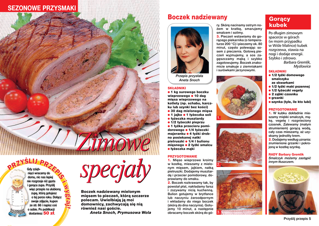 SEZONOWE PRZYSMAKI Boczek nadziewany ry. Skórę nacinamy ostrym nożem w kratkę, smarujemy smalcem i solimy. 3. Pieczeń wstawiamy do gorącego piekarnika (o temperaturze 200 °C) i pieczemy ok. 80 minut, często polewając sosem z pieczenia. Gotową pieczeń wyjmujemy, a sos zagęszczamy mąką i szybko zagotowujemy. Boczek znakomicie smakuje z ziemniakami i surówkami jarzynowymi. Przepis przysłała Aneta Snoch Gdy zziębnięci wracamy do domu, nic nas lepiej nie rozgrzeje niż gęsta i gorąca zupa. Przyślij więc przepis na ulubioną zupę, którą gotujesz o tej porze roku. Dołącz swoje zdjęcie, kupon ze str. 66 i napisz coś o sobie. Po publikacji dostaniesz 50 zł. Zimowe specjały Boczek nadziewany mielonym mięsem to pieczeń, którą szczerze polecam. Uwielbiają ją moi domownicy, zachwycają się nią również nasi goście. Aneta Snoch, Prymusowa Wola SKŁADNIKI ● 1 kg surowego boczku wieprzowego ● 10 dag mięsa wieprzowego na kotlety (np. schabu, karczku lub szynki bez kości) ● 30 dag mielonego mięsa ● 1 jajko ● 1 łyżeczka soli ● łyżeczka musztardy ● 1/2 łyżeczki pieprzu ● 1 łyżka przecieru pomidorowego ● 1/4 łyżeczki majeranku ● 4 łyżki drobno posiekanej natki pietruszki ● 1/4 l bulionu mięsnego ● 2 łyżki smalcu ● łyżeczka mąki PRZYGOTOWANIE 1. Mięso wieprzowe kroimy w kostkę, mieszamy z mielonym mięsem, jajkiem, natką pietruszki. Dodajemy musztardę i przecier pomidorowy, doprawiamy do smaku. 2. Boczek rozkrawamy tak, by powstał płat, nakładamy farsz i zszywamy nicią kuchenną. Bulion gotujemy w brytfance lub naczyniu żaroodpornym i wkładamy do niego boczek (skórą do dna naczynia). Gotujemy 10 minut, a następnie obracamy boczek skórą do gó- 1. 2. Gorący kubek Po długim zimowym spacerze w górach (w moim przypadku w Wiśle Malince) kubek rozgrzewa, stawia na nogi i dodaje energii. Szybko i zdrowo. Barbara Gremlik, Mysłowice SKŁADNIKI ● 1/2 łyżki domowego smalczyku ze skwarkami ● 1/2 łyżki maki pszennej ● 1/2 łyżeczki vegety ● 2 ząbki czosnku ● grzanki ● szynka (tyle, ile kto lubi) PRZYGOTOWANIE 1. W kubku dokładnie mieszamy miękki smalczyk, mąkę, vegetę i rozgnieciony czosnek. Zalewamy (małym strumieniem) gorącą wodą, cały czas mieszamy, aż uzyskamy jednolity krem. 2. Dodajemy według uznania: zrumienione grzanki i pokrojoną w kostkę szynkę. RADY Barbary Gremlik Smalczyk możemy zastąpić innym tłuszczem. 3. Przyślij przepis 5