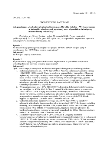 Sztum, dnia 18-11-2015r. ON.272.11.2015.III ODPOWIEDŹ NA ZAPYTANIE dot. przetargu: „Rozbudowa budynku Specjalnego Ośrodka Szkolno - Wychowawczego w Kołozębiu o budowę sali sportowej wraz z łącznikiem i niezbędną infrastrukturą techniczną.” Zgodnie z art. 38 ust. 2 ustawy z dnia 29 stycznia 2004r. Prawo zamówień publicznych (t.j. Dz. U. z 2013r., poz. 907 z późn. zm.) w odpowiedzi na poniższe zapytania dotyczące w/w przetargu informujemy, że: Pytanie 1 W dokumentacji przetargowej znajduje się projekt SSWiN. SSWiN nie jest ujęty w przedmiarze. Czy SSWiN jest częścią zamówienia? Odpowiedź: SSWiN jest częścią zamówienia. Pytanie 2 W przedmiarze ujęty jest system okablowania nagłośnienia. Czy w skład zamówienia wchodzą elementy aktywne systemu nagłośnienia? Odpowiedź: Opis i charakterystyka urządzeń niezbędnych do prawidłowego wykonania nagłośnienia 1. Kolumna głośnikowa szt. 4 CPV 32342000-2 Pasywna kolumna dwudrożna o mocy 100W RMS 180W (max) 8 Ohm, w obudowie trapezoidalnej bass-reflex. Obudowa wykonanej z mocnego tworzywa sztucznego ABS odpornego na uderzenia. Głośnik nisko średnio tonowy o średnicy 16cm wykonany z włókna węglowego, głośnik wysokotonowy tubowy kopułkowy. Uchwyt montażowy regulowany. metalowa siatka osłaniająca głośniki. Kolor biały. Pasmo przenoszenia 65Hz-25kHz, SPL 113dB. Gniazda połączeniowe 2 x Speakon. 2. Wzmacniacz mocy szt. 1 CPV 32343000-9 Adekwatna do kolumn końcówka mocy, nie mniej jak 2 x 400W RMS 8 Ohm 2 x 600W RMS 4 Ohm, pasmo przenoszenia 10Hz–50kHz/-1,5dB. 3 tryby pracy stereo, równoległa, mostkowa. Wbudowany limiter na wyjściu, opóźnione załączanie głośników. Zabezpieczenie przed zwarciem, przegrzaniem, napięciem stałym na wyjściu. Symetryczne wejścia XLR i Jack, wyjścia 2 x Speakon. Zasilanie 230V. Obudowa rack 19” 2U. 3. Odbiornik mikrofonu bezprzewodowego szt. 2 CPV 32341000-5 2-kanałowy odbiornik mikrofonów bezprzewodowych w technologii UHF PLL. System switching diversity, 16 wybieranych kanałów UHF, częstotliwość nośna 790-814 MHz, pasmo przenoszenia 40Hz-18kHz, wyciszenie szumu, regulacja poziomu głośności dla każdego kanału. Zakres roboczy w typowych warunkach do 100m. Złącza wyjściowe audio XLR. Zasilanie 230V. Obudowa rack 19” 1U 4. Mikrofon bezprzewodowy szt. 4 CPV 32341000-5 Doręczny mikrofon bezprzewodowy z wbudowanym nadajnikiem wieloczęstotliwościowym w technologii UHF PLL. Wkładka dynamiczna, pasmo przenoszenia 50Hz-16kHz. Wybór szesnastu kanałów o częstotliwości nośnej 790-814MHz. Moc nadawania < 10mW. Zasilanie 2 x 1,5V bateria typu AA. Obudowa z odlewu aluminiowego, futerał z tworzywa sztucznego, uchwyt do statywu. 5. Mikser audio szt. 1 CPV 32342420-2 Mikser analogowy, 16 wejść z 3-punktową regulacją barwy, parametryczny środek, 7-zakresowy korektor graficzny na sumie wyjść, procesor efektów dźwięku, wejścia stereo 4 + 2 dodatkowe wejścia mikrofonowe na kanałach 5/6 i 7/8, symetryczne wyjścia XLR, 60mm tłumiki suwakowe. Zasilanie 230V. Uchwyty do montażu w rack 19” 6. Odtwarzacz płyt kompaktowych szt. 1 CPV 32331400-6 Odtwarzacz CD/Mp3, system antywstrząsowy, odtwarzane formaty audio CD/CD-R/CD Mp3, wybór utworów przez klawisze numeryczne. Pasmo przenoszenia 20Hz-20kHz. Wyjścia analogowe 1 x RCA L/P. Wyświetlacz czasu odtwarzania, liczni bitów, wskaźnik słupkowy, sterowanie pilotem. Zasilanie 230V. Obudowa rack 19” 2U. 7. Stojak na urządzenia szt. 1 CPV 36141100-2 Obudowa na urządzenia typu rack, mobilna na kołach z hamulcem, możliwość montażu miksera rack 19” 12U, przestrzeń montażowa 9U. 8. Statyw mikrofonowy szt. 4 CPV 36340000-0 Podłogowy statyw mikrofonowy, regulowana wysokość 100-240cm, wyciągane ramie 60-95cm, rozkładana podstawa pochłaniająca wstrząsy. Kolor czarny 9. Przewód głośnikowy dł. 80 m / szt. 1 CPV 31300000-9 Przewód dwużyłowy o przekroju 2,5mm2 w podwójnej izolacji polwinitowej 10. Wtyki i akcesoria połączeniowe 1 kpl. CPV 31224100-3 Podwójne gniazdo głośnikowe Speakon w obudowie podtynkowej, 6 kpl. Kabli sygnałowych ze złączami XLR, 6 szt. złączy kątowych Speakon, 2 szt. złączy prostych Speakon, 2 kpl. Kabli sygnałowych RCA-Jack, przedłużacz 230 V 5mb z listwą na pięć gniazd oraz wyłącznikiem. Blokowy schemat połączeń elementów systemu nagłaśniającego