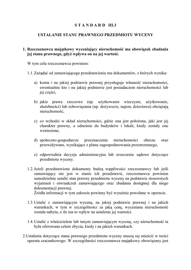 S T A N D A R D III.3 USTALANIE STANU PRAWNEGO PRZEDMIOTU WYCENY 1. Rzeczoznawca majątkowy wyceniający nieruchomość ma obowiązek zbadania jej stanu prawnego, gdyŜ wpływa on na jej wartość. W tym celu rzeczoznawca powinien: 1.1. ZaŜądać od zamawiającego przedstawienia mu dokumentów, z których wynika: a) komu i na jakiej podstawie prawnej przysługuje własność nieruchomości, ewentualnie kto i na jakiej podstawie jest posiadaczem nieruchomości lub jej części, b) jakie prawa rzeczowe (np. uŜytkowanie wieczyste, uŜytkowanie, słuŜebności) lub zobowiązania (np. doŜywocie, najem, dzierŜawa) obciąŜają nieruchomość, c) co wchodzi w skład nieruchomości, gdzie ona jest połoŜona, jaki jest jej charakter prawny, a odnośnie do budynków i lokali, kiedy zostały one wzniesione, d) społeczno-gospodarcze przeznaczenie nieruchomości obecne oraz przewidywane, wynikające z planu zagospodarowania przestrzennego, e) odpowiednia decyzja administracyjna lub orzeczenie sądowe dotyczące przedmiotu wyceny. 1.2. JeŜeli przedstawione dokumenty budzą wątpliwości rzeczoznawcy lub jeśli zamawiający nie jest w stanie ich przedstawić, rzeczoznawca powinien samodzielnie ustalić stan prawny przedmiotu wyceny na podstawie stosownych wyjaśnień i oświadczeń zamawiającego oraz zbadania dostępnej dla niego dokumentacji prawnej. Źródła informacji w tym zakresie powinny być wyraźnie powołane w operacie. 1.3. Ustalić z zamawiającym wycenę, na jakiej podstawie prawnej i na jakich warunkach, w tym w szczególności za jaką cenę, wyceniana nieruchomość została nabyta, o ile ma to wpływ na ustalenie jej wartości. 1.4. Ustalić z właścicielem lub innym zamawiającym wycenę, czy nieruchomość ta była oferowana celem zbycia, kiedy i na jakich warunkach. 2.Ustalenia dotyczące stanu prawnego przedmiotu wyceny muszą się mieścić w treści operatu szacunkowego. W szczególności rzeczoznawca majątkowy obowiązany jest podać wszelkie istniejące na nieruchomości obciąŜenia (w tym hipoteki, słuŜebności itp.), zaznaczając, które z nich uwzględnił przy ustaleniu wartości przedmiotu wyceny. 3. O ile z umowy z zamawiającym lub z innych, niezaleŜnych od rzeczoznawcy przyczyn wynika ograniczenie zbadania stanu prawnego nieruchomości, powinno to być w operacie wyraźnie zastrzeŜone i uzasadnione.