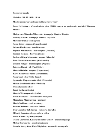 Rozmowa trzecia Niedziela / 18.09.2016 / 19:30 Międzynarodowe Centrum Kultury Nowy Teatr Paweł Mykietyn - Czarodziejska góra (2016), opera na podstawie powieści Thomasa Manna Małgorzata Sikorska-Miszczuk - koncepcja libretta, libretto Andrzej Chyra - koncepcja libretta, reżyseria Mirosław Bałka - scenografia Agata Zubel - sopran (Amerykanka) Łukasz Konieczny - bas (Behrens) Szymon Maliszewski - bas-baryton (Joachim) Szymon Komasa - baryton (Hans) Barbara Kinga Majewska - sopran (Kławdia) Juan Noval–Moro - tenor (Krokowski) Urszula Kryger - mezzosopran (Naphta) Jadwiga Rappé - alt (Pani Stöhr) Marcin Habela - baryton (Peeperkorn) Karol Kozłowski - tenor (Settembrini) Anna Gadt (chór / Elly Brand) Agnieszka Kiepuszewska (chór / Marusia) Michał Dembiński (chór / Wehsal) Iwona Kmiecik (chór) Jacek Kotlarski (chór) Marcin Wawrzynowicz (chór) Adam Banaszak - kierownictwo muzyczne Magdalena Maciejewska - kostiumy Maria Stokłosa - ruch sceniczny Bartosz Nalazek - reżyseria światła Ewa Guziołek-Tubelewicz - reżyseria dźwięku Mikołaj Szymkowiak - projekcje video Paweł Kaleta - stylizacja fryzur Maria Ciernioch, Katarzyna Kałek-Dekert - charakteryzacja Michał Kurkowski - asystent reżysera Urszula Kuczyńska, Kaja Migdałek - asystentki scenografa Grażyna Juszczyk - inspicjent Marcin Trzęsiok: Rozmawiamy na temat Czarodziejskiej góry Pawła Mykietyna. Mamy wśród nas eksperta – Basia Spodymek pisała o tym utworze pracę licencjacką. Prosimy eksperta, by na początku się przysłuchiwał rozmowie niewtajemniczonych. A potem poprosimy o komentarze i sprostowania. Chcę na początku zapytać: kto czytał powieść Thomasa Manna? Barbara Spodymek: Ja. Joanna Zabłocka: Ja. Jan Lech: Ja czytałem fragment. Anna Gluc: Ja też fragment. JL: Ale nie przeczytałem całej. MT: W ramach przygotowania się do „Warszawskiej jesieni”? JL: Wcześniej trochę, kiedy usłyszałem po raz pierwszy o Czarodziejskiej górze, czyli już minął jakiś czas. MT: Powinniście wszyscy przeczytać Doktora Faustusa i oczywiście Czarodziejską górę też, i ewentualnie inne książki Thomasa Manna, w których muzyka gra wielką rolę, tak jest prawie w każdej z nich. Także w Buddenbrookach, czyli w jego pierwszej genialnej powieści, którą napisał mając 25 lat. Tak więc rzecz dotyczy jednego z największych dzieł literackich XX wieku. Nie wiadomo, czy traktować tę operę jako dzieło wymagające znajomości powieści, czy też jako rzecz samoistną. Jest tu bardzo wiele momentów, kiedy znajomość powieści każe postawić pewne szczególne pytania, których by się nie postawiło, gdyby jej się nie znało. Więc z jednej strony jest to autonomiczne dzieło, a z drugiej strony siłą rzeczy jego korzenie tkwią w tej wielkiej powieści. No to może dzielmy się po prostu na początku swoimi wrażeniami w kolejności dowolnej. Kto chce pierwszy coś powiedzieć? JL: Ja może zacznę od jedynego chyba negatywnego aspektu, który wywarł na mnie niekorzystne wrażenie, czyli od ruchu scenicznego, który był bardzo sztuczny, niepotrzebnie zatrzymywał akcję. Takie geometryczne poruszanie się, które widzieliśmy też na przykład w Memooperze. To dla mnie nie do końca było zrozumiałe. Pokazywało mi, że chodzi tu o coś abstrakcyjnego, dalekiego od mojego bycia w świecie. AG: Tak myślisz? Mnie ruch sceniczny odpowiadał, budował dramaturgię drugiego aktu. JL: Mówisz o tych takich geometrycznych zachodzeniach postaci, tak? O tym liniowym poruszaniu się? AG: Tak. I o samym umiejscowieniu postaci w scenografii. MT: Ruch geometryczny był wymuszony przez układ przejść między tymi wielościanami. BS: W koncepcji autorów scenografia miała obrazować labirynt, który zamyka bohaterów i nie potrafią się z niego wydostać. MT: A, czyli taka fatalistyczna symbolika. BS: Tak. Scenografia pierwszego aktu miała odzwierciedlać górę, jamę anakondy, a także przywodzić na myśl piramidę, która potem została zmieniona właśnie w labirynt. MT: A ja się wczoraj spotkałem z opiniami, w których takie ładne słowo padło: „Dlaczego oni położyli ten drugi akt?”. Co jest zabawnie dwuznaczne. JL: Ale chciałem się do tego odnieść co powiedziałaś. Próbuje się wczuć w postać, która chodzi po labiryncie. Ja bym nie chodził tak sztywno i tak powoli, raczej bym starał się znaleźć wyjście dość szybko i myślę, że raczej próbowałbym biegać, nerwowo rzucać na wszystkie strony. A oni tam po prostu chodzili z taką... JZ: Ale to też może wskazywało na ten czas, który... Piotr Krajewski: Weźmy pod uwagę ten kontekst: napięty czas przed wojną. MT: A ja bym wolał żebyśmy nie rozpoczynali od takiej przyczynkarskiej dyskusji na temat jakiegoś szczegółu, tylko żebyśmy wyszli od próby ogarnięcia całości, dokonania jakiejś syntezy. Spójrzmy na to najpierw z góry, z perspektywy orła, a potem dopiero z perspektywy mrówki, która widzi jeden szczegół, a nie widzi całości. Joanna Kołodziejska: Patrząc z góry, a raczej też wyciągając wniosek z pierwszego wrażenia, które we mnie pozostało: kompozycja cały czas trzymała w napięciu. MT: Czym tak działała? JK: Chociażby niedosłownością dialogów, tokiem akcji, który trzeba było uważnie śledzić... i fantastyczną warstwą elektroniczną. W ogóle, utwór urzekał dopasowaniem warstwy muzycznej do warstwy scenicznej. Obserwując te elementy, połączone w całość, miałam wrażenie, że jeżeli choć trochę odpuszczę pod względem koncentracji, to po prostu się zgubię, a bardzo tego nie chciałam. Utwór wymagał ode mnie, żebym cały czas była skoncentrowana, żebym cały czas go śledziła. To mi się bardzo podobało. MT: Jak pani odczuwała rytm zmian w tym utworze, biorąc pod uwagę całość spektaklu, wszystkie elementy działające na zmysły? Czy rytm zmian był częsty, czy był rzadki? Czy ta koncentracja musiała być gruboziarnista, cz