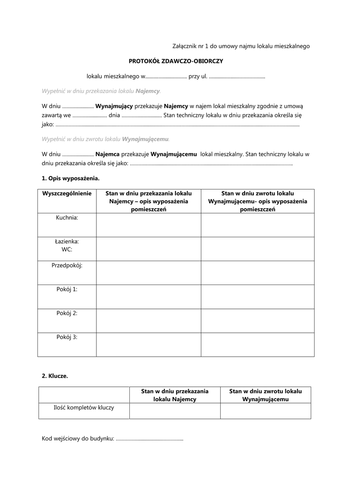 Załącznik nr 1 do umowy najmu lokalu mieszkalnego PROTOKÓŁ ZDAWCZO-OBIORCZY lokalu mieszkalnego w……………………….. przy ul. ………………………………… Wypełnić w dniu przekazania lokalu Najemcy. W dniu …………………. Wynajmujący przekazuje Najemcy w najem lokal mieszkalny zgodnie z umową zawartą we …………………… dnia ………………………. Stan techniczny lokalu w dniu przekazania określa się jako: ……………………………………………………………………………………………………………………………………………………. Wypełnić w dniu zwrotu lokalu Wynajmującemu. W dniu …………………. Najemca przekazuje Wynajmującemu lokal mieszkalny. Stan techniczny lokalu w dniu przekazania określa się jako: ………………………………………………………………………………………………….. 1. Opis wyposażenia. Wyszczególnienie Stan w dniu przekazania lokalu Najemcy – opis wyposażenia pomieszczeń Stan w dniu zwrotu lokalu Wynajmującemu- opis wyposażenia pomieszczeń Kuchnia: Łazienka: WC: Przedpokój: Pokój 1: Pokój 2: Pokój 3: 2. Klucze. Stan w dniu przekazania lokalu Najemcy Ilość kompletów kluczy Kod wejściowy do budynku: ……………………………………….. Stan w dniu zwrotu lokalu Wynajmującemu 3. Stany liczników. Licznik Stan w dniu przekazania lokalu Najemcy Stan w dniu zwrotu lokalu Wynajmującemu Stan licznika wody ciepłej Stan licznika wody zimnej Stan licznika prądu Stan licznika gazu 4. Uwagi. ………………………………………………………………………………………………………………………………………………………………… ………………………………………………………………………………………………………………………………………………………………… ………………………………………………………………………………………………………………………………………………………………… ………………………………………………………………………………………………………………………………………………………………… ………………………………………………………………………………………………………………………………………………………………… ………………………………………………………………………………………………………………………………………………………………… ………………………………………………………………………………………………………………………………………………………………… ………………………………………………………………………………………………………………………………………………………………… Wypełnić w dniu przekazania lokalu Najemcy. Niniejszy protokół sporządzono w dwóch jednobrzmiących egzemplarzach, po jednym dla każdej ze stron. Strony niniejszym dokonały przekazania lokalu mieszkalnego w użytkowanie Najemcy. Data: ……………………………… Podpis stron: Wynajmujący Najemca ……………………….……………………. ……………………………………………… Wypełnić w dniu zwrotu lokalu Wynajmującemu. Strony dokonują zwrotu lokalu mieszkalnego Wynajmującemu. Data: …………………………….. Podpis stron: Wynajmujący ………………………………………..……. Najemca ………………………………………………….