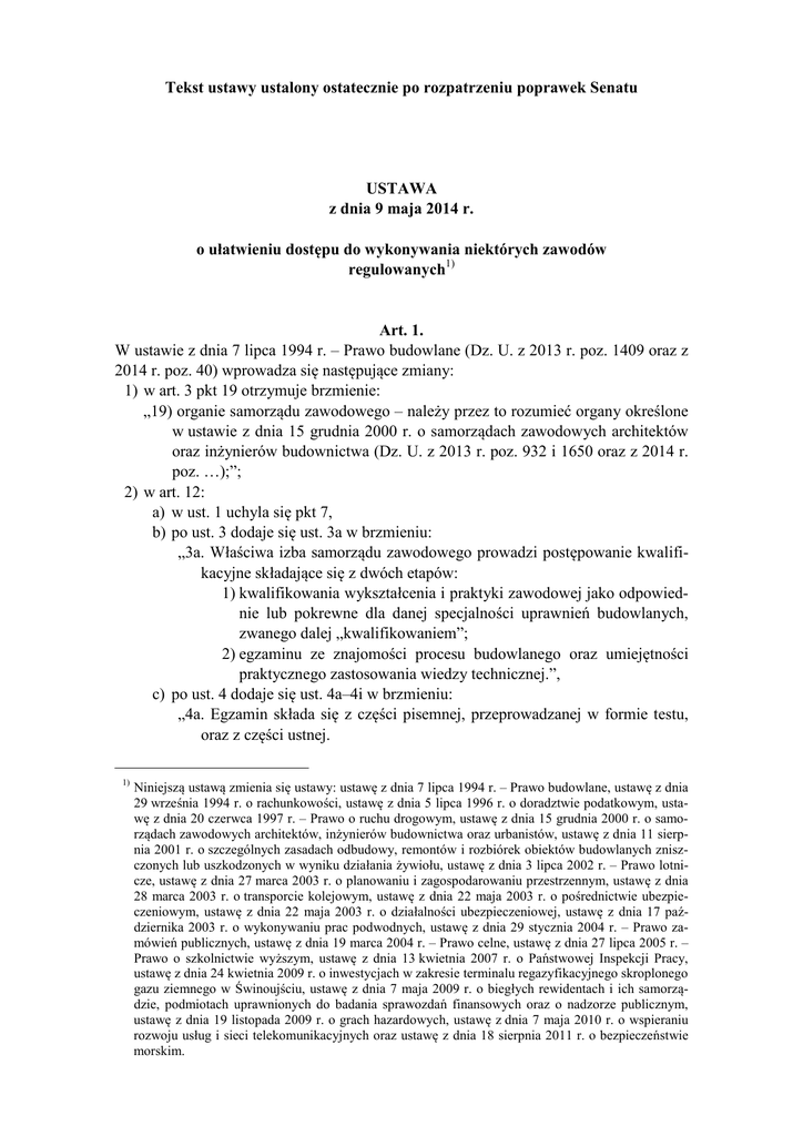 Tekst ustawy ustalony ostatecznie po rozpatrzeniu poprawek Senatu USTAWA z dnia 9 maja 2014 r. o ułatwieniu dostępu do wykonywania niektórych zawodów regulowanych1) Art. 1. W ustawie z dnia 7 lipca 1994 r. – Prawo budowlane (Dz. U. z 2013 r. poz. 1409 oraz z 2014 r. poz. 40) wprowadza się następujące zmiany: 1) w art. 3 pkt 19 otrzymuje brzmienie: „19) organie samorządu zawodowego – należy przez to rozumieć organy określone w ustawie z dnia 15 grudnia 2000 r. o samorządach zawodowych architektów oraz inżynierów budownictwa (Dz. U. z 2013 r. poz. 932 i 1650 oraz z 2014 r. poz. …);”; 2) w art. 12: a) w ust. 1 uchyla się pkt 7, b) po ust. 3 dodaje się ust. 3a w brzmieniu: „3a. Właściwa izba samorządu zawodowego prowadzi postępowanie kwalifikacyjne składające się z dwóch etapów: 1) kwalifikowania wykształcenia i praktyki zawodowej jako odpowiednie lub pokrewne dla danej specjalności uprawnień budowlanych, zwanego dalej „kwalifikowaniem”; 2) egzaminu ze znajomości procesu budowlanego oraz umiejętności praktycznego zastosowania wiedzy technicznej.”, c) po ust. 4 dodaje się ust. 4a–4i w brzmieniu: „4a. Egzamin składa się z części pisemnej, przeprowadzanej w formie testu, oraz z części ustnej. 1) Niniejszą ustawą zmienia się ustawy: ustawę z dnia 7 lipca 1994 r. – Prawo budowlane, ustawę z dnia 29 września 1994 r. o rachunkowości, ustawę z dnia 5 lipca 1996 r. o doradztwie podatkowym, ustawę z dnia 20 czerwca 1997 r. – Prawo o ruchu drogowym, ustawę z dnia 15 grudnia 2000 r. o samorządach zawodowych architektów, inżynierów budownictwa oraz urbanistów, ustawę z dnia 11 sierpnia 2001 r. o szczególnych zasadach odbudowy, remontów i rozbiórek obiektów budowlanych zniszczonych lub uszkodzonych w wyniku działania żywiołu, ustawę z dnia 3 lipca 2002 r. – Prawo lotnicze, ustawę z dnia 27 marca 2003 r. o planowaniu i zagospodarowaniu przestrzennym, ustawę z dnia 28 marca 2003 r. o transporcie kolejowym, ustawę z dnia 22 maja 2003 r. o pośrednictwie ubezpieczeniowym, ustawę z dnia 22 maja 2003 r. o działalności ubezpieczeniowej, ustawę z dnia 17 października 2003 r. o wykonywaniu prac podwodnych, ustawę z dnia 29 stycznia 2004 r. – Prawo zamówień publicznych, ustawę z dnia 19 marca 2004 r. – Prawo celne, ustawę z dnia 27 lipca 2005 r. – Prawo o szkolnictwie wyższym, ustawę z dnia 13 kwietnia 2007 r. o Państwowej Inspekcji Pracy, ustawę z dnia 24 kwietnia 2009 r. o inwestycjach w zakresie terminalu regazyfikacyjnego skroplonego gazu ziemnego w Świnoujściu, ustawę z dnia 7 maja 2009 r. o biegłych rewidentach i ich samorządzie, podmiotach uprawnionych do badania sprawozdań finansowych oraz o nadzorze publicznym, ustawę z dnia 19 listopada 2009 r. o grach hazardowych, ustawę z dnia 7 maja 2010 r. o wspieraniu rozwoju usług i sieci telekomunikacyjnych oraz ustawę z dnia 18 sierpnia 2011 r. o bezpieczeństwie morskim. 2 4b. Z egzaminu zwalnia się absolwenta studiów wyższych prowadzonych na podstawie umowy, o której mowa w art. 168b ust. 2 ustawy z dnia 27 lipca 2005 r. – Prawo o szkolnictwie wyższym (Dz. U. z 2012 r. poz. 572, z późn. zm.2)), zawartej między uczelnią a właściwym organem samorządu zawodowego w zakresie odpowiadającym programowi kształcenia opracowanemu z udziałem organu samorządu zawodowego oraz zgodnie z przepisami wydanymi na podstawie art. 16. 4c. W zależności od posiadanego wykształcenia i zakresu odbytej praktyki zawodowej egzamin jest przeprowadzany na uprawnienia budowlane do: 1) projektowania w danej specjalności; 2) kierowania robotami budowlanymi w danej specjalności; 3) projektowania i kierowania robotami budowlanymi w danej specjalności. 4d. Przy ubieganiu się o nadanie uprawnień budowlanych w innej specjalności lub w innym zakresie niż posiadane egzamin jest ograniczony wyłącznie do zagadnień nieobjętych zakresem egzaminu obowiązującym przy ubieganiu się o już posiadane uprawnienia budowlane. 4e. Egzamin jest przeprowadzany co najmniej dwa razy w roku, w terminach ustalanych przez właściwą izbę samorządu zawodowego. 4f. Zawiadomienie o terminie egzaminu właściwa izba samorządu zawodowego doręcza, za pośrednictwem operatora pocztowego przesyłką poleconą za potwierdzeniem odbioru, osobie ubiegającej się o nadanie uprawnień budowlanych, co najmniej miesiąc przed tym terminem. 4g. Negatywny wynik części pisemnej egzaminu powoduje niedopuszczenie do części ustnej. 4h. Osoba, która uzyskała negatywny wynik egzaminu, może ponownie do niego przystąpić, nie wcześniej niż po upływie 3 miesięcy. Osoba, która uzyskała negatywny wynik części ustnej egzaminu, może ponownie przystąpić tylko do tej części. 4i. Pozytywny wynik części pisemnej egzaminu jest ważny przez okres 3 lat od dnia jego uzyskania.”, d) ust. 5 otrzymuje brzmienie: „5. Osoba ubiegająca się o nadanie uprawnień budowlanych wnosi opłatę za postępowanie kwalifikacyjne.”, e) po ust. 5 dodaje się ust. 5a–5f w brzmieniu: „5a. Opłata za postępowanie kwalifikacyjne o nadanie uprawnień budowlanych, o których mowa w art. 14 ust. 3 pkt 1–4: 1) z tytułu kwalifikowania nie przekracza 22% kwoty przeciętnego wynagrodzenia w gospodarce narodowej w poprzednim roku kalendarzowym, ogłaszanego przez Prezesa Głównego Urzędu Statystycznego na podstawie ustawy z dnia 17 grudnia 1998 r. o emeryturach i rentach z Funduszu Ubezpieczeń Społecznych (Dz. U. z 2013 r. poz. 1440, z późn. zm.3)) zwanego dalej „przeciętnym wynagrodzeniem”; 2) 3) Zmiany tekstu jednolitego wymienionej ustawy zostały ogłoszone w Dz. U. z 2012 r. poz. 742 i 1544, z 2013 r. poz. 675, 829, 1005, 1588 i 1650 oraz z 2014 r. poz. 7 i .... Zmiany tekstu jednolitego wymienionej ustawy zostały ogłoszone w Dz. U. z 2013 r. poz. 1717 i 1734 oraz z 2014 r. poz. 496 i 567. 3 2) z tytułu przeprowadzenia egzaminu nie przekracza 22% kwoty przeciętnego wyn