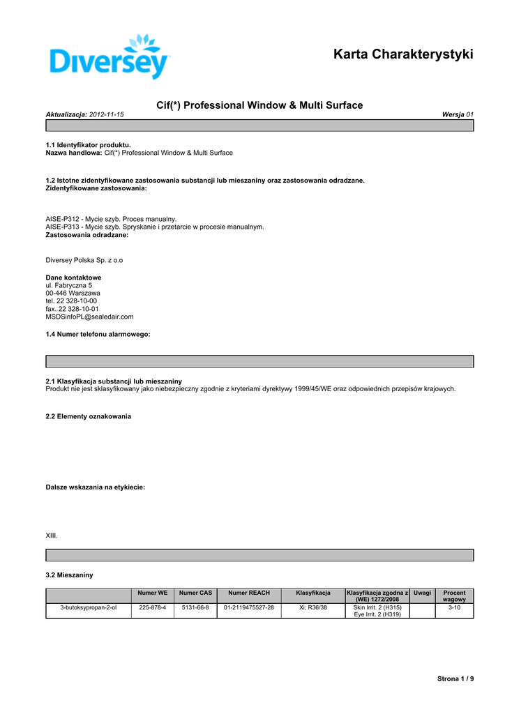 Karta Charakterystyki Cif(*) Professional Window & Multi Surface Aktualizacja: 2012-11-15 Wersja 01 1.1 Identyfikator produktu. Nazwa handlowa: Cif(*) Professional Window & Multi Surface 1.2 Istotne zidentyfikowane zastosowania substancji lub mieszaniny oraz zastosowania odradzane. Zidentyfikowane zastosowania: AISE-P312 - Mycie szyb. Proces manualny. AISE-P313 - Mycie szyb. Spryskanie i przetarcie w procesie manualnym. Zastosowania odradzane: Diversey Polska Sp. z o.o Dane kontaktowe ul. Fabryczna 5 00-446 Warszawa tel. 22 328-10-00 fax. 22 328-10-01 [email protected] 1.4 Numer telefonu alarmowego: 2.1 Klasyfikacja substancji lub mieszaniny Produkt nie jest sklasyfikowany jako niebezpieczny zgodnie z kryteriami dyrektywy 1999/45/WE oraz odpowiednich przepisów krajowych. 2.2 Elementy oznakowania Dalsze wskazania na etykiecie: XIII. 3.2 Mieszaniny 3-butoksypropan-2-ol Numer WE Numer CAS Numer REACH Klasyfikacja 225-878-4 5131-66-8 01-2119475527-28 Xi; R36/38 Klasyfikacja zgodna z Uwagi (WE) 1272/2008 Skin Irrit. 2 (H315) Eye Irrit. 2 (H319) Procent wagowy 3-10 Strona 1 / 9 KARTA CHARAKTERYSTYKI Cif(*) Professional Window & Multi Surface * Polimer. Wdychanie Kontakt z oczami pierwszej pomocy: Wdychanie Kontakt z oczami substancji, patrz sekcja 11. alkoholu. 6.4 Odniesienia do innych sekcji Strona 2 / 9 KARTA CHARAKTERYSTYKI Cif(*) Professional Window & Multi Surface Zgodnie z przepisami lokalnymi i krajowymi. Podstawowe warunki przechowywania Zalecane procedury monitorowania: krótkoterminowe skutki miejscowe krótkoterminowe skutki ogólnoustrojowe skutki miejscowe skutki ogólnoustrojowe danych danych danych danych krótkoterminowe skutki miejscowe krótkoterminowe skutki ogólnoustrojowe (mg / kg mc) skutki miejscowe skutki ogólnoustrojowe (mg / kg mc) danych danych danych danych krótkoterminowe skutki miejscowe krótkoterminowe skutki ogólnoustrojowe (mg / kg mc) skutki miejscowe skutki ogólnoustrojowe (mg / kg mc) danych danych danych danych krótkoterminowe skutki miejscowe krótkoterminowe skutki ogólnoustrojowe skutki miejscowe skutki ogólnoustrojowe danych danych danych danych krótkoterminowe skutki miejscowe krótkoterminowe skutki ogólnoustrojowe skutki miejscowe skutki ogólnoustrojowe danych danych danych danych Wody powierzchniowe, Okresowe (mg / l) Oczyszczalnia (mg / l) danych danych danych danych Osady morskie (mg / kg) Gleba (mg / kg) W powietrzu (mg/m3) (mg / kg) danych danych danych danych 3-butoksypropan-2-ol 3-butoksypropan-2-ol 3-butoksypropan-2-ol 3) 3-butoksypropan-2-ol 3) 3-butoksypropan-2-ol 3-butoksypropan-2-ol 3-butoksypropan-2-ol Strona 3 / 9 KARTA CHARAKTERYSTYKI Cif(*) Professional Window & Multi Surface produktu: Ochrona oczu / twarzy: konieczna. Ochrona dróg oddechowych: Metoda/ uwaga Barwa Przejrzysty Niebieski Zapach Lekko perfumowany Próg zapachu Nie dotyczy. pH: Nie dotyczy. Podtrzymuje palenie: Nie dotyczy. 1.00 g/cm³ (20°C) 9.2. Inne informacje Korozja metali (zgodnie z IMDG/ADR): Strona 4 / 9 KARTA CHARAKTERYSTYKI Cif(*) Professional Window & Multi Surface SEKCJA 11: Informacje toksykologiczne Mieszaniny Punkt Gatunek: Metoda Czas ekspozycji (h) Szczur Metody nie podano Gatunek: Metoda Szczur Metody nie podano Gatunek: Metoda Szczur Metody nie podano (mg / kg) 3-butoksypropan-2-ol LD 50 3300 Punkt Czas ekspozycji (h) (mg / kg) 3-butoksypropan-2-ol LD 50 > 2000 Punkt (mg / l) 3-butoksypropan-2-ol LC 50 Wynik 3.5 Czas ekspozycji (h) 4 Gatunek Metoda Czas ekspozycji Gatunek Metoda Czas ekspozycji Gatunek Metoda Czas ekspozycji Gatunek Metoda Czas ekspozycji (h) Gatunek Metoda Czas ekspozycji 3-butoksypropan-2-ol danych Wynik 3-butoksypropan-2-ol danych Wynik 3-butoksypropan-2-ol danych. Wynik 3-butoksypropan-2-ol danych Wynik 3-butoksypropan-2-ol danych Strona 5 / 9 KARTA CHARAKTERYSTYKI Cif(*) Professional Window & Multi Surface Punkt Gatunek Metoda Czas ekspozycji (dni) Gatunek Metoda Czas ekspozycji (dni) Gatunek Metoda Czas ekspozycji (dni) (mg/kg bw/d) 3-butoksypropan-2-ol Brak danych Punkt (mg/kg bw/d) 3-butoksypropan-2-ol Brak danych Punkt (mg/kg bw/d) 3-butoksypropan-2-ol Brak danych Drogi Punkt Gatunek Metoda Czas ekspozycji (dni) (mg/kg bw/d) 3-butoksypropan-2-ol Komentarze docelowe Brak danych Dane mieszaniny: Zmiana 3-butoksypropan-2-ol Wynik (in vitro) Metoda (in vitro) Wynik (in vivo) Metoda (in vivo) 3-butoksypropan-2-ol Punkt Specyficzny efekt Gatunek Metoda (mg / kg mc / d) Brak 3-butoksypropan-2-ol Czas ekspozycji inne skutki danych Potencjalne szkodliwe skutki dla zdrowia i objawy SEKCJA 12: Informacje ekologiczne Mieszaniny Brak danych dla mieszaniny. Punkt Gatunek Metoda Ryby Metody nie podano Gatunek Metoda (mg / l) 3-butoksypropan-2-ol LC 50 560 - 1000 Punkt (mg / l) Czas ekspozycji (h) 96 Czas ekspozycji (h) Strona 6 / 9 KARTA CHARAKTERYSTYKI Cif(*) Professional Window & Multi Surface 3-butoksypropan-2-ol LC > 1000 50 Punkt Dafnia metody nie podano 48 Gatunek Metoda badawcza Czas ekspozycji (h) Gatunek Metoda Czas ekspozycji (dni) Inokulum Metoda Czas ekspozycji Bakterie metody nie podano (mg / l) 3-butoksypropan-2-ol Brak danych Punkt (mg / l) 3-butoksypropan-2-ol Brak danych Punkt 3-butoksypropan-2-ol (mg / l) > 1000 EC 50 Punkt Gatunek Metoda Czas ekspozycji Zaobserwowano efekty Gatunek Metoda Czas ekspozycji Zaobserwowane skutki (mg / l) Brak 3-butoksypropan-2-ol danych Punkt (mg / l) Brak 3-butoksypropan-2-ol danych Biodegradacja Inokulum Metoda analityczna DT50 3-butoksypropan-2-ol 3-butoksypropan-2-ol Metoda Ocena Metody nie podano 0.98 Metoda Metody nie podano Ocena Komentarz Strona 7 / 9 KARTA CHARAKTERYSTYKI Cif(*) Professional Window & Multi Surface Gatunek Metoda Ocena Komentarz 3-butoksypropan-2-ol danych Adsorpcja / desorpcja w glebie lub osadzie adsorpcji Log Koc desorpcji Log Koc(des) Metoda badawcza Gleba / typ osadu Ocena 3-butoksypropan-2-ol danych glebie, rozpuszczalny w wodzie 13.1. Metody unieszkodliwiania odpadów Katalog odpadów: Puste opakowanie Zalecenie: ADR, RID, ADN, IMO / IMDG, ICAO / 