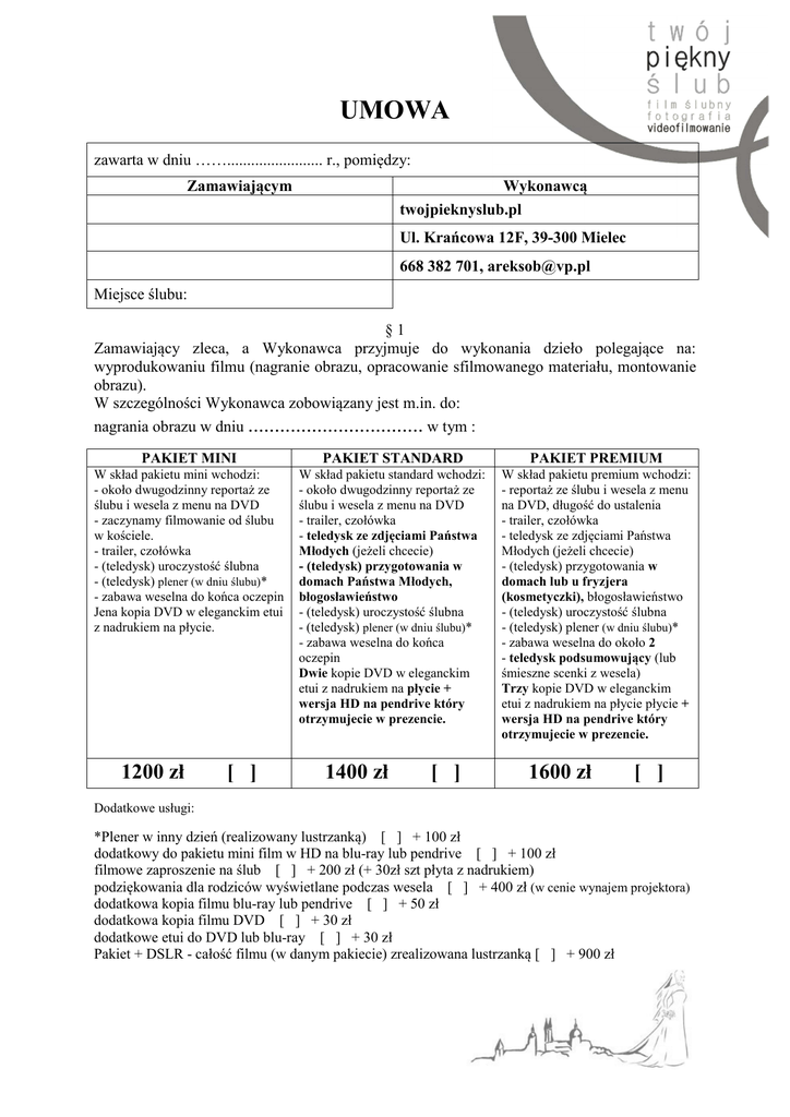 UMOWA zawarta w dniu ……........................ r., pomiędzy: Zamawiającym Wykonawcą twojpieknyslub.pl Ul. Krańcowa 12F, 39-300 Mielec 668 382 701, [email protected] Miejsce ślubu: §1 Zamawiający zleca, a Wykonawca przyjmuje do wykonania dzieło polegające na: wyprodukowaniu filmu (nagranie obrazu, opracowanie sfilmowanego materiału, montowanie obrazu). W szczególności Wykonawca zobowiązany jest m.in. do: nagrania obrazu w dniu ................................. w tym : PAKIET MINI PAKIET STANDARD PAKIET PREMIUM W skład pakietu mini wchodzi: - około dwugodzinny reportaż ze ślubu i wesela z menu na DVD - zaczynamy filmowanie od ślubu w kościele. - trailer, czołówka - (teledysk) uroczystość ślubna - (teledysk) plener (w dniu ślubu)* - zabawa weselna do końca oczepin Jena kopia DVD w eleganckim etui z nadrukiem na płycie. W skład pakietu standard wchodzi: - około dwugodzinny reportaż ze ślubu i wesela z menu na DVD - trailer, czołówka - teledysk ze zdjęciami Państwa Młodych (jeżeli chcecie) - (teledysk) przygotowania w domach Państwa Młodych, błogosławieństwo - (teledysk) uroczystość ślubna - (teledysk) plener (w dniu ślubu)* - zabawa weselna do końca oczepin Dwie kopie DVD w eleganckim etui z nadrukiem na płycie + wersja HD na pendrive który otrzymujecie w prezencie. W skład pakietu premium wchodzi: - reportaż ze ślubu i wesela z menu na DVD, długość do ustalenia - trailer, czołówka - teledysk ze zdjęciami Państwa Młodych (jeżeli chcecie) - (teledysk) przygotowania w domach lub u fryzjera (kosmetyczki), błogosławieństwo - (teledysk) uroczystość ślubna - (teledysk) plener (w dniu ślubu)* - zabawa weselna do około 2 - teledysk podsumowujący (lub śmieszne scenki z wesela) Trzy kopie DVD w eleganckim etui z nadrukiem na płycie płycie + wersja HD na pendrive który otrzymujecie w prezencie. 1200 zł [ ] 1400 zł [ ] 1600 zł [ ] Dodatkowe usługi: *Plener w inny dzień (realizowany lustrzanką) [ ] + 100 zł dodatkowy do pakietu mini film w HD na blu-ray lub pendrive [ ] + 100 zł filmowe zaproszenie na ślub [ ] + 200 zł (+ 30zł szt płyta z nadrukiem) podziękowania dla rodziców wyświetlane podczas wesela [ ] + 400 zł (w cenie wynajem projektora) dodatkowa kopia filmu blu-ray lub pendrive [ ] + 50 zł dodatkowa kopia filmu DVD [ ] + 30 zł dodatkowe etui do DVD lub blu-ray [ ] + 30 zł Pakiet + DSLR - całość filmu (w danym pakiecie) zrealizowana lustrzanką [ ] + 900 zł §2 Wykonawca oświadcza, że posiada uprawnienia do wykonywania przedmiotu umowy, jeżeli odrębne przepisy nakładają obowiązek posiadania takich. §3 Strony ustalają, że w terminie do ................ dni roboczych od daty ślubu lub dostarczenia/zrealizowania wszystkich materiałów (plener, zdjecia z dzieciństwa itp...) Wykonawca przekaże Zamawiającemu wg wyboru film do akceptacji lub gotowy film. §4 Całość wynagrodzenia za wykonanie dzieła zostało ustalone w wysokości ........................... zł (słownie zł....................................................) brutto. §5 W dniu podpisania umowy Wykonawca otrzyma zadatek w wysokości ................................. zł (słownie zł…………………………............) na poczet wykonania umowy. §6 Strony ustalają, że w przypadku rezygnacji przez Zamawiającego z realizacji umowy na mniej niż sześć miesięcy przed datą ślubu kwota zadatku nie zostanie mu zwrócona. §7 Zapłata pozostałej części wynagrodzenia nastąpi najpóźniej w dniu odbioru dzieła przez Zamawiającego. Wynagrodzenie określone w § 4 wyczerpuje wszystkie roszczenia finansowe Wykonawcy, które mogą wynikać z niniejszej umowy. §8 Zamawiający ma prawo do dokonania zmian lub poprawek. W takiej sytuacji Wykonawca dokona zmian lub poprawek w terminie odrębnie ustalonym przez Strony. Wykonawca jest zobowiązany do dokonania zmian nieodpłatnie. §9 Wykonawca ma prawo za zgodą Zamawiającego do wykorzystania filmu lub jego fragmentów do promocji swojej działalności. § 10 Wszelkie zmiany postanowień niniejszej umowy wymagają formy pisemnej pod rygorem nieważności. W sprawach nieuregulowanych niniejszą umową mają zastosowanie przepisy Kodeksu cywilnego i ustawy o prawie autorskim i prawach pokrewnych. Umowę sporządzono w dwóch jednobrzmiących egzemplarzach po jednym dla każdej ze stron. ZAMAWIAJĄCY ……………………………………… WYKONAWCA ……………………………………