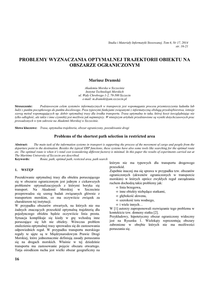 Studia i Materiały Informatyki Stosowanej, Tom 6, Nr 17, 2014 str. 16-21 PROBLEMY WYZNACZANIA OPTYMALNEJ TRAJEKTORII OBIEKTU NA OBSZARZE OGRANICZONYM Mariusz Dramski Akademia Morska w Szczecinie Instytut Technologii Morskich ul. Wały Chrobrego 1-2, 70-500 Szczecin e-mail: [email protected] Streszczenie: Podstawowym celem systemów informatycznych w transporcie jest wspomaganie procesu przemieszczenia ładunku lub ludzi z punktu początkowego do punktu docelowego. Poza typowymi funkcjami związanymi z informatyczną obsługą przedsiębiorstwa, istnieje szereg metod wspomagających np. dobór optymalnej trasy dla środka transportu. Trasa optymalna to taka, której koszt (uwzględniając nie tylko odległość, ale także i inne czynniki) jest możliwie jak najmniejszy. W niniejszym artykule przedstawione są wyniki dotychczasowych prac prowadzonych w tym zakresie na Akademii Morskiej w Szczecinie. Słowa kluczowe: Trasa, optymalna trajektoria, obszar ograniczony, poszukiwanie drogi Problems of the shortest path selection in restricted area Abstract: The main task of the information systems in transport is supporting the process of the movement of cargo and people from the departure point to the destination. Besides the typical ERP functions, these systems have also some tools like searching for the optimal route etc. The optimal route is when it’s total cost (considering different factors) is minimal. In this paper the results of experiments carried out at The Maritime University of Szczecin are described. Keywords: Route, path, optimal path, resticted area, path search 1. WSTĘP Poszukiwanie optymalnej trasy dla obiektu poruszającego się w obszarze ograniczonym jest jednym z ciekawszych problemów optymalizacyjnych z którymi boryka się transport. Na Akademii Morskiej w Szczecinie przeprowadza się szereg badań związanych głównie z transportem morskim, co ma oczywiście związek za charakterem tej instytucji. W przypadku obszarów otwartych, na których nie ma żadnych znaczących przeszkód optymalną trajektorią dla pojedynczego obiektu będzie oczywiście linia prosta. Sytuacja komplikuje się kiedy w grę wchodzą inne poruszające się lub nie obiekty. Wówczas problem znalezienia optymalnej trasy sprowadza się do zastosowania odpowiednich reguł. W przypadku transportu morskiego reguły te ujęte są w Międzynarodowym Prawie Drogi Morskiej, które jednoznacznie definiują zasady poruszania się na drogach morskich. Właśnie w tej dziedzinie transportu ma zastosowanie pojęcie obszaru otwartego. Tutja ośrodkiem ruchu jest wielki obszar geograficzny na 16 którym nie ma typowych dla transportu drogowego przeszkód. Zupełnie inaczej ma się sprawa w przypadku tzw. obszarów ograniczonych (akwenów ograniczonych w transporcie morskim) w których oprócz zwykłych reguł zarządzania ruchem dochodzą takie problemy jak: • linia brzegowa, • inne obiekty niebędące statkami, • głębokość akwenu, • szerokość toru wodnego, • i wiele innych… W [1] autorzy zaproponowali rozwiązanie tego problemu w kontekście tzw. domeny statku [2]. Przykładowy, hipotetyczny obszar ograniczony widoczny jest na Rysunku 1. Wielokąty reprezentują obszary zabronione w obrębie których nie ma możliwości poruszania się. Mariusz Dramski, Problemy wyznaczania optymalnej trajektorii obiektu na obszarze ograniczonym Rysunek 1 Przykład obszaru ograniczonego, źródło: opracowanie własne. 2. Rysunek 2 ilustruje przykład dyskretyzacji obszaru ograniczonego z zastosowaniem siatki trapezowej. Ciemne wielokąty reprezentują obszary zabronione. Kolorem niebieskim przedstawiono przykładowe możliwe przejścia pomiędzy poszczególnymi punktami pośrednimi (krawędzie grafu). Dyskretyzacja obszaru może być realizowana również innymi metodami jak np.: • drzewa czwórkowe, • triangulacja Delaunaya, • diagramy Voronoia (przekształcenie dualne do triangulacji Delaunaya), • i wiele innych. Po dokonaniu dyskretyzacji mamy wyznaczony graf możliwych przejść. Jego węzły określają punkty przez które powinien poruszać się obiekt. Krawędzie oznaczają trasy pomiędzy nimi. POSZUKIWANIE OPTYMALNEJ TRAJEKTORII Mając daną cyfrową mapę obszaru należy określić punkty początkowy oraz końcowy. Następnym krokiem jest dyskretyzacja danego obszaru w celu zbudowania grafu wszystkich możliwych przejść w danym obszarze. Wagi krawędzi grafu będą reprezentować odległości pomiędzy dwoma sąsiednimi jego elementami w rozumieniu euklidesowym. Można je również modyfikować uwzględniając inne kryteria jak np. głębokość akwenu, oznakowanie nawigacyjne itp. Rysunek 3 Przykładowe grafy możliwych tras, źródło: [4]. Powyższy rysunek ilustruje możliwe grafy skierowane (w przypadku grafów nieskierowanych można przyjąć, że ruch obiektu może odbywać się w obu kierunkach) przedstawiające możliwe przemieszczenia obiektu na trasie. Dotarcie z punktu początkowego do punktu końcowego sprowadza się zatem do znalezienia najkrótszej drogi w grafie. Można tu wykorzystać szereg powszechnie dostępnych metod czy zaproponować inne rozwiązania. Tym niemniej najpopularniejszym z nich będzie algorytm Dijkstry lub A*. Rysunek 2 Przykład dyskretyzacji obszaru, źródło: [3]. 17 Studia i Materiały Informatyki Stosowanej, Tom 6, Nr 17, 2014 str. 16-21 Rysunek 4 Przykładowy graf przejść naniesiony na rzeczywisty obszar ograniczony, źródło: [4] Powyższy rysunek ilustruje przykładowy sposób naniesienia grafu możliwych przejść na konkretny akwen ograniczony. W tym przypadku widzimy wejście do portu w Szczecinie wraz przylegającym jeziorem Dąbie. 3. KRYTERIA WYBORU ALGORYTMU POSZUKIWANIA NAJKRÓTSZEJ DROGI W [5] opisano podstawowe metody poszukiwania najkrótszej drogi w grafie. Ponadto dodano rozwiązanie alternatywne w postaci uproszczonego algorytmu mrówkowego. Testowanie wszystkich metod rozpoczęto od badania złożoności czasowej każdego 