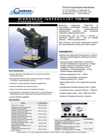 Firma Inżyniersko-Handlowa PL 30-415 Kraków, ul. Wadowicka 12 tel. (012) 261 95 00; fax (012) 267 14 25 [email protected] www.conbest.pl onbest M I K R O S K O P I N S P E K C Y J N Y PSM-1000 STANDARD SYSTEM Nr kat. 270-12-1 Mikroskop inspekcyjny PSM-1000 to nowoczesne rozwiązanie inżynierii optycznej odpowiadającej na zapotrzebowanie współczesnej elektroniki oraz przemysłu materiałów półprzewodnikowych. Przystosowany jest do pracy z laserem w zakresach: 355nm (UV) – 532 nm (światło zielone) – 1064nm (podczerwień). Służy zarówno do kontroli inspekcyjnej układów jak i wprowadzania korekcji przy użyciu lasera. PARAMETRY • głowica typ Siedentopf trinokularowa z trzecim tubusem umożliwiającym podłączenie kamery lub lasera ZASTOSOWANIE • czteropozycyjny regulowany, centrowany rewolwer obiektywowy wyposażony w trójpozycyjny regulator soczewek do prac ze światłem w różnych zakresach 1×UV (ultrafiolet), 1×IR (podczerwień), 2×VIS (zakres światła widzialnego) • pomiar obiektów mikroskopowych za pomocą okularów • zakres powiększenia: 20× ÷ 2000× mikrometrycznych • sporządzanie dokumentacji, analizy lub testów urządzeń z cyfrowym przechowaniem danych • inspekcja z wykorzystaniem dużego powiększenia • naprawa defektów przy pomocy lasera • stacja inżynierska służąca do szybkich inspekcji • zastosowanie w aplikacjach medycznych z wykorzystaniem długodystansowych obiektywów plan apochromatycznych • okulary szerokokątne z korekcją w nieskończoności 10× / 24mm • jedna dopasowana i trzy regulowane pozycje pracy • współosiowe pokrętła regulacji mikro i makro • możliwość pracy z laserem (532nm ÷ 1064nm) • dzielnik wiązki okular - laser 100/0 lub 0/100 • zestaw do bezpiecznej pracy z laserem • analiza defektów waferów AKCESORIA nazwa okular 10x / F.N. 24 obiektyw 5x ELWD (extra long worknig distance) 34mm obiektyw 10x ELWD (extra long worknig distance) 33.5mm obiektyw 20x ELWD (extra long worknig distance) 20mm obiektyw 50x ELWD (extra long worknig distance) 13mm obiektyw 100x ELWD (extra long worknig distance) 6.3mm oświetlacz mikroskop. MLC- 150W (bez światłowodów) światłowód do oświetlacza 2m, giętki (prosty) światłowód do oświetlacza 2m, giętki (zagięty) nr katalogowy Profesjonalne kamery cyfrowe 270-12-1010 270-12-105x 270-12-110x 270-12-120x 270-12-150x do każdego mikroskopu nazwa nr katalogowy Kamera mikroskopowa Moticam-3000 z chłodzącym układem Peltiera: 3 270-51-3000c 270-52-150 MegaPix + oprogramowanie 3.2 Images Advanced 270-52-1504 Kamera mikroskopowa Moticam-5000 z chłodzącym układem Peltiera: 5 270-51-5000c 270-52-1505 MegaPix + oprogramowanie 3.2 Images Advanced © Conbest Sp. z o.o. Firma Inżyniersko-Handlowa; 012/ 261 95 00; e-mail: [email protected]; www.conbest.pl 270-12-1100x