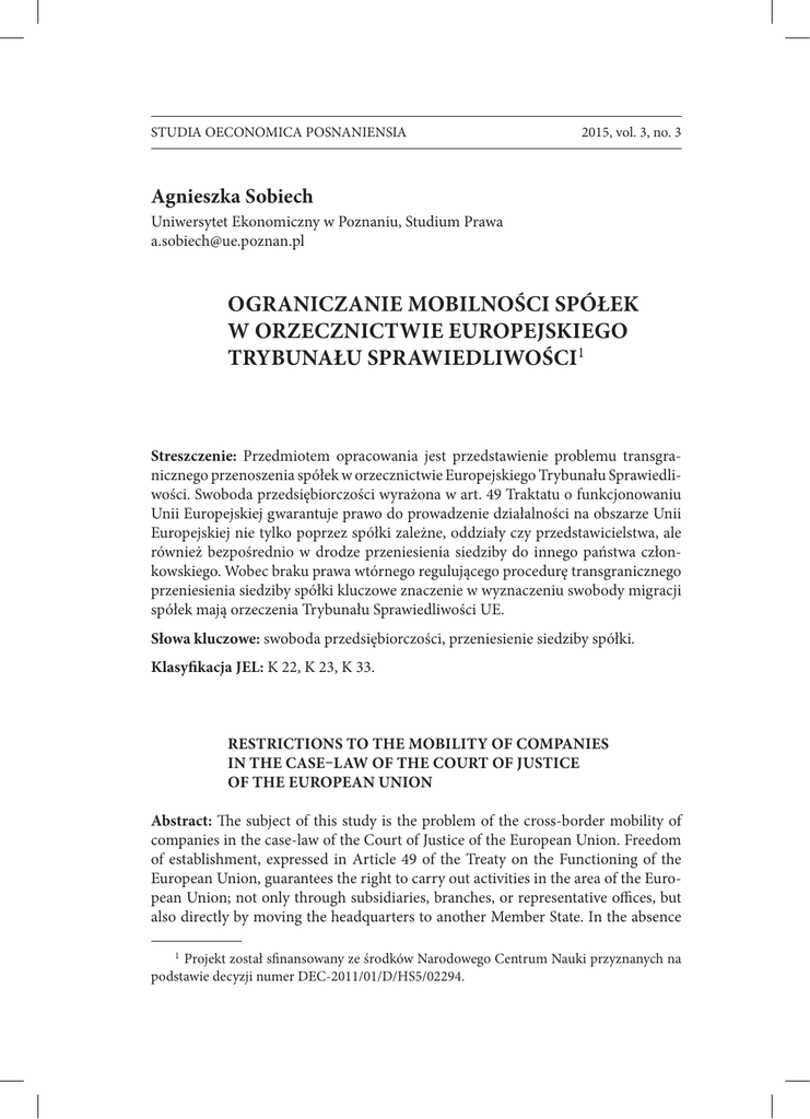 STUDIA OECONOMICA POSNANIENSIA 2015, vol. 3, no. 3 Agnieszka Sobiech Uniwersytet Ekonomiczny w Poznaniu, Studium Prawa [email protected] OGRANICZANIE MOBILNOŚCI SPÓŁEK W ORZECZNICTWIE EUROPEJSKIEGO TRYBUNAŁU SPRAWIEDLIWOŚCI1 Streszczenie: Przedmiotem opracowania jest przedstawienie problemu transgranicznego przenoszenia spółek w orzecznictwie Europejskiego Trybunału Sprawiedliwości. Swoboda przedsiębiorczości wyrażona w art. 49 Traktatu o funkcjonowaniu Unii Europejskiej gwarantuje prawo do prowadzenie działalności na obszarze Unii Europejskiej nie tylko poprzez spółki zależne, oddziały czy przedstawicielstwa, ale również bezpośrednio w drodze przeniesienia siedziby do innego państwa członkowskiego. Wobec braku prawa wtórnego regulującego procedurę transgranicznego przeniesienia siedziby spółki kluczowe znaczenie w wyznaczeniu swobody migracji spółek mają orzeczenia Trybunału Sprawiedliwości UE. Słowa kluczowe: swoboda przedsiębiorczości, przeniesienie siedziby spółki. Klasyfikacja JEL: K 22, K 23, K 33. RESTRICTIONS TO THE MOBILITY OF COMPANIES IN THE CASE–LAW OF THE COURT OF JUSTICE OF THE EUROPEAN UNION Abstract: The subject of this study is the problem of the cross-border mobility of companies in the case-law of the Court of Justice of the European Union. Freedom of establishment, expressed in Article 49 of the Treaty on the Functioning of the European Union, guarantees the right to carry out activities in the area of the European Union; not only through subsidiaries, branches, or representative offices, but also directly by moving the headquarters to another Member State. In the absence Projekt został sfinansowany ze środków Narodowego Centrum Nauki przyznanych na podstawie decyzji numer DEC-2011/01/D/HS5/02294. 1 96 Agnieszka Sobiech of secondary legislation governing the procedures for the cross-border relocation of companies, the rulings of the European Court of Justice are of key importance in determining the free migration of companies. Keywords: freedom of establishment, cross-border relocation of registered office and/or headquarters. Wstęp Postępująca integracja europejska ułatwia przedsiębiorcom dostęp do rynków poszczególnych państw. Wobec konkurencji systemów prawnych państw członkowskich powstają możliwości wyboru miejsca prowadzenia działalności na obszarze Unii Europejskiej. O ile w przypadku przedsiębiorców – osób fizycznych nie ma w zasadzie przeszkód w lokowaniu działalności w państwach członkowskich oraz przenoszeniu centrum swych interesów biznesowych, o tyle w odniesieniu do spółek handlowych kwestia możliwości transgranicznego przenoszenia siedziby nie została jednoznacznie rozwiązana. Mobilność spółek może się odbywać w różnoraki sposób, poprzez: przeniesienie siedziby za granicę z zachowaniem dotychczasowej przynależności [Napierała 2009, s. 430], transgraniczne przekształcenie spółki polegające na zmianie jej formy prawnej z obowiązującej w ramach systemu prawnego jednego państwa w formę funkcjonującą w systemie prawa państwa „przyjmującego” [Karczyński 2011, s. 43; Kołodziej 2014, s. 20] bądź w drodze transgranicznej restrukturyzacji, między innymi w formie fuzji, podziału lub przekształcenia spółek [Napierała 2013, s. 8]. Pierwsze rozwiązanie, najprostsze, w praktyce bywa niemożliwe lub bardzo utrudnione ze względu na regulacje obowiązujące w państwie emigracji skutkujące likwidacją spółki w przypadku podjęcia uchwały o przeniesieniu siedziby za granicę. Podobnie, dla skuteczności przekształcenia transgranicznego, zarówno państwo opuszczane przez spółkę, jak i państwo przyjmujące powinno określać zasady takiej restrukturyzacji, aby spółka traktowana była jako przekształcona na gruncie prawa obu tych państw [Szydło 2008]. Zarówno w pierwszym, jak i w drugim przypadku brak odpowiednich regulacji stanowi poważną barierę w możliwości swobodnego „osiedlania” się spółek. Trzeci sposób, restrukturyzacja, przyjmuje najczęściej formę fuzji spółki, która polega na połączeniu spółki posiadającej swą siedzibę w jednym z państw członkowskich ze spółką utworzoną w innym państwie. Ostatnie rozwiązanie, najbardziej skomplikowane, zostało uregulowane Dyrektywą 2005/56/WE Parlamentu Europejskiego i Rady z dnia 26 października 2005 roku w sprawie Ograniczanie mobilności spółek w orzecznictwie ETS 97 transgranicznego łączenia się spółek kapitałowych. W rezultacie przeniesienie spółki za granicę w drodze transgranicznej fuzji jest obarczone najmniejszym ryzykiem prawnym. Od wielu lat toczą się prace nad wprowadzeniem norm wtórnego prawa wspólnotowego określających jednolite zasady migracji spółek [Ciszewski i Kropka 2012, s. 18 i n.]. Pomimo opracowania projektu Czternastej dyrektywy regulującej problem transgranicznego przenoszenia siedziby [Proposal for a 14th Company Law Directive] do dziś jej nie przyjęto. W obliczu braku aktu normatywnego regulującego procedury przenoszenia spółek, szczególne znaczenie mają orzeczenia Europejskiego Trybunału Sprawiedliwości (ETS). W niniejszym opracowaniu przedstawiono orzecznictwo Trybunału w zakresie transgranicznej mobilności spółek2. 1. Swoboda przedsiębiorczości i jej ograniczenia Prawo do swobodnej migracji spółek na obszarze Unii Europejskiej wynika z zagwarantowanej w Traktacie o funkcjonowaniu Unii Europejskiej (TFUE) swobody przedsiębiorczości. Z art. 49 tego Traktatu (dawny artykuł 43 TWE) wynika, że „ograniczenia swobody przedsiębiorczości obywateli jednego państwa członkowskiego na terytorium innego państwa członkowskiego są zakazane”. Obywatele państw członkowskich mogą korzystać ze swobody traktatowej w ten sposób, że podejmują działalność w którymkolwiek z państw i są traktowani tak jak obywatele tego państwa. Osoba fizyczna może zmieniać miejsce prowadzenia działalności b