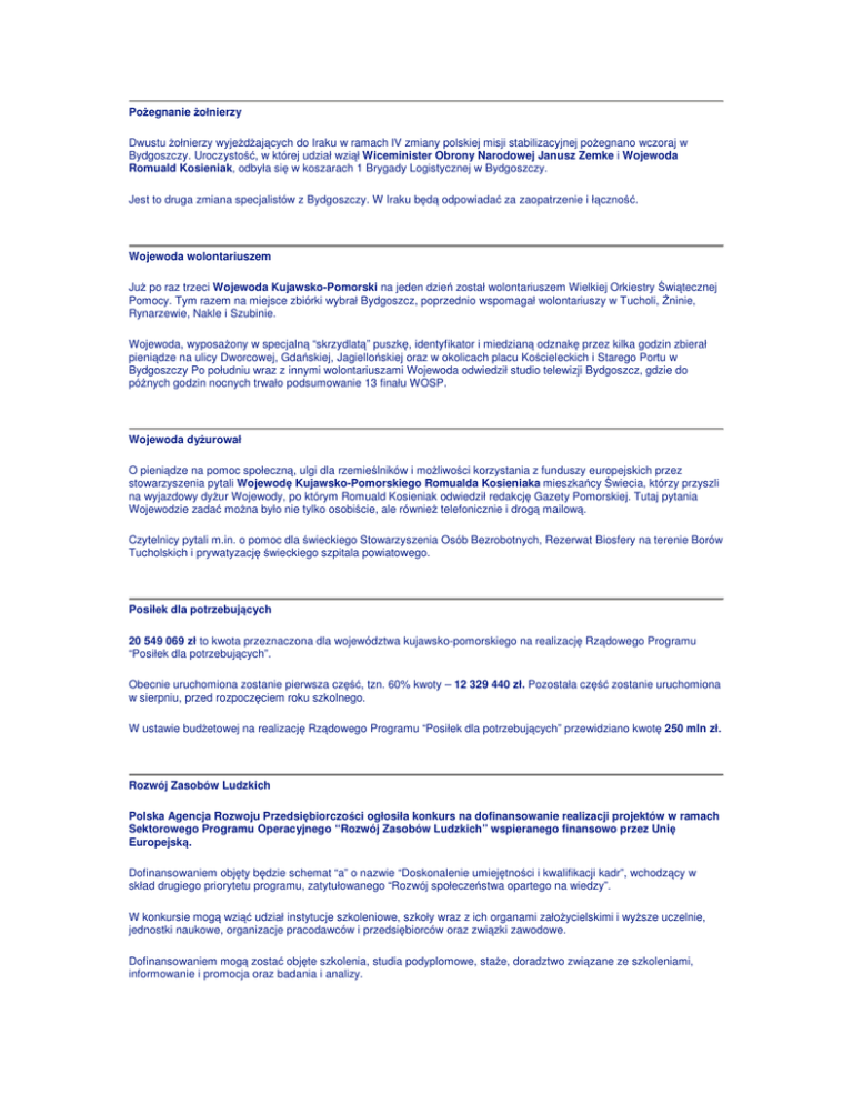 Pożegnanie żołnierzy Dwustu żołnierzy wyjeżdżających do Iraku w ramach IV zmiany polskiej misji stabilizacyjnej pożegnano wczoraj w Bydgoszczy. Uroczystość, w której udział wziął Wiceminister Obrony Narodowej Janusz Zemke i Wojewoda Romuald Kosieniak, odbyła się w koszarach 1 Brygady Logistycznej w Bydgoszczy. Jest to druga zmiana specjalistów z Bydgoszczy. W Iraku będą odpowiadać za zaopatrzenie i łączność. Wojewoda wolontariuszem Już po raz trzeci Wojewoda Kujawsko-Pomorski na jeden dzień został wolontariuszem Wielkiej Orkiestry Świątecznej Pomocy. Tym razem na miejsce zbiórki wybrał Bydgoszcz, poprzednio wspomagał wolontariuszy w Tucholi, Żninie, Rynarzewie, Nakle i Szubinie. Wojewoda, wyposażony w specjalną “skrzydlatą” puszkę, identyfikator i miedzianą odznakę przez kilka godzin zbierał pieniądze na ulicy Dworcowej, Gdańskiej, Jagiellońskiej oraz w okolicach placu Kościeleckich i Starego Portu w Bydgoszczy Po południu wraz z innymi wolontariuszami Wojewoda odwiedził studio telewizji Bydgoszcz, gdzie do późnych godzin nocnych trwało podsumowanie 13 finału WOSP. Wojewoda dyżurował O pieniądze na pomoc społeczną, ulgi dla rzemieślników i możliwości korzystania z funduszy europejskich przez stowarzyszenia pytali Wojewodę Kujawsko-Pomorskiego Romualda Kosieniaka mieszkańcy Świecia, którzy przyszli na wyjazdowy dyżur Wojewody, po którym Romuald Kosieniak odwiedził redakcję Gazety Pomorskiej. Tutaj pytania Wojewodzie zadać można było nie tylko osobiście, ale również telefonicznie i drogą mailową. Czytelnicy pytali m.in. o pomoc dla świeckiego Stowarzyszenia Osób Bezrobotnych, Rezerwat Biosfery na terenie Borów Tucholskich i prywatyzację świeckiego szpitala powiatowego. Posiłek dla potrzebujących 20 549 069 zł to kwota przeznaczona dla województwa kujawsko-pomorskiego na realizację Rządowego Programu “Posiłek dla potrzebujących”. Obecnie uruchomiona zostanie pierwsza część, tzn. 60% kwoty – 12 329 440 zł. Pozostała część zostanie uruchomiona w sierpniu, przed rozpoczęciem roku szkolnego. W ustawie budżetowej na realizację Rządowego Programu “Posiłek dla potrzebujących” przewidziano kwotę 250 mln zł. Rozwój Zasobów Ludzkich Polska Agencja Rozwoju Przedsiębiorczości ogłosiła konkurs na dofinansowanie realizacji projektów w ramach Sektorowego Programu Operacyjnego “Rozwój Zasobów Ludzkich” wspieranego finansowo przez Unię Europejską. Dofinansowaniem objęty będzie schemat “a” o nazwie “Doskonalenie umiejętności i kwalifikacji kadr”, wchodzący w skład drugiego priorytetu programu, zatytułowanego “Rozwój społeczeństwa opartego na wiedzy”. W konkursie mogą wziąć udział instytucje szkoleniowe, szkoły wraz z ich organami założycielskimi i wyższe uczelnie, jednostki naukowe, organizacje pracodawców i przedsiębiorców oraz związki zawodowe. Dofinansowaniem mogą zostać objęte szkolenia, studia podyplomowe, staże, doradztwo związane ze szkoleniami, informowanie i promocja oraz badania i analizy. W województwie kujawsko – pomorskim wnioski przyjmuje Toruńska Agencja Rozwoju Regionalnego w Toruniu, ul. Kopernika 4, pokój 13, tel. (056) 621-04-21, wew. 21. W tym roku kolejne terminy składania wniosków upływają 11 marca, 11 maja, 11 lipca, 12 września i 14 listopada. Konkurs trwa do końca grudnia przyszłego roku, a kolejne terminy składania wniosków zostaną określone w styczniu 2006 r. Informacje dla projektodawców o możliwościach wsparcia z Europejskiego Funduszu Społecznego zawiera “Poradnik dla Beneficjentów” są na stronie internetowej www.efs.gov.pl Wszystkie potrzebne dokumenty do wypełnienia znajdują się na stronie http://www.parp.gov.pl/efs1.html (Generator Wniosków) oraz na stronie Toruńskiej Agencji Rozwoju Regionalnego. W latach 2004 – 2006 na program ten Polska wyda 253 tys. euro. W tym mieści się 190 tys. euro z Europejskiego Funduszu Społecznego. Obradowało Prezydium Wojewódzkiej Komisji Dialogu Społecznego. Obradowało Prezydium Wojewódzkiej Komisji Dialogu Społecznego. Tematem spotkania były warunki i możliwości przekazania miastu Ciechocinek zabytkowego basenu termosolankowego. W spotkaniu udział wzięli min. prezes Państwowego Uzdrowiska Ciechocinek, burmistrz Ciechocinka, posłowie Krystian Łuczak i Marek Olewiński. Prezydium WKDS jednogłośnie przyjęło wniosek, zgodnie z którym WKDS wystąpi do Ministra Skarbu z wnioskiem o podjecie działań, które pozwolą na przekazanie zabytkowego basenu termosolankowego na rzecz samorządu. W związku z faktem, że Prezes Państwowego Uzdrowiska Ciechocinek nie widzi aktualnie żadnych możliwości finansowania remontu niszczejącego obiektu z funduszy uzdrowiskowych, popiera przekazanie gminie basenu w zamian za podjęte przez burmistrza i radę zobowiązania dotyczące m.in. zwolnienia z opłaty eksploatacyjnej czy bezpłatnych dostaw wody do obiektów będących własnością uzdrowiska. Samorząd ze swojej strony deklaruje się do przeprowadzenia remontu i zabezpieczenia funkcjonowania basenu, po uzyskaniu prawa własności. Sportowiec Roku Kamerę cyfrową z życzeniami, aby filmował wszystkie sukcesy sportowców z naszego regionu przekazał Wojewoda Romuald Kosieniak Mirosławowi Piesakowi, laureatowi trzeciego miejsca w plebiscycie czytelników Gazety Pomorskiej na Najpopularniejszego Sportowca Regionu 2004 r. Najpopularniejszym Sportowcem Regionu 2004 r. w 42 plebiscycie organizowanym przez redakcję “Gazety Pomorskiej”, został Robert Sycz z RTW Bydgostia, mistrz olimpijski z Sydney i Aten. Głosujący w plebiscycie czytelnicy Gazety nadesłali ponad 20 tys. kuponów. Na wczorajszej gali podsumowującej plebiscyt gościem honorowym była Teresa Ciepły Samochód dla inowrocławskich strażaków Romuald Kosieniak – Wojewoda Kujawsko Pomorski, starszy brygadier Krzysztof Kowalski – Komendant Wojewódzki Państwowe