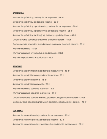 SPÓDNICA Skracanie spódnicy podszycie maszynowe - 16 zł Skracanie spódnicy podszycie ręczne - 20 zł Skracanie spódnicy z podszewką podszycie maszynowe - 20 zł Skracanie spódnicy z podszewką podszycie ręczne - 25 zł Skracanie spódnicy fantazyjnej (falbany, godety, tiule) - 40 zł Dopasowanie spódnicy paskiem, bokami i dołem - 45 zł Dopasowanie spódnicy z podszewką paskiem, bokami, dołem - 55 zł Wymiana zamka - 15 zł Wymiana zamka krytego lub z podszewką - 20 zł Wymiana podszewki w spódnicy - 35 zł SPODNIE Skracanie spodni tkanina podszycie maszynowe - 16 zł Skracanie spodni tkanina podszycie ręczne - 20 zł Skracanie spodni dzianina - 15 zł Skracanie spodni jeansowych - 20 zł Wymiana zamka spodnie tkanina - 15 zł Wymiana zamka spodnie jeansowe - 17 zł Dopasowywanie spodni tkanina, paskiem, nogawkami i dołem - 35 zł Dopasowanie spodni jeansowych paskiem, nogawkami i dołem – 45 zł SUKIENKA Skracanie sukienki prostej podszycie maszynowe - 25 zł Skracanie sukienki prostej podszycie ręczne - 30 zł Skracanie sukienki prostej z podszewką podszycie maszynowe - 30 zł Skracanie sukienki prostej z podszewką podszycie ręczne - 35 zł Skracanie sukienki fantazyjnej, wielowarstwowej maszynowe - 50 zł Skracanie sukienki fantazyjnej, wielowarstwowej ręczne - 70 zł Dopasowywanie sukienki - 60 zł Wymiana podszewki - 45 zł Wymiana zamka do 25cm - 20 zł Wymiana zamka powyżej 25cm - 30 zł BLUZKA – KOSZULA Skracanie bluzki – koszuli - 20 zł Skracanie bluzki dzianina - 15 zł Skracanie rękawów dzianina - 15 zł Skracanie rękawów z mankietem - 30 zł Skracanie rękawów górą - 30 zł Dopasowanie bokami, dołem, rękawami, kołnierzem - 40 zł Wymiana zamka - 25 zł ŻAKIET – MARYNARKA Skracanie żakietu - marynarki bez podszewki - 30 zł Skracanie żakietu – marynarki z podszewką - 40 zł Skracanie rękawów żakiet – marynarka dołem - 30 zł Skracanie rękawów żakiet – marynarka górą - 45 zł Dopasowywanie bokami, dołem i rękawami - 50 zł Wymiana podszewki w żakiecie – marynarce – 60 zł Wymiana zamka – 30 zł PŁASZCZ Skracanie płaszcza z podszewką - 50 zł Skracanie rękawa płaszcz dołem - 35 zł Skracanie rękawa płaszcza górą - 40 zł Dopasowywanie płaszcza bokami, dołem, rękawem - 60 zł Wymiana podszewki płaszcz - 60 zł KURTKA Skracanie kurtki - 40 zł Skracanie rękawa dołem - 30 zł Dopasowanie kurtki bokami, dołem, rękawem - 50 zł Wymiana zamka bez podszewki - 25 zł Wymiana zamka z podszewką – ociepleniem - 35 zł Wymiana zamków w kieszeniach - 25 zł INNE Szycie miarowe bluzki- tuniki dzianina - 40 zł Szycie miarowe koszuli - 50 zł Szycie miarowe żakietu - 80 zł Szycie miarowe spódnicy - 40 zł Szycie miarowe spódnicy z podszewką - 60 zł Szycie miarowe spódnicy fantazyjnej - 90 zł Szycie miarowe spodni - 60 zł Szycie miarowe spodni typu dres - 40 zł Szycie miarowe sukienki prostej - 140 zł Szycie miarowe sukienki fantazyjnej - 200 zł Szycie miarowe płaszcza - 200 zł Uszycie poszewek ozdobnych na poduszki - 15 zł/szt Uszycie pokrowców na krzesła - 20 zł/ szt Uszycie narzuty 2,5 / 2,5 m - 50 zł Uszycie pościelowego - 40 zł Przyszycie taśmy do marszczeń do firan, zasłon 4 - 7 zł/mb Obszycie obrusa , firan, zasłon - 4 - 6 zł/mb Haft komputerowy litera - 4 zł – 6 zł Haft ozdobny komputerowy - 20 zł - 35 zł Cerowanie maszynowe spodni - 15 zł Wstawianie łat na odzieży - 20 zł Pozostałe szycie odzieży lub innych elementów garderoby ceny uzgadniane indywidualnie. Wymiana lub naprawa uszkodzonych elementów odzieży i garderoby - ceny ustalane indywidualnie.