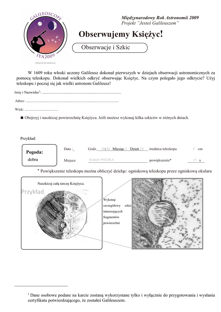 Międzynarodowy Rok Astronomii 2009 Projekt ”Jesteś Galileuszem” Obserwujemy Księżyc! Obserwacje i Szkic W 1609 roku włoski uczony Galileusz dokonał pierwszych w dziejach obserwacji astronomicznych za pomocą teleskopu. Dokonał wielkich odkryć obserwując Księżyc. Na czym polegało jego odkrycie? Użyj teleskopu i poczuj się jak wielki astronom Galileusz! Imię i Nazwisko1: ..................................................................................... Adres: .................................................................................................... Wiek: .................................... ■ Obejrzyj i naszkicuj powierzchnię Księżyca. Jeśli możesz wykonaj kilka szkiców w różnych dniach. Przykład: Pogoda: dobra Data :_ Miejsce Godz. 18:30 Miesiąc 2 Dzień 24 Kraków POLSKA średnica teleskopu 4 cm powiększenie* 15 x * Powiększenie teleskopu można obliczyć dzieląc: ogniskową teleskopu przez ogniskową okularu Naszkicuj całą tarczę Księżyca. Przykład Wykonaj szczegółowy szkic interesujących fragmentów powierzchni 1 Dane osobowe podane na karcie zostaną wykorzystane tylko i wyłącznie do przygotowania i wysłania certyfikatu potwierdzającego, że zostałeś Galileuszem. Data Godz. : Miesiąc Dzień średnica teleskopu cm Dzień1 pogoda: Dzień 2 pogoda: Miejsce Data Miejsce Godz. : Miesiąc Dzień Powiększenie x średnica teleskopu cm Powiększenie x Dzień 3 pogoda: Data Miejsce Godz. : Miesiąc Dzień średnica teleskopu Powiększenie Wykonaj tyle obserwacji ile zdołasz ▪Opisz poniżej swoje obserwacje tarczy Księżyca i zanotuj wszystkie spostrzeżenia. cm x Podsumowanie obserwacji: Na podstawie własnych obserwacji i obserwacji Galileusza, możesz zauważyć, że zarówno widoczna część powierzchni Księżyca, jak i jego kształt zmieniają się w kolejnych dniach. Kopia szkiców powierzchni Księżyca wykonanych przez Galileusza Teraz popatrz na mapę Księżyca i znajdź fragment powierzchni, który chcesz szczegółowo naszkicować. Jaką nazwę nosi ten obszar? *Możesz pobrać mapę Księżyca ze strony : http://www.as.up.krakow.pl/edu/prog.html#mapy_ks ■ Na powierzchni Księżyca można wyróżnić morza, kratery i góry księżycowe. Czy zauważyłeś je podczas obserwacji i w swoich szkicach? Zaznacz je na rysunku i podpisz. - Kratery: wgłębienia na powierzchni Księżyca. Większość jest okrągła. - Maria (Morza), lacus (Jeziora), sinus (Zatoki): ciemniejsze fragmenty powierzchni. Chociaż nazwane zostały morzami pokryte są skałami i nie ma w nich wody. Mają niewiele kraterów i są płaskie - Góry księżycowe: obszary, w których uformowały się wysokie wzniesienia, podobne do gór na Ziemi. Następnie dowiedzmy się, dlaczego Księżyc ma fazy. Zjawisko to wynika ze zmieniającego się położenia Ziemi, Księżyca i Słońca względem siebie. Księżyc krąży wokół Ziemi jak na rysunku poniżej. Narysuj jak zmienia się wygląd Księżyca obserwowanego z Ziemi. Kierunek padania promieni słonecznych Kiedy obserwujemy Księżyc przez teleskop jego widok może być odwrócony Orbita Księżyca Księżyc Ziemia Na podstawie swoich obserwacji narysuj zauważone zmiany wyglądu Księżyca począwszy od wąskiego sierpa podobnego do brzuszka litery D poprzez pełnię (litera O) i sierp podobny do litery C. Czy wygląd księżyca ma związek z porą, kiedy można go obserwować na niebie? ■ Opisz poniżej swoje spostrzeżenia dotyczące wyglądu tarczy Księżyca. Wypełnioną kartę przyślij na adres: Instytut Fizyki Uniwersytetu Pedagogicznego ul. Podchorążych 2 30-084 Kraków z dopiskiem: „Jestem Galileuszem” Dane osobowe podane na karcie zostaną wykorzystane tylko i wyłącznie do przygotowania i wysłania certyfikatu potwierdzającego, że zostałeś Galileuszem. Autorzy najlepszych prac obserwacyjnych na zakończenie Międzynarodowego Roku Astronomii, nagrodzeni zostaną nagrodami rzeczowymi (m. in. teleskop, książki, mapy nieba)
