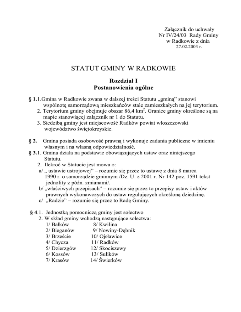 Załącznik do uchwały Nr IV/24/03 Rady Gminy w Radkowie z dnia 27.02.2003 r. STATUT GMINY W RADKOWIE Rozdział I Postanowienia ogólne § 1.1.Gmina w Radkowie zwana w dalszej treści Statutu „gminą” stanowi wspólnotę samorządową mieszkańców stale zamieszkałych na jej terytorium. 2. Terytorium gminy obejmuje obszar 86,4 km2. Granice gminy określone są na mapie stanowiącej załącznik nr 1 do Statutu. 3. Siedzibą gminy jest miejscowość Radków powiat włoszczowski województwo świętokrzyskie. § 2. Gmina posiada osobowość prawną i wykonuje zadania publiczne w imieniu własnym i na własną odpowiedzialność. § 3.1. Gmina działa na podstawie obowiązujących ustaw oraz niniejszego Statutu. 2. Ilekroć w Statucie jest mowa o: a/ „ ustawie ustrojowej” – rozumie się przez to ustawę z dnia 8 marca 1990 r. o samorządzie gminnym /Dz. U. z 2001 r. Nr 142 poz. 1591 tekst jednolity z późn. zmianami/. b/ „właściwych przepisach” – rozumie się przez to przepisy ustaw i aktów prawnych wykonawczych do ustaw regulujących określoną dziedzinę. c/ „Radzie” – rozumie się przez to Radę Gminy. § 4.1. Jednostką pomocniczą gminy jest sołectwo 2. W skład gminy wchodzą następujące sołectwa: 1/ Bałków 8/ Kwilina 2/ Bieganów 9/ Nowiny-Dębnik 3/ Brzeście 10/ Ojsławice 4/ Chycza 11/ Radków 5/ Dzierzgów 12/ Skociszewy 6/ Kossów 13/ Sulików 7/ Krasów 14/ Świerków 2 § 5.1. O utworzeniu, zniesieniu, połączeniu i podziale jednostki pomocniczej rozstrzyga Rada w drodze uchwały. 2. Inicjatorem utworzenia, zniesienia, połączenia, podziału jednostki pomocniczej mogą być mieszkańcy, których ta jednostka obejmuje lub ma obejmować oraz organy gminy. 3. Utworzenie, zniesienie, połączenie, podział jednostki pomocniczej winno być poprzedzone przeprowadzeniem konsultacji z mieszkańcami w sposób określony przez Radę w odrębnej uchwale. 4. Projekt granic jednostki pomocniczej sporządza Wójt w uzgodnieniu z inicjatorem utworzenia, zniesienia, połączenia, podziału tej jednostki. 5. Przebieg granic powinien – w miarę możliwości uwzględnić naturalne uwarunkowania przestrzenne, komunikacyjne i więzi społeczne. § 6. Wybory sołtysów i rad sołeckich zarządza Rada w drodze uchwały w terminie trzech miesięcy od dnia wyborów Rady nowej kadencji. § 7. Organizację i zakres działania jednostki pomocniczej określa Rada odrębnym statutem, po przeprowadzeniu konsultacji z mieszkańcami. § 8. Granice jednostek pomocniczych określone są na mapie stanowiącej załącznik nr 1 do Statutu. Rozdział II Zakres działania i zadania gminy. § 9. Do zakresu działania gminy należą wszystkie sprawy publiczne o znaczeniu lokalnym, nie zastrzeżone właściwymi przepisami na rzecz innych podmiotów. §10.1. Gmina realizuje zadania: 1/ własne określone ustawą ustrojową 2/ zlecone z zakresu administracji rządowej określone właściwymi przepisami, 3/ powierzone z zakresu administracji rządowej i samorządowej /powiatu i województwa/ przejęte na podstawie porozumienia, 2. W szczególności zadania własne obejmują sprawy: 1/ ładu przestrzennego, gospodarki nieruchomościami, ochrony środowiska i przyrody oraz gospodarki wodnej, 2/ gminnych dróg, mostów, placów oraz organizacji ruchu drogowego, 3/ wodociągów i zaopatrzenia w wodę, kanalizacji, usuwania i oczyszczania ścieków komunalnych, utrzymania czystości i porządku oraz urządzeń sanitarnych, wysypisk i unieszkodliwiania odpadów 3 komunalnych, zaopatrzenia w energię elektryczną i cieplną oraz gaz, 4/ lokalnego transportu zbiorowego, 5/ ochrony zdrowia, 6/ pomocy społecznej, w tym ośrodków i zakładów opiekuńczych, 7/ gminnego budownictwa mieszkaniowego, 8/ edukacji publicznej, 9/ kultury fizycznej i turystyki w tym terenów rekreacyjnych i urządzeń sportowych, 10/ kultury, w tym bibliotek gminnych i innych placówek upowszechniania kultury, 11/ targowisk i hal targowych, 12/ zieleni gminnej i zadrzewień, 13/ cmentarzy gminnych, 14/ porządku publicznego i bezpieczeństwa obywateli oraz ochrony przeciwpożarowej i przeciwpowodziowej, w tym wyposażenia i utrzymania gminnego magazynu przeciwpowodziowego, 15/ utrzymanie gminnych obiektów i urządzeń użyteczności publicznej oraz obiektów administracyjnych, 16/ polityki prorodzinnej, w tym zapewnienia kobietom w ciąży opieki socjalnej, medycznej i prawnej, 17/ wspierania i upowszechniania idei samorządowej, 18/ promocji gminy, 19/ współpracy z organizacjami pozarządowymi, 20/ współpracy ze społecznościami lokalnymi i regionalnymi innych państw. § 11.1. W celu wykonywania zadań gmina może tworzyć gminne jednostki organizacyjne, 2. Wykaz gminnych jednostek organizacyjnych stanowi załącznik nr 2 do statutu. § 12. Dla wspólnego wykonywania zadań publicznych gmina może przystępować do związków gmin lub zawierać porozumienia z innymi jednostkami samorządu, w tym z organizacjami pozarządowymi na zasadach określonych w ustawie ustrojowej. § 13. Gmina wykonuje swoje zadania poprzez: 1/ działalność swych organów i organów jednostek pomocniczych, 2/ gminne jednostki organizacyjne, 3/ działalności innych podmiotów na podstawie zawartych z nimi porozumień. 4 § 14. Gmina może prowadzić działalność gospodarczą wykraczającą poza zadania o charakterze użyteczności publicznej wyłącznie w przypadkach określonych we właściwych przepisach. Rozdział III Zasady jawności działalności organów gminy. § 15.1. 2. 3. 4. 5. 6. 7. 8. 9. 10. Działalność organów gminy jest jawna. Ograniczenia jawności mogą wynikać wyłącznie z ustaw. Jawność organów gminy oznacza prawo mieszkańców do: - uzyskiwania informacji, - wstępu na sesje Rady , - wstępu na posiedzenia Komisji Rady, - dostępu do dokumentów wynikających z wykonywania zadań publicznych, w tym protokołów posiedzeń Rady i Komisji Rady. Uprawnionym do dostępu do dokumentów i korzystania z nich j