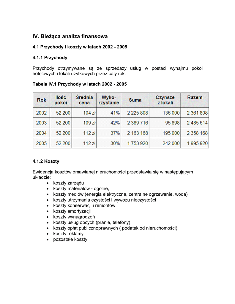 IV. Bieżąca analiza finansowa 4.1 Przychody i koszty w latach 2002 - 2005 4.1.1 Przychody Przychody otrzymywane są ze sprzedaży usług w postaci wynajmu pokoi hotelowych i lokali użytkowych przez cały rok. Tabela IV.1 Przychody w latach 2002 - 2005 4.1.2 Koszty Ewidencja kosztów omawianej nieruchomości przedstawia się w następującym układzie: koszty zarządu koszty materiałów - ogólne, koszty mediów (energia elektryczna, centralne ogrzewanie, woda) koszty utrzymania czystości i wywozu nieczystości koszty konserwacji i remontów koszty amortyzacji koszty wynagrodzeń koszty usług obcych (pranie, telefony) koszty opłat publicznoprawnych ( podatek od nieruchomości) koszty reklamy pozostałe koszty Tabela IV.2. Koszty w latach 2002 - 2005 4.2 Przychody i koszty - specyfikacja poszczególnych pozycji i wartości łącznych Tabela IV.3. Budżet operacyjny w latach 2002 - 2005 Jak wynika z tabeli IV.3. nieruchomość w stanie istniejącym przynosi dochód. Przychody czerpie z tytułu prowadzonej działalności gospodarczej z wynajmu pokoi i lokali użytkowych. Wolne środki są lokowane na lokatach terminowych w banku. Z powyższej tabeli można wyczytać, że przychody, a tym samych dochód w 2005 roku drastycznie się obniżył. Przyczyną tego stanu rzeczy jest pojawienie się konkurencji na rynku hotelarskim przedstawiającej do sprzedaży piękne nowoczesne wnętrza.. Przedmiotowa nieruchomość nie została doinwestowana w ostatnich latach i tego konsekwencje widać w dochodach. Brak nakładów remontowo-inwestycyjnych w dalszym ciągu spowoduje, że tendencja ta utrzyma się w kolejnych latach. 4.3. Wskaźnik rentowności gotówkowej Wskaźniki rentowności gotówkowej stosowane w ujęciu bieżącym oraz efektywnym są miarą wyników finansowych zarządzania, odnoszącą się do skumulowanych wyników rocznych, natomiast wartość rynkowa nieruchomości odnosi się do początku danego roku. W ten sposób powstaje wskaźnik bieżącej rentowności kapitałów łącznych. Dochód operacyjny netto/Wartość rynkowa nieruchomości 466 990/3 891 583 = 0,12 = 12% Wskaźnik określa, że stopa zwrotu na kapitałach łącznych wynosi 12%. 4.4. Możliwości zwiększenia przychodów oraz zmniejszenia kosztów Przeprowadzane prace remontowo-modernizacyjne, które będą prowadzone w latach 2006 - 2008 spowodują, że nieruchomość ta będzie generowała dochód poprzez zwiększony wynajem pokoi wówczas wykorzystanie bazy noclegowej może wzrosnąć od 10 do 15%. Podwyższą również wartość nieruchomości. Z analizy preferencji klientów wynika, że zwiększona sprzedaż może nastąpić, gdy sanitariaty będą wyremontowane. Natomiast w celu obniżenia kosztów eksploatacji należy dokonać termomodernizacji nieruchomości poprzez docieplenie ścian stropodachu, piwnic, wymiany pozostałej stolarki okiennej. Inwestycja pozwoli na obniżenie kosztów zakupu energii cieplnej o 30%. Budynek jest w dobrym stanie technicznym, częściowo docieplony - ściany szczytowe. Współczynnik przenikania ciepła „k” dla przegród zewnętrznych wynosi 1,16 W/m2*K, po dokonaniu izolacji termicznej 14-centymetrową warstwą wyniesie 0,24, a 16-centymetrową 0,21 W/m2*K. 4.5. Źródła finansowania Źródłem finansowania nieruchomości są wpłaty z wynajmu pokoi. Potencjalnym źródłem jest fundusz rezerwowy właściciela, który inwestując środki w obiekt, podniósłby jego wartość, jednocześnie zwiększając dochody. 4.6. Określenie wartości nieruchomości Metodyka szacowania nieruchomości Wartość rynkowa nieruchomości użytkowej uwarunkowana jest przyszłym przeznaczeniem i wielkością generowanego przez nią dochodu. Mając na celu oszacowanie nieruchomości do transakcji kupna sprzedaży, do obliczeń przyjęto wartość rynkową dla aktualnego sposobu użytkowania (WRU), przy założeniu najefektywniejszego i najlepszego wykorzystania nieruchomości przez właściciela. Według „Rozporządzenia Rady Ministrów z 7 lipca 1998 r. w sprawie szczególnych zasad wyceny nieruchomości oraz zasad i trybu sporządzania operatu szacunkowego” wartość rynkową określa się, stosując podejście porównawcze lub podejście dochodowe metodą inwestycyjną, techniką kapitalizacji prostej. Przy podejściu porównawczym konieczna jest znajomość cen transakcyjnych nieruchomości podobnych do nieruchomości będącej przedmiotem wyceny, a także tych nieruchomości wpływających na poziom ich cen. W podejściu porównawczym stosuje się metodę porównywania parami albo metodę analizy statystycznej rynku. Przy metodzie porównywania parami porównuje się nieruchomość będącą przedmiotem wyceny, której cechy są znane, kolejno z nieruchomościami podobnymi, które były przedmiotem obrotu rynkowego i dla których znane są ceny transakcyjne, warunki zawarcia transakcji, a także cechy tych nieruchomości. Przy metodzie analizy statystycznej rynku do porównań określonych wcześniej przyjmuje się grupę nieruchomości reprezentatywnych dla rynku właściwego miejscowo ze względu na miejsce wycenianej nieruchomości, jeżeli byłyby one przedmiotem obrotu rynkowego i dla których znane są ceny transakcyjne, warunki zawarcia transakcji, a także cechy tych nieruchomości. Podejście dochodowe stosuje się przy określaniu wartości nieruchomości przynoszących dochód lub mogących przynosić dochód, pod warunkiem, że wysokość tego dochodu jest znana lub możliwa do określenia. Przy stosowaniu tego podejścia konieczna jest znajomość dochodu uzyskiwanego lub możliwego do uzyskania z dochodów z nieruchomości. Dochód ten odnosi się do budynku i gruntu łącznie. Nabywca nie zapłaci za nieruchomość więcej, niż spodziewa się z niej uzyskać, natomiast właściciel nie sprzeda za mniejszą cenę niż równowartość dochodów w określonym czasie. Wpływy z wynajmu pokoi i powierzchni użytkowej w formie dochodu stanowić mogą podstawę jej wyceny 
