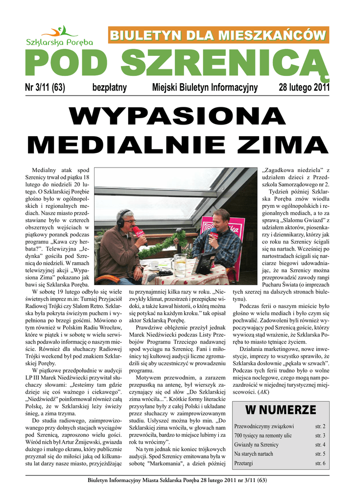 BIULETYN DLA MIESZKAŃCÓW POD SZRENICą Nr 3/11 (63) bezpłatny Miejski Biuletyn Informacyjny 28 lutego 2011 WYPASIONA MEDIALNIE ZIMA Medialny atak spod Szrenicy trwał od piątku 18 lutego do niedzieli 20 lutego. O Szklarskiej Porębie głośno było w ogólnopolskich i regionalnych mediach. Nasze miasto przedstawiane było w czterech obszernych wejściach w piątkowy poranek podczas programu „Kawa czy herbata?”. Telewizyjna „Jedynka” gościła pod Szrenicą do niedzieli. W ramach telewizyjnej akcji „Wypasiona Zima” pokazano jak bawi się Szklarska Poręba. W sobotę 19 lutego odbyło się wiele świetnych imprez m.in: Turniej Przyjaciół Radiowej Trójki czy Slalom Retro. Szklarska była pokryta świeżym puchem i wypełniona po brzegi gośćmi. Mówiono o tym również w Polskim Radiu Wrocław, które w piątek i w sobotę w wielu serwisach podawało informację o naszym mieście. Również dla słuchaczy Radiowej Trójki weekend był pod znakiem Szklarskiej Poręby. W piątkowe przedpołudnie w audycji LP III Marek Niedźwiecki przywitał słuchaczy słowami: „Jesteśmy tam gdzie dzieje się coś ważnego i ciekawego”. „Niedźwiedź” poinformował również całą Polskę, że w Szklarskiej leży świeży śnieg, a zima trzyma. Do studia radiowego, zaimprowizowanego przy dolnych stacjach wyciągów pod Szrenicą, zaproszono wielu gości. Wśród nich był Artur Żmijewski, gwiazda dużego i małego ekranu, który publicznie przyznał się do miłości jaką od kilkunastu lat darzy nasze miasto, przyjeżdżając tu przynajmniej kilka razy w roku. „Niezwykły klimat, przestrzeń i przepiękne widoki, a także kawał historii, o którą można się potykać na każdym kroku.” tak opisał aktor Szklarską Porębę. Prawdziwe oblężenie przeżył jednak Marek Niedźwiecki podczas Listy Przebojów Programu Trzeciego nadawanej spod wyciągu na Szrenicę. Fani i miłośnicy tej kultowej audycji liczne zgromadzili się aby uczestniczyć w prowadzeniu programu. Motywem przewodnim, a zarazem przepustką na antenę, był wierszyk zaczynający się od słów „Do Szklarskiej zima wróciła...”. Krótkie formy literackie przysyłane były z całej Polski i układane przez słuchaczy w zaimprowizowanym studiu. Usłyszeć można było min. „Do Szklarskiej zima wróciła, w głowach nam przewróciła, bardzo to miejsce lubimy i za rok tu wrócimy”. Na tym jednak nie koniec trójkowych audycji. Spod Szrenicy emitowana była w sobotę "Markomania", a dzień później „Zagadkowa niedziela” z udziałem dzieci z Przedszkola Samorządowego nr 2. Tydzień później Szklarska Poręba znów wiodła prym w ogólnopolskich i regionalnych mediach, a to za sprawą „Slalomu Gwiazd” z udziałem aktorów, piosenkarzy i dziennikarzy, którzy jak co roku na Szrenicy ścigali się na nartach. Wcześniej po nartostradach ścigali się narciarze biegowi udowadniając, że na Szrenicy można przeprowadzić zawody rangi Pucharu Świata (o imprezach tych szerzej na dalszych stronach biuletynu). Podczas ferii o naszym mieście było głośno w wielu mediach i było czym się pochwalić. Zadowoleni byli również wypoczywający pod Szrenicą goście, którzy wywiozą stąd wrażenie, że Szklarska Poręba to miasto tętniące życiem. Działania marketingowe, nowe inwestycje, imprezy to wszystko sprawiło, że Szklarska dosłownie „pękała w szwach”. Podczas tych ferii trudno było o wolne miejsca noclegowe, czego mogą nam pozazdrościć w niejednej turystycznej miejscowości. (AK) W NUMERZE Przewodniczymy związkowi str. 2 700 tysięcy na remonty ulic str. 3 Gwiazdy na Szrenicy str. 4 Na starych nartach str. 5 Przetargi str. 6 Biuletyn Informacyjny Miasta Szklarska Poręba 28 lutego 2011 nr 3/11 (63) PRZEWODNICZYMY ZWIąZKOWI Mirosław Kupis, wiceprzewodniczący Rady Miasta Szklarskiej Poręby, został wybrany na przewodniczącego Zgromadzenia Związku Gmin Karkonoskich. Jest to najwyższa funkcja w tej strukturze. Mirosław Kupis jest delegatem Szklarskiej Poręby w ZGK od trzech kadencji. Związek Gmin Karkonoskich dotychczas zrzeszał 6 gmin Kotliny Jeleniogórskiej, ale kolejnym członkiem zostaje Jelenia Góra. Tym samym będzie to reprezentatywne forum komunalne całego powiatu. Związek zajmuje się przede wszystkim działalnością związaną z ochroną środowiska. Jest właścicielem nowoczesnego Karkonoskiego Centrum Gospodarki Odpadami w Ścięgnach. W ostatnich latach ZGK, z różnym skut- kiem, podejmuje próby promocji regionu. Zajmuje się inicjowaniem dyskusji, inicjatyw społecznych i działań gospodarczych związanych z rozwojem turystyki. Jest też jednym z założycieli KSWiK, spółki wodociągowokanalizacyjnej, której akt założycielski wymaga poważnej modernizacji, bowiem spółka nie spełnia pierwotnych oczekiwań (najdelikatniej to ujmując). Po przystąpieniu Jeleniej Góry Związek stanie przed nowymi wyzwaniami. Jednym z najważniejszych, jak się wydaje, jest działalność związana z rozwojem turystyki, jako głównego motoru napędowego gospodarki całej Kotliny Jeleniogórskiej. Nie chodzi tylko o profesjonalną wspólną promocję, lecz o kompleksowe marketingowe podejście do sprawy. Dopiero wówczas, jako region, będziemy mogli sprostać konkurencji, nie tylko w Polsce, ale i w Europie.(red) IDZIEMY NA WOJNĘ? Tkacze. Do 1958 roku dzielnica Szklarskiej Poręby. „Jednak w wyniku podpisanej 10 października 1958 umowy międzypaństwowej wieś Tkacze, wraz z całkowicie niezamieszkanym już wówczas przysiółkiem Zieliniec (na mapach także jako Zieleniec) oddana została przez Polskę Czechosłowacji. W zamian za to Czechosłowacja przekazała Polsce położony w pobliżu południowy stok góry Kocierz i fragment północnego stoku góry Mrtvý vrch o tej samej powierzchni.” Tyle historii nowej, opisanej w Wikipedii, lecz nie najnowszej. Najnowsza jest datowana na 7 dzień lutego 2011 roku. Tego dnia z Ministerstwa Spraw Wewnętrzny
