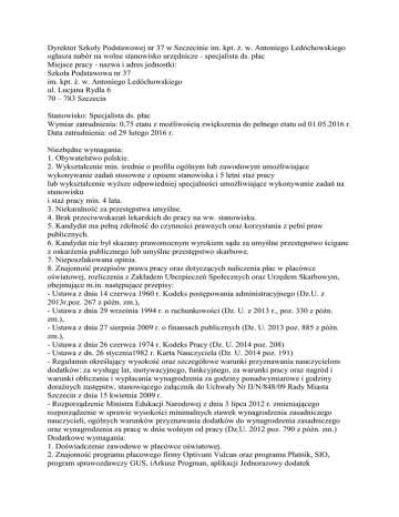 Dyrektor Szkoły Podstawowej nr 37 w Szczecinie im. kpt. ż. w. Antoniego Ledóchowskiego ogłasza nabór na wolne stanowisko urzędnicze - specjalista ds. płac Miejsce pracy - nazwa i adres jednostki: Szkoła Podstawowa nr 37 im. kpt. ż. w. Antoniego Ledóchowskiego ul. Lucjana Rydla 6 70 – 783 Szczecin Stanowisko: Specjalista ds. płac Wymiar zatrudnienia: 0,75 etatu z możliwością zwiększenia do pełnego etatu od 01.05.2016 r. Data zatrudnienia: od 29 lutego 2016 r. Niezbędne wymagania: 1. Obywatelstwo polskie. 2. Wykształcenie min. średnie o profilu ogólnym lub zawodowym umożliwiające wykonywanie zadań stosowne z opisem stanowiska i 5 letni staż pracy lub wykształcenie wyższe odpowiedniej specjalności umożliwiające wykonywanie zadań na stanowisku i staż pracy min. 4 lata. 3. Niekaralność za przestępstwa umyślne. 4. Brak przeciwwskazań lekarskich do pracy na ww. stanowisku. 5. Kandydat ma pełną zdolność do czynności prawnych oraz korzystania z pełni praw publicznych. 6. Kandydat nie był skazany prawomocnym wyrokiem sądu za umyślne przestępstwo ścigane z oskarżenia publicznego lub umyślne przestępstwo skarbowe. 7. Nieposzlakowana opinia. 8. Znajomość przepisów prawa pracy oraz dotyczących naliczenia płac w placówce oświatowej, rozliczenia z Zakładem Ubezpieczeń Społecznych oraz Urzędem Skarbowym, obejmujące m.in. następujące przepisy: - Ustawa z dnia 14 czerwca 1960 r. Kodeks postępowania administracyjnego (Dz.U. z 2013r.poz. 267 z późn. zm.), - Ustawa z dnia 29 września 1994 r. o rachunkowości (Dz. U. z 2013 r., poz. 330 z późn. zm.), - Ustawa z dnia 27 sierpnia 2009 r. o finansach publicznych (Dz. U. 2013 poz. 885 z późn. zm.), - Ustawa z dnia 26 czerwca 1974 r. Kodeks Pracy (Dz. U. 2014 poz. 208) - Ustawa z dn. 26 stycznia1982 r. Karta Nauczyciela (Dz. U. 2014 poz. 191) - Regulamin określający wysokość oraz szczegółowe warunki przyznawania nauczycielom dodatków: za wysługę lat, motywacyjnego, funkcyjnego, za warunki pracy oraz nagród i warunki obliczania i wypłacania wynagrodzenia za godziny ponadwymiarowe i godziny doraźnych zastępstw, stanowiącego załącznik do Uchwały Nr II/N/848/09 Rady Miasta Szczecin z dnia 15 kwietnia 2009 r. - Rozporządzenie Ministra Edukacji Narodowej z dnia 3 lipca 2012 r. zmieniającego rozporządzenie w sprawie wysokości minimalnych stawek wynagrodzenia zasadniczego nauczycieli, ogólnych warunków przyznawania dodatków do wynagrodzenia zasadniczego oraz wynagrodzenia za pracę w dniu wolnym od pracy (Dz.U. 2012 poz. 790 z późn. zm.) Dodatkowe wymagania: 1. Doświadczenie zawodowe w placówce oświatowej. 2. Znajomość programu płacowego firmy Optivum Vulcan oraz programu Płatnik, SIO, program sprawozdawczy GUS, iArkusz Progman, aplikacji Jednorazowy dodatek uzupełniający (Artykuł 30) oraz dotacje podręcznikowe, 3. Umiejętność sprawnej obsługi komputera, MS Word, MS Excel. 4. Umiejętność samodzielnej organizacji pracy. 5. Umiejętność pracy w zespole. 6. Sumienność, rzetelność, odpowiedzialność. Zakres obowiązków na stanowisku: 1. Prowadzi kartoteki wynagrodzeń, zasiłków za pomocą programu komputerowego. 2. Sporządza listy płac z umów o pracę i umów zlecenia z tytułu wynagrodzeń, zasiłków chorobowych, macierzyńskich, rodzicielskich ojcowskich, funduszu socjalnego oraz wszelkich innych wypłat. 3. Na podstawie list płac sporządza przelewy bankowe z tytułu potrąceń oraz rachunków osobistych pracowników szkoły (przekaz elektroniczny). 4. Sprawdza listy płac pod względem formalnym i rachunkowym, przestrzega obowiązujące terminy w zakresie wypłat. 5. Sporządza zestawienia wypłat z tytułu wynagrodzeń oraz sporządza dowody wewnętrzne w zakresie tych wypłat. 6. Sporządza sprawozdania z wykonania funduszu płac i zatrudnienia ze środków budżetowych i pozabudżetowych. 7. Sporządza rozliczenia z zakresu wynagrodzeń do sprawozdań i planów finansowych szkoły. 8. Sporządza deklaracje rozliczeniowe oraz raporty imienne z tytułu rozliczeń do programu płatnik ZUS przekaz elektroniczny. 9. Prowadzi i przestrzega zgodnie z obowiązującymi przepisami dokumentację stanowiącą podstawę wypłat wynagrodzeń z umów o pracę i zlecenia. 10. Przekazuje terminowo sprawozdania do GUS. 11. Przekazuje terminowo PIT-4R, PIT-8AR, PIT–11, PIT-40 za pomocą programu eDeklaracje oraz UPO do Urzędu Skarbowego. 12. Na bieżąco dokonuje aktualizacji danych w arkuszu organizacyjnym szkoły. 13. Nalicza stałe i nieperiodyczne składniki wynagrodzeń pracowników szkoły. 14. Informuje pracowników szkoły o aktualnych przepisach finansowych, szczególnie dotyczące wynagrodzenia. 15. Prawidłowo zabezpiecza w archiwum dokumentację wynikającą z zajmowanego stanowiska. 16. Prowadzi ewidencję udzielonych pożyczek z KZP działającej przy SP 37 w Szczecinie. 17. Wprowadza oraz podpisuje w banku – przekaz elektroniczny faktury do zapłaty z budżetu, wydzielonego rachunku dochodów, funduszu socjalnego, oddziału przedszkolnego zgodnie z dekretem Głównej Księgowej. Warunki pracy na danym stanowisku pracy: Praca siedząca przy komputerze, wymagająca częstych kontaktów z Wydziałem Oświaty, zmienne tempo pracy, konieczność szybkiego reagowania i podejmowania decyzji. Praca wewnątrz budynku szkoły niewyposażonym w windę na 1 piętrze. Wskaźnik zatrudnienia osób niepełnosprawnych: W miesiącu poprzedzającym datę upublicznienia ogłoszenia wskaźnik zatrudnienia osób niepełnosprawnych w szkole, w rozumieniu przepisów o rehabilitacji zawodowej i społecznej oraz zatrudnianiu osób niepełnosprawnych wyniósł 2%. Wymagane dokumenty: 1. Życiorys z opisem dotychczasowej działalności zawodowej (CV). 2. List motywacyjny. 3. Kwestionariusz osobowy dla osoby ubiegającej się o zatrudnienie*. 4. Kserokopie dokumentów potwierdzających posiadane wykształcenie, inne kwalifikacje uprawnienia. 5. Kserokopie dokumentó
