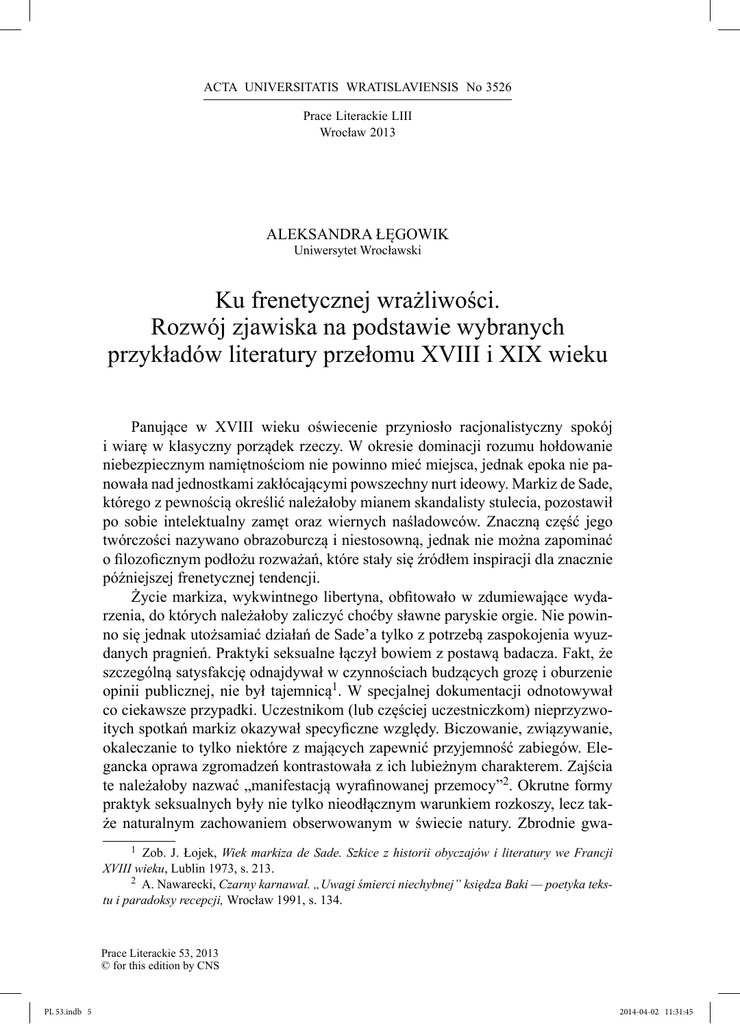 ACTA UNIVERSITATIS WRATISLAVIENSIS No 3526 Prace Literackie LIII Wrocław 2013 ALEKSANDRA ŁĘGOWIK Uniwersytet Wrocławski Ku frenetycznej wrażliwości. Rozwój zjawiska na podstawie wybranych przykładów literatury przełomu XVIII i XIX wieku Panujące w XVIII wieku oświecenie przyniosło racjonalistyczny spokój i wiarę w klasyczny porządek rzeczy. W okresie dominacji rozumu hołdowanie niebezpiecznym namiętnościom nie powinno mieć miejsca, jednak epoka nie panowała nad jednostkami zakłócającymi powszechny nurt ideowy. Markiz de Sade, którego z pewnością określić należałoby mianem skandalisty stulecia, pozostawił po sobie intelektualny zamęt oraz wiernych naśladowców. Znaczną część jego twórczości nazywano obrazoburczą i niestosowną, jednak nie można zapominać o filozoficznym podłożu rozważań, które stały się źródłem inspiracji dla znacznie późniejszej frenetycznej tendencji. Życie markiza, wykwintnego libertyna, obfitowało w zdumiewające wydarzenia, do których należałoby zaliczyć choćby sławne paryskie orgie. Nie powinno się jednak utożsamiać działań de Sade’a tylko z potrzebą zaspokojenia wyuzdanych pragnień. Praktyki seksualne łączył bowiem z postawą badacza. Fakt, że szczególną satysfakcję odnajdywał w czynnościach budzących grozę i oburzenie opinii publicznej, nie był tajemnicą1. W specjalnej dokumentacji odnotowywał co ciekawsze przypadki. Uczestnikom (lub częściej uczestniczkom) nieprzyzwoitych spotkań markiz okazywał specyficzne względy. Biczowanie, związywanie, okaleczanie to tylko niektóre z mających zapewnić przyjemność zabiegów. Elegancka oprawa zgromadzeń kontrastowała z ich lubieżnym charakterem. Zajścia te należałoby nazwać „manifestacją wyrafinowanej przemocy”2. Okrutne formy praktyk seksualnych były nie tylko nieodłącznym warunkiem rozkoszy, lecz także naturalnym zachowaniem obserwowanym w świecie natury. Zbrodnie gwa1 Zob. J. Łojek, Wiek markiza de Sade. Szkice z historii obyczajów i literatury we Francji XVIII wieku, Lublin 1973, s. 213. 2 A. Nawarecki, Czarny karnawał. „Uwagi śmierci niechybnej” księdza Baki — poetyka tekstu i paradoksy recepcji, Wrocław 1991, s. 134. Prace Literackie 53, 2013 © for this edition by CNS PL 53.indb 5 2014-04-02 11:31:45 6 ALEKSANDRA ŁĘGOWIK rantowały utrzymanie równowagi na świecie i nawet Najwyższa Istota wyrażała milczącą zgodę na podobne incydenty3. Cnota to wartość, która nie pozwalała na osiągnięcie szczęścia, a co dopiero rozkoszy. Satysfakcja płynęła z odpowiednio dawkowanego okrucieństwa, które jest uzupełnieniem lub środkiem rozpusty; […] podobnie jak ból, jest tylko własnością duszy całkowicie od nas niezależną; i tak z powodu jednego, jak drugiego nie powinniśmy się już wstydzić ani chwalić. Człowiek zabiega zawsze tylko o swą pomyślność: niezależnie od drogi, jaką wybiera w życiu, zawsze na swój sposób dąży do szczęścia4. De Sade (podobnie jak Schiller) przekonywał, że człowiek miał pierwotną zdolność do bezdusznych zachowań. Wykrył w świadomości każdej jednostki swego rodzaju czynnik okrucieństwa. To dzięki niemu ludzie potrafili odczuwać wszelkie przeżycia, także seksualne5. Zamiłowanie do okropności zostało zakodowane w naturze dowolnego indywiduum i w większości przypadków nie mogło być mowy o kontroli nad owym instynktem6. Człowieka wystawiono na działanie sił, z którymi nie potrafił sobie poradzić. Jego cel to troszczenie się o własny los, nie zaś o zapewnianie bezpieczeństwa innym. Wymogi społecznych praw i ustaleń wykształciły w ludziach postawę odwrotną. Hamowanie popędów stało się wyznacznikiem poprawnej egzystencji. Temu porządkowi sprzeciwiał się de Sade. Wyrzekanie się naturalnych odruchów i podporządkowywanie się sztucznym socjalnym wymogom uważał za ogromny błąd. Jedynie działając zgodnie z porządkiem przyrody, mogliśmy osiągnąć upragnioną satysfakcję, do której prowadziły zachowania najbardziej oburzające. Postawa broniąca okrucieństwa ukazana została w licznych pismach markiza. Wytłumaczono tam również obecność cnoty, która służyła jako środek pozwalający doznać rozkoszy. Pośrednio była więc narzędziem zła, o czym uświadomiono tytułową bohaterkę powieści Justyna: Twoja wdzięczna cnota jest nam niezbędna. To przecież z połączenia tej uroczej zalety z występkiem, który jej przeciwstawimy, zrodzą się dla nas najbardziej zmysłowe rozkosze7. Ból u de Sade’a pozostawał jednym z najsilniejszych doznań. Lęk przed zniszczeniem, terror, gwałt stanowiły źródło zaspokojenia dla strony silniejszej, ale często ekscytowały też ofiarę. W ten sposób realizował się nakaz natury mówiący o dominacji doskonalszej istoty nad słabszym osobnikiem8. Krzysztof Matuszewski wspomina wręcz o frenetycznym zapale, z jakim oprawcy przystępowali do swych odrażających postępków. Podkreślając ich namiętność, dążenie ku 3 Zob. M. Praz, Zmysły, śmierć i diabeł w literaturze romantycznej, przeł. K. Żaboklicki, Warszawa 1974, s. 104–105. 4 Cyt. za: K. Matuszewski, Okrucieństwo u Sade’a, [w:] Wokół gotycyzmów: wyobraźnia, groza, okrucieństwo, red. G. Gazda, A. Izdebska, J. Płuciennik, Kraków 2002, s. 300. 5 Zob. J. Łojek, op. cit., s. 219. 6 Por. K. Matuszewski, Sade. Msza okrucieństwa, Gdańsk 2008, s. 53. 7 Cyt. za: M. Praz, op. cit., s. 109. 8 Zob. J. Łojek, op. cit., s. 220. Prace Literackie 53, 2013 © for this edition by CNS PL 53.indb 6 2014-04-02 11:31:45 Ku frenetycznej wrażliwości. Rozwój zjawiska 7 samorealizacji, przekraczanie granic dobrego smaku, intensywność działań, autor jednoznacznie określił libertynów — frenetycy9. Badacz oczywiście posługuje się terminologią późniejszą niż filozofia de Sade’a, jednak upodobania markiza i jemu podobnych jak najbardziej odpowiadały tej nazwie. 