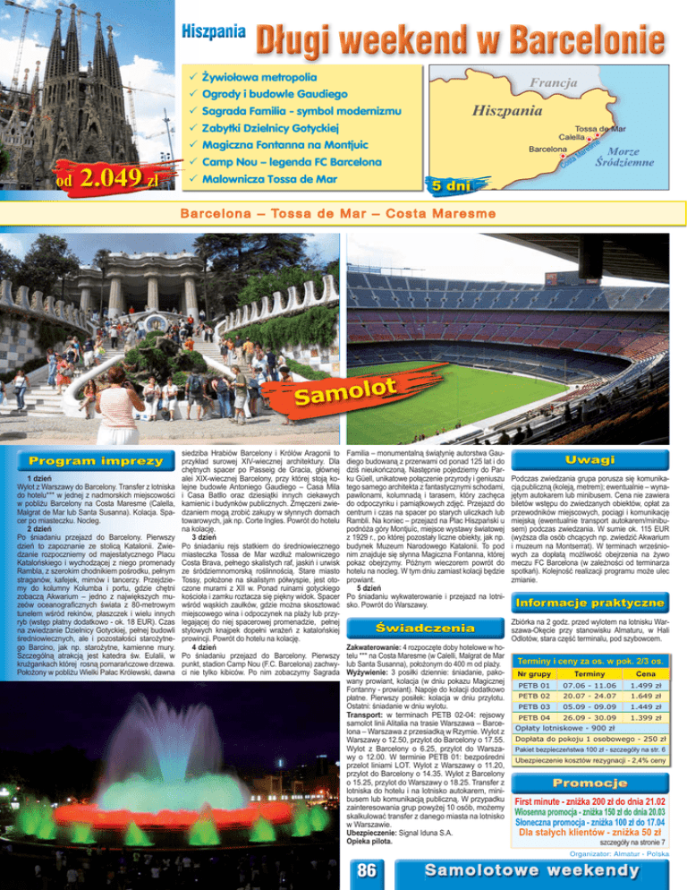 Długi weekend w Barcelonie Żywiołowa metropolia Francja Ogrody i budowle Gaudiego Sagrada Familia - symbol modernizmu Hiszpania Zabytki Dzielnicy Gotyckiej Tossa de Mar Calella e sm Barcelona Morze are M sta Śródziemne o C Magiczna Fontanna na Montjuic od 2.049 zł Camp Nou – legenda FC Barcelona Malownicza Tossa de Mar 5 dni B a r c e l o n a – To s s a d e M a r – C o s t a M a r e s m e ot Samol Program imprezy 1 dzień Wylot z Warszawy do Barcelony. Transfer z lotniska do hotelu*** w jednej z nadmorskich miejscowości w pobliżu Barcelony na Costa Maresme (Calella, Malgrat de Mar lub Santa Susanna). Kolacja. Spacer po miasteczku. Nocleg. 2 dzień Po śniadaniu przejazd do Barcelony. Pierwszy dzień to zapoznanie ze stolicą Katalonii. Zwiedzanie rozpoczniemy od majestatycznego Placu Katalońskiego i wychodzącej z niego promenady Rambla, z szerokim chodnikiem pośrodku, pełnym straganów, kafejek, mimów i tancerzy. Przejdziemy do kolumny Kolumba i portu, gdzie chętni zobaczą Akwarium – jedno z największych muzeów oceanograficznych świata z 80-metrowym tunelem wśród rekinów, płaszczek i wielu innych ryb (wstęp płatny dodatkowo - ok. 18 EUR). Czas na zwiedzanie Dzielnicy Gotyckiej, pełnej budowli średniowiecznych, ale i pozostałości starożytnego Barcino, jak np. starożytne, kamienne mury. Szczególną atrakcją jest katedra św. Eulalii, w krużgankach której rosną pomarańczowe drzewa. Położony w pobliżu Wielki Pałac Królewski, dawna siedziba Hrabiów Barcelony i Królów Aragonii to przykład surowej XIV-wiecznej architektury. Dla chętnych spacer po Passeig de Gracia, głównej alei XIX-wiecznej Barcelony, przy której stoją kolejne budowle Antoniego Gaudiego – Casa Mila i Casa Batllo oraz dziesiątki innych ciekawych kamienic i budynków publicznych. Zmęczeni zwiedzaniem mogą zrobić zakupy w słynnych domach towarowych, jak np. Corte Ingles. Powrót do hotelu na kolację. 3 dzień Po śniadaniu rejs statkiem do średniowiecznego miasteczka Tossa de Mar wzdłuż malowniczego Costa Brava, pełnego skalistych raf, jaskiń i urwisk ze śródziemnomorską roślinnością. Stare miasto Tossy, położone na skalistym półwyspie, jest otoczone murami z XII w. Ponad ruinami gotyckiego kościoła i zamku roztacza się piękny widok. Spacer wśród wąskich zaułków, gdzie można skosztować miejscowego wina i odpoczynek na plaży lub przylegającej do niej spacerowej promenadzie, pełnej stylowych knajpek dopełni wrażeń z katalońskiej prowincji. Powrót do hotelu na kolację. 4 dzień Po śniadaniu przejazd do Barcelony. Pierwszy punkt, stadion Camp Nou (F.C. Barcelona) zachwyci nie tylko kibiców. Po nim zobaczymy Sagrada Familia – monumentalną świątynię autorstwa Gaudiego budowaną z przerwami od ponad 125 lat i do dziś nieukończoną. Następnie pojedziemy do Parku Güell, unikatowe połączenie przyrody i geniuszu tego samego architekta z fantastycznymi schodami, pawilonami, kolumnadą i tarasem, który zachęca do odpoczynku i pamiątkowych zdjęć. Przejazd do centrum i czas na spacer po starych uliczkach lub Rambli. Na koniec – przejazd na Plac Hiszpański u podnóża góry Montjuïc, miejsce wystawy światowej z 1929 r., po której pozostały liczne obiekty, jak np. budynek Muzeum Narodowego Katalonii. To pod nim znajduje się słynna Magiczna Fontanna, której pokaz obejrzymy. Późnym wieczorem powrót do hotelu na nocleg. W tym dniu zamiast kolacji będzie prowiant. 5 dzień Po śniadaniu wykwaterowanie i przejazd na lotnisko. Powrót do Warszawy. Podczas zwiedzania grupa porusza się komunikacją publiczną (koleją, metrem); ewentualnie – wynajętym autokarem lub minibusem. Cena nie zawiera biletów wstępu do zwiedzanych obiektów, opłat za przewodników miejscowych, pociągi i komunikację miejską (ewentualnie transport autokarem/minibusem) podczas zwiedzania. W sumie ok. 115 EUR (wyższa dla osób chcących np. zwiedzić Akwarium i muzeum na Montserrat). W terminach wrześniowych za dopłatą możliwość obejrzenia na żywo meczu FC Barcelona (w zależności od terminarza spotkań). Kolejność realizacji programu może ulec zmianie. Świadczenia Zbiórka na 2 godz. przed wylotem na lotnisku Warszawa-Okęcie przy stanowisku Almaturu, w Hali Odlotów, stara część terminalu, pod szybowcem. Zakwaterowanie: 4 rozpoczęte doby hotelowe w hotelu *** na Costa Maresme (w Calelli, Malgrat de Mar lub Santa Susanna), położonym do 400 m od plaży. Wyżywienie: 3 posiłki dziennie: śniadanie, pakowany prowiant, kolacja (w dniu pokazu Magicznej Fontanny - prowiant). Napoje do kolacji dodatkowo płatne. Pierwszy posiłek: kolacja w dniu przylotu. Ostatni: śniadanie w dniu wylotu. Transport: w terminach PETB 02-04: rejsowy samolot linii Alitalia na trasie Warszawa – Barcelona – Warszawa z przesiadką w Rzymie. Wylot z Warszawy o 12.50, przylot do Barcelony o 17.55. Wylot z Barcelony o 6.25, przylot do Warszawy o 12.00. W terminie PETB 01: bezpośredni przelot liniami LOT. Wylot z Warszawy o 11.20, przylot do Barcelony o 14.35. Wylot z Barcelony o 15.25, przylot do Warszawy o 18.25. Transfer z lotniska do hotelu i na lotnisko autokarem, minibusem lub komunikacją publiczną. W przypadku zainteresowania grup powyżej 10 osób, możemy skalkulować transfer z danego miasta na lotnisko w Warszawie. Ubezpieczenie: Signal Iduna S.A. Opieka pilota. Uwagi Informacje praktyczne Terminy i ceny za os. w pok. 2/3 os. Nr grupy Terminy Cena PETB 01 07.06 - 11.06 1.499 zł PETB 02 20.07 - 24.07 1.649 zł PETB 03 05.09 - 09.09 1.449 zł PETB 04 26.09 - 30.09 1.399 zł Opłaty lotniskowe - 900 zł Dopłata do pokoju 1 osobowego - 250 zł Pakiet bezpieczeństwa 100 zł - szczegóły na str. 6 Ubezpieczenie kosztów rezygnacji - 2,4% ceny Promocje First minute - zniżka 200 zł do dnia 21.02 Wiosenna promocja - zniżka 150 zł do dnia 20.03 Słoneczna promocja - zniżka 100 zł do 17.04 Dla stałych klientów - zniżka 50 zł szczegó