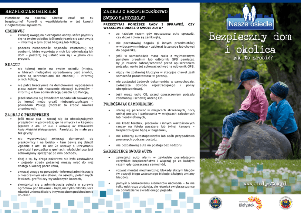 BEZPIECZNE OSIEDLE Mieszkasz na osiedlu? Chcesz czuć się tu bezpiecznie? Pomyśl o współdziałaniu w tej kwestii z najbliższymi sąsiadami. OBSERWUJ • zwracaj uwagę na nieznajome osoby, które pojawiły się na twoim osiedlu; jeśli podejrzanie się zachowują – informuj o tym Straż Miejską lub Policję, • podczas nieobecności sąsiadów zainteresuj się osobami, które wypytują o nich lub odwiedzają ich dom – postaraj się ustalić kim są i w jakim celu przyszli. REAGUJ • nie toleruj melin na swoim osiedlu (miejsc, w których nielegalnie sprzedawany jest alkohol, które są schronieniami dla złodziei) – informuj o nich policję, • nie patrz bezczynnie na demolowanie wyposażenia placu zabaw lub niszczenie elewacji budynków – informuj o tym administrację osiedla lub policję, • jeżeli staniesz się świadkiem napadu lub zauważysz, że komuś może grozić niebezpieczeństwo – powiadom policję (możesz to zrobić również anonimowo). ZADBAJ O PRZESTRZEŃ • jeśli masz psa – stosuj się do obowiązujących przepisów i wyprowadzaj go na smyczy i w kagańcu (zgodnie z art. 77 k.w. i uchwałą Nr LVII/678/06 Rady Miejskiej Białegostoku). Pamiętaj, że małe psy też gryzą! • nie wyprowadzaj zwierząt domowych do piaskownicy i na boisko – tam bawią się dzieci! zgodnie z art. 10 ust 2a ustawy o utrzymaniu czystości i porządku w gminach, właściciel psa jest zobowiązany sprzątnąć po nim odchody, • dbaj o to, by droga pożarowa nie była zastawiana - pojazdy straży pożarnej muszą mieć do niej dostęp o każdej porze roku, • zwracaj uwagę na porządek - informuj administrację o niesprawnym oświetleniu na osiedlu, połamanych ławkach, graffiti czy wywróconych koszach, • skontaktuj się z administracją osiedla w sprawie ogródków pod blokami – będą nie tylko zdobiły, lecz również uniemożliwiały innym osobom podchodzenie do okien. ZADBAJ O BEZPIECZEŃSTWO SWEGO SAMOCHODU Przeczytaj poniższe rady i właściwie dbasz o swoje auto? sprawdź, czy • za każdym razem gdy opuszczasz auto sprawdź, czy drzwi i okna są zamknięte, • nie pozostawiaj bagażu (i innych przedmiotów) w widocznym miejscu – zabieraj je ze sobą lub chowaj do bagażnika, • jeśli w samochodzie masz radio z wyjmowanym panelem przednim lub odbiornik GPS pamiętaj, by je zawsze zabrać/schować przed opuszczeniem pojazdu; warto też schować uchwyt na odbiornik GPS, • nigdy nie zostawiaj kluczyka w stacyjce (nawet jeśli samochód pozostawiasz w garażu), • nie zostawiaj żadnych dokumentów w samochodzie, zwłaszcza dowodu rejestracyjnego i polisy ubezpieczeniowej, • jeśli masz radio CB, przed opuszczeniem pojazdu zdemontuj i schowaj antenę CB. Bezpieczny dom i okolica - jak to zrobić? PODRÓŻUJĄC SAMOCHODEM: • staraj się parkować w miejscach strzeżonych, nocą unikaj postoju i parkowania w miejscach zalesionych lub nieoświetlonych, • nie kładź torebek, plecaków i innych wartościowych rzeczy na fotelu pasażera lub tylnej kanapie – bezpieczniejsze będą w bagażniku, • nie zabieraj autostopowiczów lub osób przypadkowo poznanych podczas postoju, • nie pozostawiaj auta na postoju bez nadzoru. ZABEZPIECZ SWOJE AUTO: • zainstaluj auto alarm w zakładzie posiadającym certyfikat bezpieczeństwa i włączaj go za każdym razem gdy opuszczasz samochód, • rozważ montaż mechanicznej blokady skrzyni biegów (w pozycji biegu wstecznego blokuje dźwignię zmiany biegów), • pomyśl o oznakowaniu elementów nadwozia – to nie tylko odstrasza złodzieja, ale również zwiększa szanse na odnalezienie skradzionego pojazdu. www.bialystok.pl CHROŃ SWÓJ DOM/MIESZKANIE BEZPIECZNIE W MIESZKANIU ZABEZPIECZ CENNE PRZEDMIOTY SPISZ WARTOŚCIOWE PRZEDMIOTY Jeśli jesteś właścicielem domu, zwróć uwagę na elementy, które sprzyjają bezpieczeństwu: • zadbaj o dobre oświetlenie terenu wokół domu (drzwi garażowe, brama, wejście do domu, furtki w ogrodzeniu), • Aby być spokojnym o swoje mieszkanie i osoby najbliższe, nie wystarczą zabezpieczenia techniczne – potrzebny jest jeszcze zdrowy rozsądek i stosowanie się do podstawowych zasad bezpieczeństwa tj.: zainstaluj system alarmowy lub monitorujący, • po wejściu do mieszkania zawsze zamykaj drzwi wejściowe na zamek (szczególnie gdy jesteś sam/a w domu), • okna wyposaż w szyby i certyfikowane okucia, antywłamaniowe • wychodząc z mieszkania, nawet na krótko, by wyrzucić śmieci, zamykaj drzwi na klucz, • zamontuj drzwi antywłamaniowe, wizjer i łańcuch, • nie pozostawiaj w drzwiach kartek z informacją, że nie ma cię w domu, • zamontuj zamki patentowe w oknach oraz drzwiach balkonowych, • pomyśl o solidnym, ażurowym ogrodzeniu i właściwym rozmieszczeniu drzew i krzewów, aby nie ograniczały widoczności – twój dom będzie wtedy pod czujnym okiem sąsiadów, • nie wpuszczaj obcych osób do mieszkania; do drzwi często pukają osoby podające się za pracowników administracji, listonoszy lub akwizytorów; jeśli masz wątpliwości – nie wpuszczaj ich do mieszkania; dzięki temu będziesz się czuł/a bezpieczniej , • rozważ rezygnację z drzwi łączących bezpośrednio wnętrze domu z garażem – to częsta droga włamywaczy, • nie lekceważ zabezpieczenia okien piwnicznych, • nie pozostawiaj w ogrodzie przedmiotów (drabina, sznur, wąż ogrodowy itp.) które mogą posłużyć włamywaczowi do dostania się do domu, • po zmroku zasłaniaj okna (zasłonami, żaluzjami itp.) tak, by wnętrze mieszkania było niewidoczne z zewnątrz, • wychodząc z domu zamknij okna, drzwi, garaż, włącz system alarmowy, • nigdy nie zostawiaj kluczy do domu w łatwo dostępnym miejscu (pod wycieraczką, pod kwiatkiem itp.) – złodzieje zazwyczaj dobrze znają takie schowki, • jeśli wyjeżdżasz – poinformuj o tym rodzinę lub sąsiada; poproś, by obserwowali twój dom/mieszkanie, zabierali spod drzwi ulotki i wy