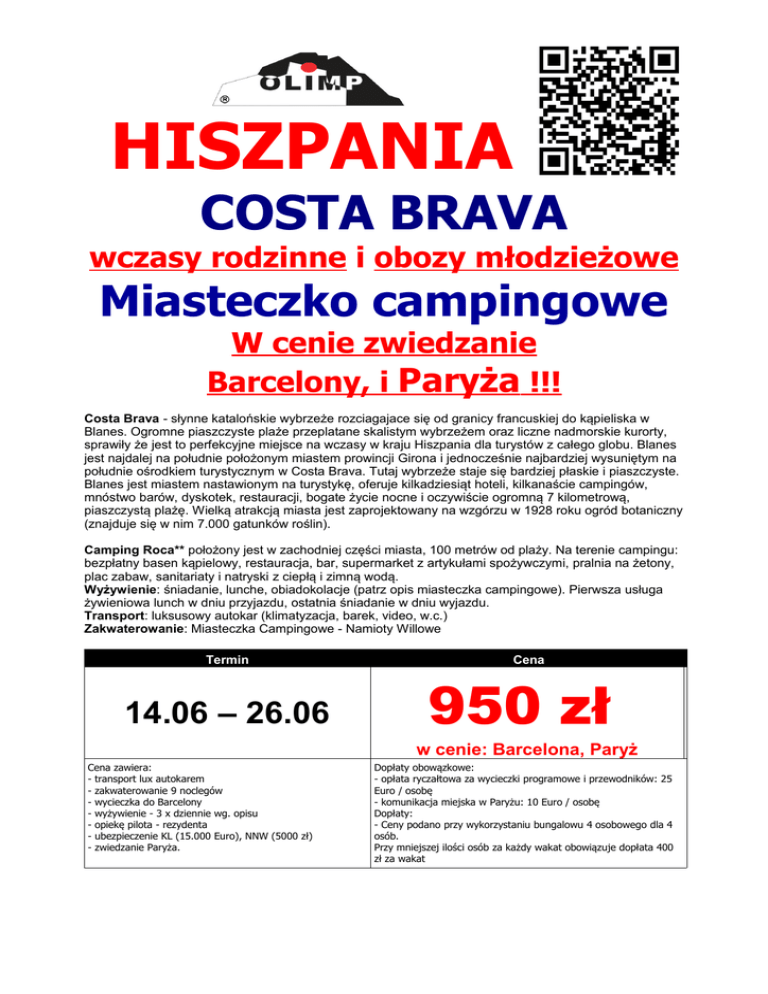 HISZPANIA COSTA BRAVA wczasy rodzinne i obozy młodzieżowe Miasteczko campingowe W cenie zwiedzanie Barcelony, i Paryża !!! Costa Brava - słynne katalońskie wybrzeże rozciagajace się od granicy francuskiej do kąpieliska w Blanes. Ogromne piaszczyste plaże przeplatane skalistym wybrzeżem oraz liczne nadmorskie kurorty, sprawiły że jest to perfekcyjne miejsce na wczasy w kraju Hiszpania dla turystów z całego globu. Blanes jest najdalej na południe położonym miastem prowincji Girona i jednocześnie najbardziej wysuniętym na południe ośrodkiem turystycznym w Costa Brava. Tutaj wybrzeże staje się bardziej płaskie i piaszczyste. Blanes jest miastem nastawionym na turystykę, oferuje kilkadziesiąt hoteli, kilkanaście campingów, mnóstwo barów, dyskotek, restauracji, bogate życie nocne i oczywiście ogromną 7 kilometrową, piaszczystą plażę. Wielką atrakcją miasta jest zaprojektowany na wzgórzu w 1928 roku ogród botaniczny (znajduje się w nim 7.000 gatunków roślin). Camping Roca** położony jest w zachodniej części miasta, 100 metrów od plaży. Na terenie campingu: bezpłatny basen kąpielowy, restauracja, bar, supermarket z artykułami spożywczymi, pralnia na żetony, plac zabaw, sanitariaty i natryski z ciepłą i zimną wodą. Wyżywienie: śniadanie, lunche, obiadokolacje (patrz opis miasteczka campingowe). Pierwsza usługa żywieniowa lunch w dniu przyjazdu, ostatnia śniadanie w dniu wyjazdu. Transport: luksusowy autokar (klimatyzacja, barek, video, w.c.) Zakwaterowanie: Miasteczka Campingowe - Namioty Willowe Termin 14.06 – 26.06 Cena 950 zł w cenie: Barcelona, Paryż Cena zawiera: - transport lux autokarem - zakwaterowanie 9 noclegów - wycieczka do Barcelony - wyżywienie - 3 x dziennie wg. opisu - opiekę pilota - rezydenta - ubezpieczenie KL (15.000 Euro), NNW (5000 zł) - zwiedzanie Paryża. Dopłaty obowązkowe: - opłata ryczałtowa za wycieczki programowe i przewodników: 25 Euro / osobę - komunikacja miejska w Paryżu: 10 Euro / osobę Dopłaty: - Ceny podano przy wykorzystaniu bungalowu 4 osobowego dla 4 osób. Przy mniejszej ilości osób za każdy wakat obowiązuje dopłata 400 zł za wakat
