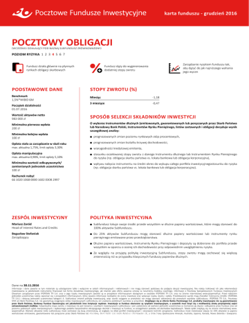 karta funduszu - wrzesień grudzień 2016 POCZTOWY OBLIGACJI (WCZEŚNIEJ DZIAŁAJĄCY POD NAZWĄ SUBFUNDUSZ ZRÓWNOWAŻONY) POZIOM RYZYKA 1 2 3 4 5 6 7 Fundusz działa głównie na płynnych rynkach obligacji skarbowych Zarządzanie ryzykiem funduszu tak, aby dążyć do jak najniższego wahania jego wycen Fundusz dąży do wygenerowania dodatniej stopy zwrotu PODSTAWOWE DANE STOPY ZWROTU (%) Benchmark 1,5%*WIBID 6M Miesiąc -1,18 3 miesiące -0,47 Początek działalności 01.07.2016 Wartość aktywów netto 983 000 zł SPOSÓB SELEKCJI SKŁADNIKÓW INWESTYCJI Minimalna pierwsza wpłata 200 zł O wyborze Instrumentów dłużnych (emitowanych, gwarantowanych lub poręczanych przez Skarb Państwa lub Narodowy Bank Polski, Instrumentów Rynku Pieniężnego, listów zastawnych i obligacji decyduje wynik szczegółowej analizy: Minimalna kolejna wpłata 100 zł Opłata stała za zarządzanie w skali roku max. aktualna 1,75%, limit opłaty 3,30% ■■ prognozowanych zmian poziomu rynkowych stóp procentowych, ■■ prognozowanych zmian kształtu krzywej dochodowości, ■■ wiarygodności kredytowej emitenta, Opłata manipulacyjna max. aktualna 0,90%, limit opłaty 5,10% ■■ stosunku oczekiwanej stopy zwrotu z danego Instrumentu dłużnego lub Instrumentem Rynku Pieniężnego Minimalna wartość odkupywanych/ zamienianych jednostek uczestnictwa 100 zł ■■ wpływu nabycia instrumentu na średni okres do wykupu całego portfela inwestycyjnegostosunku do ryzyka do ryzyka (np. obligacja skarbu państwa vs. lokata bankowa lub obligacja korporacyjna), (np. obligacja skarbu państwa vs. lokata bankowa lub obligacja korporacyjna). Rachunek nabyć 66 1020 1068 0000 1602 0308 2997 ZESPÓŁ INWESTYCYJNY POLITYKA INWESTYCYJNA Mariusz Zaród Head of Interest Rates and Credits ■■ Subfundusz lokuje swoje środki przede wszystkim w dłużne papiery wartościowe, które mogą stanowić do Bogusław Stefaniak Zarządzający ■■ Do 25% aktywów Subfunduszu mogą stanowić dłużne papiery wartościowe lub instrumenty rynku 100% aktywów Subfunduszu. pieniężnego emitowane przez przedsiębiorstwa. ■■ Dłużne papiery wartościowe, Instrumenty Rynku Pieniężnego i depozyty są dobierane do portfela przede wszystkim w oparciu o ocenę ich dochodowości przy odpowiednim uwzględnieniu ryzyka. ■■ Ze względu na przyjętą politykę inwestycyjną Subfunduszu, stopy zwrotu mogą cechować się większą zmiennością niż w przypadku klasycznych funduszy papierów dłużnych. Dane na 30.11.2016 Informacje i dane zawarte w tym materiale są udostępniane tylko i wyłącznie w celach informacyjnych i reklamowych i nie mogą stanowić podstawy do podjęcia decyzji inwestycyjnej. Nie należy traktować ich jako rekomendacji inwestowania w jakiekolwiek instrumenty finansowe lub formy doradztwa inwestycyjnego, jak również jako oferty zawarcia umowy w rozumieniu Kodeksu cywilnego. Informacje o Pocztowy Specjalistycznym Funduszu Inwestycyjnym Otwartym zarządzanym przez IPOPEMA TFI S.A. oraz o jego ryzyku inwestycyjnym zawarte są w prospekcie informacyjnym dostępnym w siedzibie IPOPEMA TFI S.A. oraz na stronie internetowej www.ipopematfi.pl. Przed nabyciem jednostek uczestnictwa należy zapoznać się z prospektem informacyjnym, który zawiera informacje niezbędne do oceny inwestycji oraz wskazuje ryzyka, koszty i opłaty. Przedstawione wyniki mają charakter historyczny (źródło: IPOPEMA TFI S.A.) i dotyczą jednostek uczestnictwa kategorii A. Subfundusz zmienił politykę inwestycyjną, więc wyniki osiągane w przeszłości nie mogą stanowić odniesienia dla przeszłych wyników subfunduszu. IPOPEMA TFI S.A., Pocztowy SFIO ani Bank Pocztowy S.A. nie gwarantują osiągnięcia celów inwestycyjnych subfunduszy ani uzyskania podobnych wyników w przyszłości. Znajdujące się w ofercie Banku Pocztowego S.A. produkty inwestycyjne nie są gwarantowane przez Skarb Państwa, Bankowy Fundusz Gwarancyjny ani jakiekolwiek inne instytucje rządowe. Inwestycje w Fundusz obarczone są ryzykiem inwestycyjnym, a uczestnik musi liczyć się z możliwością utraty przynajmniej części zainwestowanych środków. Indywidualna stopa zwrotu z inwestycji nie jest tożsama z wynikami inwestycyjnymi subfunduszu i jest uzależniona od wartości jednostki uczestnictwa w momencie jej zbycia i odkupienia przez Fundusz oraz od poziomu pobranych opłat manipulacyjnych i zapłaconego podatku bezpośrednio obciążającego dochód z inwestycji w Fundusz, w szczególności podatku od dochodów kapitałowych. Tabele opłat znajdują się na stronie internetowej www. ipopematfi.pl. Wartość aktywów netto subfunduszy może cechować się dużą zmiennością, ze względu na skład portfeli inwestycyjnych i stosowane techniki zarządzania. Subfundusz może inwestować więcej niż 35% aktywów w papiery wartościowe emitowane, gwarantowane lub poręczone przez Skarb Państwa lub Narodowy Bank Polski oraz każde Państwo członkowskie UE, a także Stany Zjednoczone Ameryki, Australia, Japonia, Kanada, Nowa Zelandia i Szwajcaria. Dokument pobrano z mojeFundusze.pl