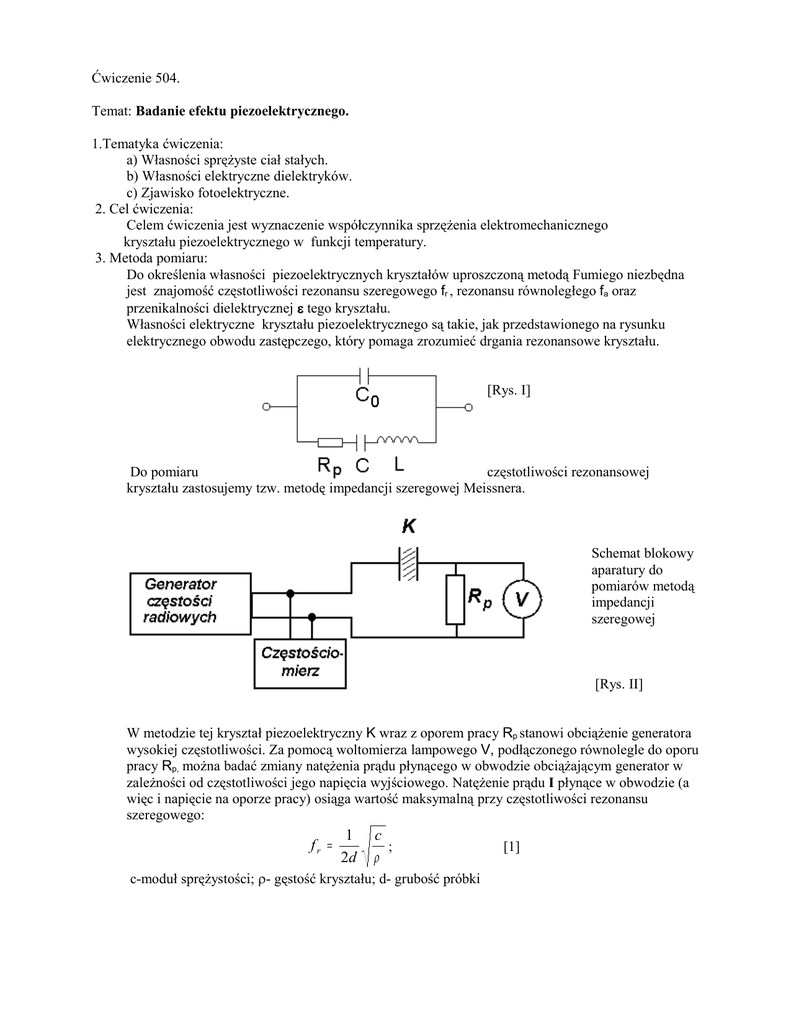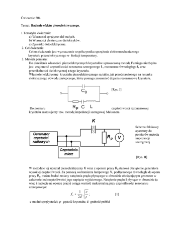 Ćwiczenie 504. Temat: Badanie efektu piezoelektrycznego. 1.Tematyka ćwiczenia: a) Własności sprężyste ciał stałych. b) Własności elektryczne dielektryków. c) Zjawisko fotoelektryczne. 2. Cel ćwiczenia: Celem ćwiczenia jest wyznaczenie współczynnika sprzężenia elektromechanicznego kryształu piezoelektrycznego w funkcji temperatury. 3. Metoda pomiaru: Do określenia własności piezoelektrycznych kryształów uproszczoną metodą Fumiego niezbędna jest znajomość częstotliwości rezonansu szeregowego fr , rezonansu równoległego fa oraz przenikalności dielektrycznej ε tego kryształu. Własności elektryczne kryształu piezoelektrycznego są takie, jak przedstawionego na rysunku elektrycznego obwodu zastępczego, który pomaga zrozumieć drgania rezonansowe kryształu. [Rys. I] Do pomiaru częstotliwości rezonansowej kryształu zastosujemy tzw. metodę impedancji szeregowej Meissnera. Schemat blokowy aparatury do pomiarów metodą impedancji szeregowej [Rys. II] W metodzie tej kryształ piezoelektryczny K wraz z oporem pracy Rp stanowi obciążenie generatora wysokiej częstotliwości. Za pomocą woltomierza lampowego V, podłączonego równolegle do oporu pracy Rp, można badać zmiany natężenia prądu płynącego w obwodzie obciążającym generator w zależności od częstotliwości jego napięcia wyjściowego. Natężenie prądu I płynące w obwodzie (a więc i napięcie na oporze pracy) osiąga wartość maksymalną przy częstotliwości rezonansu szeregowego: fr = 1 2d c ; ρ c-moduł sprężystości; ρ- gęstość kryształu; d- grubość próbki [1] natomiast wartość minimalną dla rezonansu równoległego: 1 fa = 2π L⋅ C ⋅ C0 C + C0 [2] C0 –pojemność kryształu zmierzona polem małej częstotliwości. Zdolność kryształu do przetwarzania energii określa współczynnik sprzężenia elektromechanicznego k, którego kwadrat jest równy stosunkowi energii mechanicznej drgań do energii mechanicznej dostarczonej ze źródła. Wartość tego współczynnika można znaleźć z równania: k2 = π f − fr ⋅ a 4 f r 2 [3] Znając wartość liczbową k z bezpośrednich pomiarów częstotliwości fr i fa oraz przenikalność dielektryczną kryształu ε, można obliczyć moduł piezoelektryczny badanego kryształu: d = k⋅ ε c [4] Dla badanego kryształu kwarcu: ε = 4,06 .10-11 [F/m] ρ = 2,65 . 103 [kg/m3] Moduł sprężystości c należy wyznaczyć z wzoru [1] 4. Wykonanie ćwiczenia: a) Połączyć aparaturę według rysunku [II]. Wybrać na generatorze zakres napięcia 3V. Włączyć generator, woltomierz i częstościomierz. b) Zmierzyć zależność napięcia U na oporze pracy Rp od częstotliwości (w temperaturze pokojowej) w zakresie częstotliwości od 90kHz do 2 MHz., zapisując tylko maksima i minima napięć i odpowiadające im częstotliwości. Nanieść pomiary na wykres U(f) Przykładowy fragment takiej zależności przedstawia rysunek: [Rys. III] [Rys. III] c) Odszukać na wykresie rezonans podstawowy, któremu odpowiada największa różnica ∆U między napięciem rezonansu szeregowego fr, a napięciem rezonansu równoległego fa. d) Ustawić częstotliwość odpowiadającą rezonansowi podstawowemu. Włączyć termostat i powtórzyć pomiary napięć U(fr) oraz U(fa) dla rezonansu podstawowego, powtarzając pomiary co 5oC w zakresie do 40oC i co 1oC, aż do chwili zniknięcia piezoefektu. e) Narysować wykres zależności wartości współczynnika sprzężenia elektromechanicznego od temperatury.