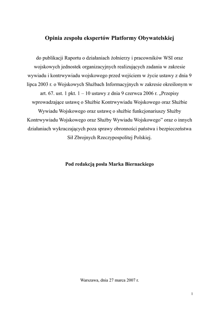 Opinia zespołu ekspertów Platformy Obywatelskiej do publikacji Raportu o działaniach żołnierzy i pracowników WSI oraz wojskowych jednostek organizacyjnych realizujących zadania w zakresie wywiadu i kontrwywiadu wojskowego przed wejściem w życie ustawy z dnia 9 lipca 2003 r. o Wojskowych Służbach Informacyjnych w zakresie określonym w art. 67. ust. 1 pkt. 1 – 10 ustawy z dnia 9 czerwca 2006 r. „Przepisy wprowadzające ustawę o Służbie Kontrwywiadu Wojskowego oraz Służbie Wywiadu Wojskowego oraz ustawę o służbie funkcjonariuszy Służby Kontrwywiadu Wojskowego oraz Służby Wywiadu Wojskowego” oraz o innych działaniach wykraczających poza sprawy obronności państwa i bezpieczeństwa Sił Zbrojnych Rzeczypospolitej Polskiej. Pod redakcją posła Marka Biernackiego Warszawa, dnia 27 marca 2007 r. 1 Spis treści 1. Podstawy Prawne sporządzenia i publikacji Raportu. 2. Największe uchybienia Raportu. 3. Uwagi krytyczne do poszczególnych części Raportu. 4. Informacje prasowe dotyczące treści Raportu ujawnione przed jego publikacją. 5. Komentarze prasy zagranicznej po upublicznieniu Raportu. 6. Najważniejsze dementi zamieszczone przez osoby i instytucje wymienione w Raporcie. 7. Szkody dla bezpieczeństwa i międzynarodowej pozycji RP wyrządzone publikacją Raportu. 8. Prognoza wpływu wytworzenia i opublikowania Raportu KW oraz sposobu weryfikacji żołnierzy WSI na proces tworzenia nowych służb wywiadu i kontrwywiadu wojskowego. 2 1. Podstawy prawne sporządzenia i publikacji Raportu - uwagi i wątpliwości. Ustawa z dnia 9 czerwca 2006 roku - Przepisy wprowadzające ustawę o Służbie Kontrwywiadu Wojskowego oraz Służbie Wywiadu Wojskowego oraz ustawę o służbie funkcjonariuszy Służby Kontrwywiadu Wojskowego oraz Służby Wywiadu Wojskowego – (Dz. U. z 2006r. Nr 104, poz. 711 z póź. zm.)w art. 70 a ust.1 zobowiązała Przewodniczącego Komisji Weryfikacyjnej, w terminie wyznaczonym przez Prezesa Rady Ministrów do sporządzenia Raportu o działaniach żołnierzy i pracowników WSI oraz wojskowych jednostek organizacyjnych realizujących zadania w zakresie wywiadu i kontrwywiadu wojskowego przed wejściem w życie ustawy z dnia 9 lipca 2003 r. o Wojskowych Służbach Informacyjnych, w zakresie określonym w art. 67 ust. 1 pkt. 1 – 10 oraz o innych działaniach wykraczających poza sprawy obronności państwa i bezpieczeństwa Sił Zbrojnych Rzeczypospolitej Polskiej1... Ustawodawca w art. 70 c ust 3 przywołanej wyżej ustawy nałożył na Prezydenta Rzeczypospolitej Polskiej obowiązek podania do publicznej wiadomości sporządzonego przez Przewodniczącego Komisji Weryfikacyjnej Raportu. Równocześnie w ust. 4 zadecydował, że Postanowienie Prezydenta Rzeczypospolitej Polskiej o podaniu Raportu do publicznej wiadomości będzie równoznaczne ze zniesieniem klauzuli tajności w rozumieniu art. 21 ust. 1 i 3 ustawy z dnia 22 stycznia 1999 r. o ochronie informacji niejawnych (Dz. U. z 2005 r. Nr 196, poz. 1631 oraz z 2006 r. Nr 104, poz. 708 i 711, Nr 149, poz. 1078, Nr 218, poz. 1592 i Nr 220, poz. 1600). Dyspozycję tą Prezydent RP wykonał w dniu 16 lutego 2007 roku. Biorąc powyższe pod uwagę, zakres merytoryczny Raportu powinien obejmować informację o działaniach wyżej wymienionej kategorii osób, które same lub wspólnie i w porozumieniu z innymi osobami: · wbrew przepisom ustawy ujawniły lub wykorzystały informacje stanowiące tajemnicę państwową lub służbową; · wbrew przepisom ustawy lub ciążącemu na sobie obowiązkowi ujawniły lub wykorzystały informacje, uzyskane w wyniku wykonywanych przez WSI albo inne organy, służby lub instytucje państwowe czynności operacyjno-rozpoznawczych; · mając wiarygodną wiadomość o karalnym przygotowaniu albo usiłowaniu lub dokonaniu czynu zabronionego nie zawiadomiły niezwłocznie organu powołanego do ścigania przestępstw; · utrudniały lub udaremniały postępowanie karne, pomagając sprawcy przestępstwa, w tym przestępstwa skarbowego, uniknąć odpowiedzialności karnej; · stosowały przemoc wobec osoby lub groźbę bezprawną w celu zmuszenia innej osoby do określonego działania, zaniechania lub znoszenia; · wpływały w sposób bezprawny na rozstrzygnięcia, w tym decyzje administracyjne, oraz inne czynności urzędowe organów władzy publicznej, a także na zaniechanie ich podjęcia; · prowadziły tajną współpracę z przedsiębiorcą, nadawcą, redaktorem naczelnym, dziennikarzem lub podmiotem prowadzącym działalność wydawniczą na terytorium Rzeczypospolitej Polskiej; · tworzyły lub przekazywały fałszywe informacje lub podejmowały inne działania w celu: 1 Obowiązek sporządzenia Raportu wprowadzony został ustawą z dnia 14 grudnia 2006 roku o zmianie ustawy Przepisy wprowadzające ustawę o Służbie Kontrwywiadu Wojskowego oraz Służbie Wywiadu Wojskowego oraz ustawę o służbie funkcjonariuszy Służby Kontrwywiadu Wojskowego oraz Służby Wywiadu Wojskowego (Dz. U. z 200 r. , Nr 7, poz. 49). 3 · · a) skierowania przeciwko określonej osobie ścigania karnego o przestępstwo, przestępstwo skarbowe, wykroczenie, wykroczenie skarbowe lub przewinienie dyscyplinarne, b) pomówienia określonej osoby, grupy osób, instytucji, osoby prawnej lub jednostki organizacyjnej nie mającej osobowości prawnej o takie postępowanie lub właściwości, które mogą ją poniżyć w opinii publicznej lub narazić na utratę zaufania potrzebnego dla danego stanowiska, zawodu lub rodzaju działalności; kierowały popełnieniem przez inną osobę czynu, o którym mowa w pkt. 1-6 i 8, nakłaniały inną osobę do popełnienia takiego czynu, ułatwiły jego popełnienie lub wykorzystując uzależnienie innej osoby od siebie poleciły jej wykonanie takiego czynu; osiągnęły korzyść majątkową lub osobistą z tytułu działań, o których mowa w pkt.1-9. Dodatkowo Raport powinien zawierać informacje: o osobach z nimi współdziałających, o osob