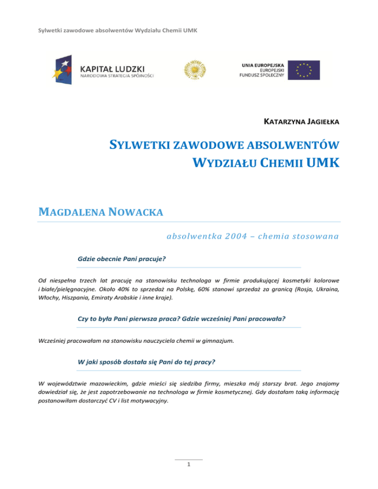Sylwetki zawodowe absolwentów Wydziału Chemii UMK KATARZYNA JAGIEŁKA SYLWETKI ZAWODOWE ABSOLWENTÓW WYDZIAŁU CHEMII UMK MAGDALENA NOWACKA absolwentka 2004 – chemia stosowana Gdzie obecnie Pani pracuje? Od niespełna trzech lat pracuję na stanowisku technologa w firmie produkującej kosmetyki kolorowe i białe/pielęgnacyjne. Około 40% to sprzedaż na Polskę, 60% stanowi sprzedaż za granicą (Rosja, Ukraina, Włochy, Hiszpania, Emiraty Arabskie i inne kraje). Czy to była Pani pierwsza praca? Gdzie wcześniej Pani pracowała? Wcześniej pracowałam na stanowisku nauczyciela chemii w gimnazjum. W jaki sposób dostała się Pani do tej pracy? W województwie mazowieckim, gdzie mieści się siedziba firmy, mieszka mój starszy brat. Jego znajomy dowiedział się, że jest zapotrzebowanie na technologa w firmie kosmetycznej. Gdy dostałam taką informację postanowiłam dostarczyd CV i list motywacyjny. 1 Sylwetki zawodowe absolwentów Wydziału Chemii UMK Jak wyglądał proces rekrutacji? Po dostarczeniu dokumentów aplikacyjnych, czekałam około tygodnia. Zadzwoniłam do firmy, żeby się dowiedzied czy rozpatrzono moją aplikację. Następnego dnia zaproszono mnie na rozmowę kwalifikacyjną, która trwała jakieś 1,5 godziny. Najpierw miałam rozmowę z dyrektorem generalnym (z wykształcenia chemikiem), który pytał mnie jak wyobrażam sobie proces produkcji kosmetyków oraz zadał mi kilka pytao z chemii ogólnej. Następnie odbyłam rozmowę z prezesem, który opowiedział mi, na czym miałaby polegad moja praca. Zadał mi kilka standardowych pytao. W trakcie rozmowy wezwał do swojego gabinetu panią główną technolog, która sprawdziła moją wiedzę z zakresu chemii kosmetycznej. Decyzja o zatrudnieniu mnie zapadła tego samego dnia. Co zadecydowało o przyjęciu Pani do tej pracy? Jak się później dowiedziałam od swojej przełożonej, nie za dobrze wypadłam na rozmowie kwalifikacyjnej. Moją wadą była małomównośd. Na zadawane mi pytania odpowiadałam krótko. To, że nie miałam doświadczenia, nie było moim atutem, jednak firma postanowiła dad mi szansę. Moja przełożona namówiła prezesa i dyrektora żeby mnie zatrudniono. Przekonała ich, że małomównośd nie świadczy o tym, że nie będę dobrym pracownikiem. Na czym polega Pani praca? Projektuję nowe wyroby w zakresie opracowywania receptur i technologii. Prowadzę nadzór nad procesami technologicznymi, udzielam konsultacji technologicznych. Jak wygląda dzieo pracy? Obecnie w firmie zajmujemy się licznymi wdrożeniami nowych produktów. Gdy jest wdrażany mój produkt, nadzoruję jego proces technologiczny, sprawdzam parametry fizykochemiczne gotowej masy z próbą wzorcową. Poza tym pracuję nad nowymi projektami (np. żelu pod prysznic dla mężczyzn, pomadki do ust, podkłady do twarzy, krem pod oczy). Niektóre projekty mają krótszy czas realizacji, więc najpierw nimi się zajmuję. Muszę wykonad próby innych produktów, by sprawdzid jego stabilnośd i dad do przetestowania probantom. Uzupełniam dokumentację nowo wdrażanych produktów. Niestety, jak to w każdej firmie, pojawia się czasami jakiś problem, który trzeba szybko rozwiązad. W jakim stopniu i w jaki sposób realizuje Pani swoje cele zawodowe? Od zawsze chciałam pracowad w laboratorium. Nie wiedziałam jednak, w jakiej dziedzinie. Znalazłam zatrudnienie na stanowisku, które mnie satysfakcjonuje. Robię to, co lubię. 2 Sylwetki zawodowe absolwentów Wydziału Chemii UMK Jak wyglądała Pani droga do obecnego stanowiska pracy? Pracując w gimnazjum, uczęszczałam jednocześnie na studia podyplomowe z chemii kosmetycznej w Warszawie. Właśnie wtedy postanowiłam, że chcę zostad technologiem w firmie kosmetycznej. Wiedziałam, że małymi kroczkami można osiągnąd wiele. Nie buntowałam się, gdy miałam pracowad na czas próbny (3 miesiące) na nastawni kosmetyków białych i kolorowych. Mimo, iż obiecano mi inne stanowisko zostałam aparatowym. Szybko się uczyłam. Następnie przeniesiono mnie na dwa tygodnie do mieszalni lakierów. Tam udowodniłam, że dobrze rozróżniam kolory i nie boję się ciężkiej pracy. Następnie dostałam stanowisko kontrolera jakości. Po kilku miesiącach nieformalnie pełniłam funkcję brygadzisty. Od dwóch lat zajmuję stanowisko technologa. W jaki sposób rozwija Pani swoje kompetencje? Na czym polega rozwój w firmie? Firma wysyła mnie na różnego rodzaju szkolenia. Czytam czasopisma skierowane do technologów. Pracując przy nowych recepturach, uczę się na własnych błędach. Konsultuję się ze swoją przełożoną oraz znajomymi, którzy mają dłuższy staż pracy. Z czego jest Pani najbardziej zadowolona mogąc wykonywad ten zawód? Najbardziej cieszy mnie to, że mogę tworzyd coś nowego. Każdy dzieo jest inny. Czasami coś nie wychodzi, ale poświęciwszy temu czas, widzimy efekty pracy. Jestem zadowolona, gdy osoby, które wcześniej testowały mój laboratoryjny produkt, oceniają go bardzo wysoko. Co uważa Pani za swoje największe osiągnięcie? Za moje największe osiągnięcie uważam to, że w dośd krótkim czasie i bez doświadczenia zostałam technologiem. W jakim stopniu studia przygotowały Panią do wykonywanego zawodu? Wiedza, jaką zdobyłam na studiach umożliwiła mi zrozumied procesy, jakie zachodzą w czasie produkcji kosmetyków. Bez problemu odnalazłam się na stanowisku kontrolera jakości (wykonywanie analiz). Jakie kompetencje są potrzebne do wykonywania tego zawodu? Umiejętności badawcze Cierpliwośd Precyzja Profesjonalizm 3 Sylwetki zawodowe absolwentów Wydziału Chemii UMK Komunikatywnośd Kreatywnośd Mobilizacja do działania Negocjowanie Planowanie i organizowanie Podejmowanie decyzji Praca zespołowa Praca indywidualna Rozwiązywanie problemów Umiejętnośd prezentacji Zarządzanie czasem Jakie dodatkowe umiejętności i wiedza jest niezbędna do wykonywania tego zawodu? Wiedza, jaką nabyłam na studiach podyplomow