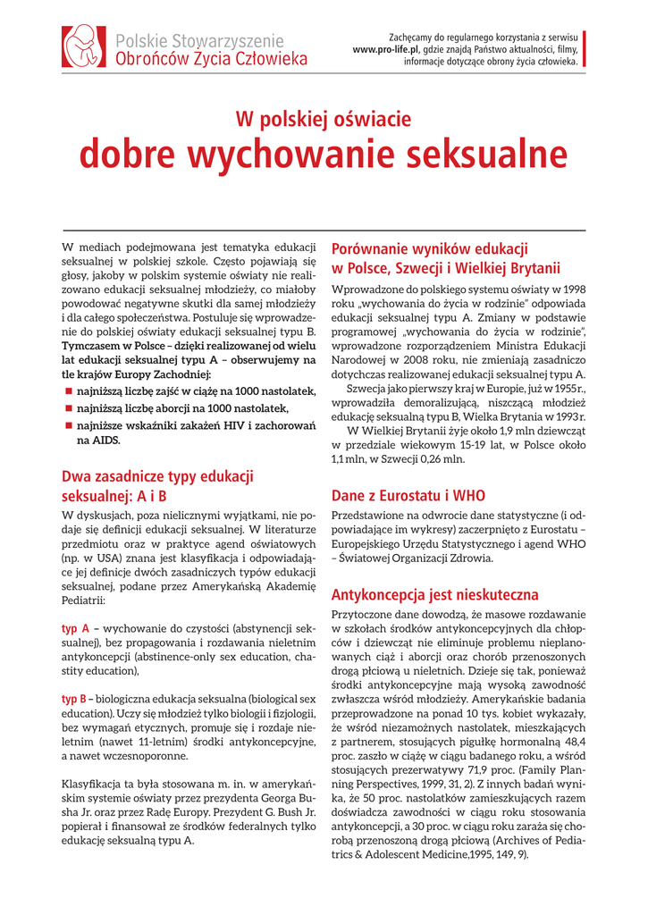 Zachęcamy do regularnego korzystania z serwisu www.pro-life.pl, gdzie znajdą Państwo aktualności, filmy, informacje dotyczące obrony życia człowieka. W polskiej oświacie dobre wychowanie seksualne W mediach podejmowana jest tematyka edukacji seksualnej w polskiej szkole. Często pojawiają się głosy, jakoby w polskim systemie oświaty nie realizowano edukacji seksualnej młodzieży, co miałoby powodować negatywne skutki dla samej młodzieży i dla całego społeczeństwa. Postuluje się wprowadzenie do polskiej oświaty edukacji seksualnej typu B. Tymczasem w Polsce – dzięki realizowanej od wielu lat edukacji seksualnej typu A – obserwujemy na tle krajów Europy Zachodniej: najniższą liczbę zajść w ciążę na 1000 nastolatek, najniższą liczbę aborcji na 1000 nastolatek, najniższe wskaźniki zakażeń HIV i zachorowań na AIDS. Dwa zasadnicze typy edukacji seksualnej: A i B W dyskusjach, poza nielicznymi wyjątkami, nie podaje się definicji edukacji seksualnej. W literaturze przedmiotu oraz w praktyce agend oświatowych (np. w USA) znana jest klasyfikacja i odpowiadające jej definicje dwóch zasadniczych typów edukacji seksualnej, podane przez Amerykańską Akademię Pediatrii: typ A – wychowanie do czystości (abstynencji seksualnej), bez propagowania i rozdawania nieletnim antykoncepcji (abstinence-only sex education, chastity education), typ B – biologiczna edukacja seksualna (biological sex education). Uczy się młodzież tylko biologii i fizjologii, bez wymagań etycznych, promuje się i rozdaje nieletnim (nawet 11-letnim) środki antykoncepcyjne, a nawet wczesnoporonne. Klasyfikacja ta była stosowana m. in. w amerykańskim systemie oświaty przez prezydenta Georga Busha Jr. oraz przez Radę Europy. Prezydent G. Bush Jr. popierał i finansował ze środków federalnych tylko edukację seksualną typu A. Porównanie wyników edukacji w Polsce, Szwecji i Wielkiej Brytanii Wprowadzone do polskiego systemu oświaty w 1998 roku „wychowania do życia w rodzinie” odpowiada edukacji seksualnej typu A. Zmiany w podstawie programowej „wychowania do życia w rodzinie”, wprowadzone rozporządzeniem Ministra Edukacji Narodowej w 2008 roku, nie zmieniają zasadniczo dotychczas realizowanej edukacji seksualnej typu A. Szwecja jako pierwszy kraj w Europie, już w 1955 r., wprowadziła demoralizującą, niszczącą młodzież edukację seksualną typu B, Wielka Brytania w 1993 r. W Wielkiej Brytanii żyje około 1,9 mln dziewcząt w przedziale wiekowym 15-19 lat, w Polsce około 1,1 mln, w Szwecji 0,26 mln. Dane z Eurostatu i WHO Przedstawione na odwrocie dane statystyczne (i odpowiadające im wykresy) zaczerpnięto z Eurostatu – Europejskiego Urzędu Statystycznego i agend WHO – Światowej Organizacji Zdrowia. Antykoncepcja jest nieskuteczna Przytoczone dane dowodzą, że masowe rozdawanie w szkołach środków antykoncepcyjnych dla chłopców i dziewcząt nie eliminuje problemu nieplanowanych ciąż i aborcji oraz chorób przenoszonych drogą płciową u nieletnich. Dzieje się tak, ponieważ środki antykoncepcyjne mają wysoką zawodność zwłaszcza wśród młodzieży. Amerykańskie badania przeprowadzone na ponad 10 tys. kobiet wykazały, że wśród niezamożnych nastolatek, mieszkających z partnerem, stosujących pigułkę hormonalną 48,4 proc. zaszło w ciążę w ciągu badanego roku, a wśród stosujących prezerwatywy 71,9 proc. (Family Planning Perspectives, 1999, 31, 2). Z innych badań wynika, że 50 proc. nastolatków zamieszkujących razem doświadcza zawodności w ciągu roku stosowania antykoncepcji, a 30 proc. w ciągu roku zaraża się chorobą przenoszoną drogą płciową (Archives of Pediatrics & Adolescent Medicine,1995, 149, 9). Dobre wychowanie seksualne Oceniając pozytywnie dotychczasowe wyniki naszego wychowania seksualnego (edukacji seksualnej typu A), trzeba podkreślić potrzebę dalszego doskonalenia tego systemu i konieczność zablokowania prób wprowadzenia do naszych szkół demoralizującej, niszczącej młodzież edukacji seksualnej typu B. Opracowali: dr hab. Jadwiga Wronicz, dr inż. Antoni Zięba, Kraków, maj 2015 r. Uwaga! Przedstawione na wykresach dane z Polski dotyczą sytuacji zdelegalizowanej aborcji. W 1997 roku aborcja była w Polsce przez rok legalna i wtedy liczba aborcji wynosiła ogółem 3047 (łącznie wśród nieletnich i pełnoletnich kobiet), a w liczącej ok. 9 mln mieszkańców Szwecji aż 31 433, w tym wśród nastolatek 4374! Powszechna Deklaracja Praw Człowieka ONZ (1948): Art. 26 ust. 3. Rodzice mają prawo pierwszeństwa w wyborze nauczania, które ma być dane ich dzieciom. Konstytucja Rzeczypospolitej Polskiej (1997): Art. 48 ust. 3. Rodzice mają prawo do wychowania dzieci zgodnie z własnymi przekonaniami. Wychowanie to powinno uwzględniać stopień dojrzałości dziecka, a także wolność jego sumienia i wyznania oraz jego przekonania. Art. 53 ust. 3. Rodzice mają prawo do zapewnienia dzieciom wychowania i nauczania moralnego i religijnego zgodnie ze swoimi przekonaniami. To rodzice mają prawo do decydowania o wychowaniu dzieci PS. Zachęcamy do gratisowego skorzystania z dwóch monotematycznych numerów miesięcznika „Wychowawca” dostępnych na stronie internetowej www.wychowawca.pl: „To idzie gender” (5/2013) i „Edukacja seksualna typu A” (9/2012). MNIEJ ABORCJI MNIEJ CIĄŻ wśród nastolatek w Polsce wśród nastolatek w Polsce na 1000 dziewcząt Polska 23 Polska 13,92 Szwecja 6 199 Szwecja 25,76 Wielka Brytania 36 540 Wielka Brytania 39,68 Liczba legalnie przerwanych ciąż przez nastolatki w wieku 15-19 lat.EUROSTAT 2012 (Szwecja 2010, Wielka Brytania 2011). Liczba zajść w ciąże przez nastolatki w wieku 15–19 lat na 1000 nastolatek (urodzenia oraz legalnie przerwane ciąże łącznie).EUROSTAT 2012 (Szwecja 2010, Wielka Brytania 2011). MNIEJ ABORCJI MNIEJ ZACHOROWAŃ wśród nastolatek w Polsce na 1000 dziewcząt na HIV i AIDS w Polsce na 100 000 mie