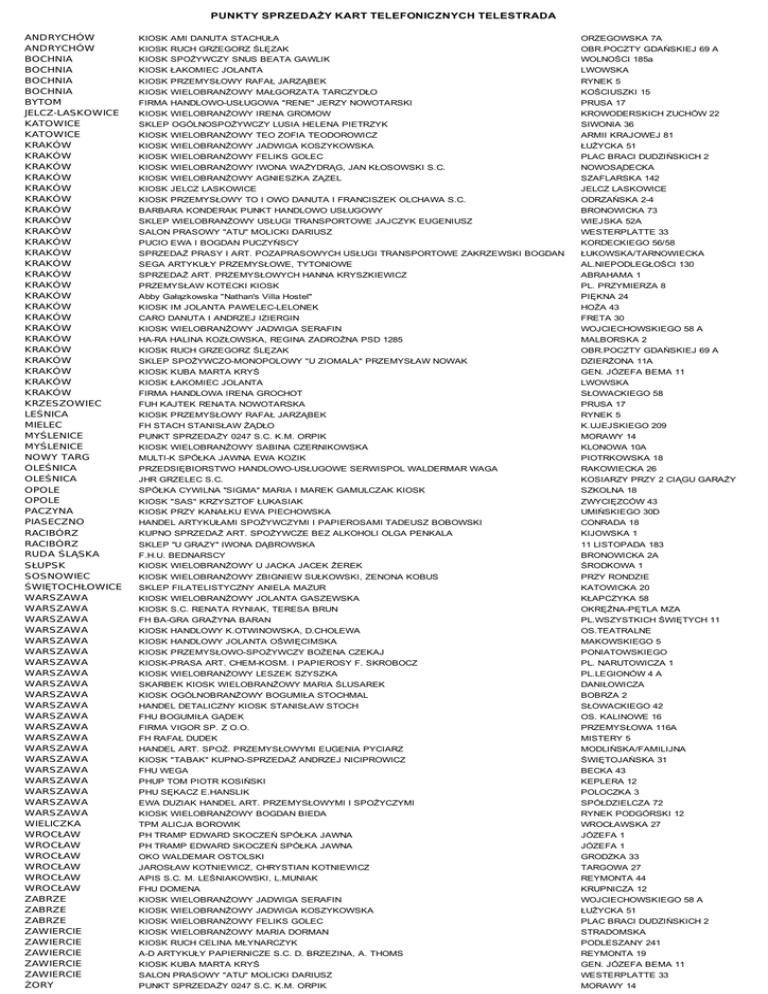 PUNKTY SPRZEDAŻY KART TELEFONICZNYCH TELESTRADA ANDRYCHÓW ANDRYCHÓW BOCHNIA BOCHNIA BOCHNIA BOCHNIA BYTOM JELCZ-LASKOWICE KATOWICE KATOWICE KRAKÓW KRAKÓW KRAKÓW KRAKÓW KRAKÓW KRAKÓW KRAKÓW KRAKÓW KRAKÓW KRAKÓW KRAKÓW KRAKÓW KRAKÓW KRAKÓW KRAKÓW KRAKÓW KRAKÓW KRAKÓW KRAKÓW KRAKÓW KRAKÓW KRAKÓW KRAKÓW KRAKÓW KRZESZOWIEC LEŚNICA MIELEC MYŚLENICE MYŚLENICE NOWY TARG OLEŚNICA OLEŚNICA OPOLE OPOLE PACZYNA PIASECZNO RACIBÓRZ RACIBÓRZ RUDA ŚLĄSKA SŁUPSK SOSNOWIEC ŚWIĘTOCHŁOWICE WARSZAWA WARSZAWA WARSZAWA WARSZAWA WARSZAWA WARSZAWA WARSZAWA WARSZAWA WARSZAWA WARSZAWA WARSZAWA WARSZAWA WARSZAWA WARSZAWA WARSZAWA WARSZAWA WARSZAWA WARSZAWA WARSZAWA WARSZAWA WARSZAWA WIELICZKA WROCŁAW WROCŁAW WROCŁAW WROCŁAW WROCŁAW WROCŁAW ZABRZE ZABRZE ZABRZE ZAWIERCIE ZAWIERCIE ZAWIERCIE ZAWIERCIE ZAWIERCIE ŻORY KIOSK KIOSK KIOSK KIOSK AMI DANUTA STACHUŁA RUCH GRZEGORZ ŚLĘZAK SPOŻYWCZY SNUS BEATA GAWLIK ŁAKOMIEC JOLANTA ORZEGOWSKA 7A OBR.POCZTY GDAŃSKIEJ 69 A WOLNOŚCI 185a LWOWSKA KIOSK PRZEMYSŁOWY RAFAŁ JARZĄBEK KIOSK WIELOBRANŻOWY MAŁGORZATA TARCZYDŁO FIRMA HANDLOWO-USŁUGOWA "RENE" JERZY NOWOTARSKI RYNEK 5 KOŚCIUSZKI 15 PRUSA 17 KIOSK WIELOBRANŻOWY IRENA GROMOW SKLEP OGÓLNOSPOŻYWCZY LUSIA HELENA PIETRZYK KIOSK WIELOBRANŻOWY TEO ZOFIA TEODOROWICZ KROWODERSKICH ZUCHÓW 22 SIWONIA 36 ARMII KRAJOWEJ 81 KIOSK KIOSK KIOSK KIOSK ŁUŻYCKA 51 PLAC BRACI DUDZIŃSKICH 2 NOWOSĄDECKA SZAFLARSKA 142 WIELOBRANŻOWY WIELOBRANŻOWY WIELOBRANŻOWY WIELOBRANŻOWY JADWIGA KOSZYKOWSKA FELIKS GOLEC IWONA WAŻYDRĄG, JAN KŁOSOWSKI S.C. AGNIESZKA ZĄZEL KIOSK JELCZ LASKOWICE KIOSK PRZEMYSŁOWY TO I OWO DANUTA I FRANCISZEK OLCHAWA S.C. BARBARA KONDERAK PUNKT HANDLOWO USŁUGOWY JELCZ LASKOWICE ODRZAŃSKA 2-4 BRONOWICKA 73 SKLEP WIELOBRANŻOWY USŁUGI TRANSPORTOWE JAJCZYK EUGENIUSZ SALON PRASOWY "ATU" MOLICKI DARIUSZ PUCIO EWA I BOGDAN PUCZYŃSCY WIEJSKA 52A WESTERPLATTE 33 KORDECKIEGO 56/58 SPRZEDAŻ PRASY I ART. POZAPRASOWYCH USŁUGI TRANSPORTOWE ZAKRZEWSKI BOGDAN SEGA ARTYKUŁY PRZEMYSŁOWE, TYTONIOWE SPRZEDAŻ ART. PRZEMYSŁOWYCH HANNA KRYSZKIEWICZ ŁUKOWSKA/TARNOWIECKA AL.NIEPODLEGŁOŚCI 130 ABRAHAMA 1 PRZEMYSŁAW KOTECKI KIOSK Abby Gałązkowska "Nathan's Villa Hostel" KIOSK IM JOLANTA PAWELEC-LELONEK CARO DANUTA I ANDRZEJ IZIERGIN PL. PRZYMIERZA 8 PIĘKNA 24 HOŻA 43 FRETA 30 KIOSK WIELOBRANŻOWY JADWIGA SERAFIN HA-RA HALINA KOZŁOWSKA, REGINA ZADROŻNA PSD 1285 KIOSK RUCH GRZEGORZ ŚLĘZAK WOJCIECHOWSKIEGO 58 A MALBORSKA 2 OBR.POCZTY GDAŃSKIEJ 69 A SKLEP SPOŻYWCZO-MONOPOLOWY "U ZIOMALA" PRZEMYSŁAW NOWAK KIOSK KUBA MARTA KRYŚ KIOSK ŁAKOMIEC JOLANTA DZIERŻONA 11A GEN. JÓZEFA BEMA 11 LWOWSKA FIRMA HANDLOWA IRENA GROCHOT FUH KAJTEK RENATA NOWOTARSKA KIOSK PRZEMYSŁOWY RAFAŁ JARZĄBEK FH STACH STANISŁAW ŻĄDŁO SŁOWACKIEGO 58 PRUSA 17 RYNEK 5 K.UJEJSKIEGO 209 PUNKT SPRZEDAŻY 0247 S.C. K.M. ORPIK KIOSK WIELOBRANŻOWY SABINA CZERNIKOWSKA MULTI-K SPÓŁKA JAWNA EWA KOZIK MORAWY 14 KLONOWA 10A PIOTRKOWSKA 18 PRZEDSIĘBIORSTWO HANDLOWO-USŁUGOWE SERWISPOL WALDERMAR WAGA JHR GRZELEC S.C. SPÓŁKA CYWILNA ''SIGMA'' MARIA I MAREK GAMULCZAK KIOSK RAKOWIECKA 26 KOSIARZY PRZY 2 CIĄGU GARAŻY SZKOLNA 18 KIOSK "SAS" KRZYSZTOF ŁUKASIAK KIOSK PRZY KANAŁKU EWA PIECHOWSKA HANDEL ARTYKUŁAMI SPOŻYWCZYMI I PAPIEROSAMI TADEUSZ BOBOWSKI KUPNO SPRZEDAŻ ART. SPOŻYWCZE BEZ ALKOHOLI OLGA PENKALA ZWYCIĘZCÓW 43 UMIŃSKIEGO 30D CONRADA 18 KIJOWSKA 1 SKLEP ''U GRAZY'' IWONA DĄBROWSKA F.H.U. BEDNARSCY KIOSK WIELOBRANŻOWY U JACKA JACEK ŻEREK 11 LISTOPADA 183 BRONOWICKA 2A ŚRODKOWA 1 KIOSK WIELOBRANŻOWY ZBIGNIEW SUŁKOWSKI, ZENONA KOBUS SKLEP FILATELISTYCZNY ANIELA MAZUR KIOSK WIELOBRANŻOWY JOLANTA GASZEWSKA PRZY RONDZIE KATOWICKA 20 KŁAPCZYKA 58 KIOSK S.C. RENATA RYNIAK, TERESA BRUN FH BA-GRA GRAŻYNA BARAN KIOSK HANDLOWY K.OTWINOWSKA, D.CHOLEWA KIOSK HANDLOWY JOLANTA OŚWIĘCIMSKA OKRĘŻNA-PĘTLA MZA PL.WSZYSTKICH ŚWIĘTYCH 11 OS.TEATRALNE MAKOWSKIEGO 5 KIOSK PRZEMYSŁOWO-SPOŻYWCZY BOŻENA CZEKAJ KIOSK-PRASA ART. CHEM-KOSM. I PAPIEROSY F. SKROBOCZ KIOSK WIELOBRANŻOWY LESZEK SZYSZKA PONIATOWSKIEGO PL. NARUTOWICZA 1 PL.LEGIONÓW 4 A SKARBEK KIOSK WIELOBRANŻOWY MARIA ŚLUSAREK KIOSK OGÓLNOBRANŻOWY BOGUMIŁA STOCHMAL HANDEL DETALICZNY KIOSK STANISŁAW STOCH DANIŁOWICZA BOBRZA 2 SŁOWACKIEGO 42 FHU BOGUMIŁA GĄDEK FIRMA VIGOR SP. Z O.O. FH RAFAŁ DUDEK HANDEL ART. SPOŻ. PRZEMYSŁOWYMI EUGENIA PYCIARZ OS. KALINOWE 16 PRZEMYSŁOWA 116A MISTERY 5 MODLIŃSKA/FAMILIJNA KIOSK "TABAK" KUPNO-SPRZEDAŻ ANDRZEJ NICIPROWICZ FHU WEGA PHUP TOM PIOTR KOSIŃSKI ŚWIĘTOJAŃSKA 31 BECKA 43 KEPLERA 12 PHU SĘKACZ E.HANSLIK EWA DUZIAK HANDEL ART. PRZEMYSŁOWYMI I SPOŻYCZYMI KIOSK WIELOBRANŻOWY BOGDAN BIEDA POLOCZKA 3 SPÓŁDZIELCZA 72 RYNEK PODGÓRSKI 12 TPM ALICJA BOROWIK PH TRAMP EDWARD SKOCZEŃ SPÓŁKA JAWNA PH TRAMP EDWARD SKOCZEŃ SPÓŁKA JAWNA OKO WALDEMAR OSTOLSKI WROCŁAWSKA 27 JÓZEFA 1 JÓZEFA 1 GRODZKA 33 JAROSŁAW KOTNIEWICZ, CHRYSTIAN KOTNIEWICZ APIS S.C. M. LEŚNIAKOWSKI, L.MUNIAK FHU DOMENA TARGOWA 27 REYMONTA 44 KRUPNICZA 12 KIOSK WIELOBRANŻOWY JADWIGA SERAFIN KIOSK WIELOBRANŻOWY JADWIGA KOSZYKOWSKA KIOSK WIELOBRANŻOWY FELIKS GOLEC WOJCIECHOWSKIEGO 58 A ŁUŻYCKA 51 PLAC BRACI DUDZIŃSKICH 2 KIOSK WIELOBRANŻOWY MARIA DORMAN KIOSK RUCH CELINA MŁYNARCZYK A-D ARTYKUŁY PAPIERNICZE S.C. D. BRZEZINA, A. THOMS KIOSK KUBA MARTA KRYŚ STRADOMSKA PODLESZANY 241 REYMONTA 19 GEN. JÓZEFA BEMA 11 SALON PRASOWY "ATU" MOLICKI DARIUSZ PUNKT SPRZEDAŻY 0247 S.C. K.M. ORPIK WESTERPLATTE 33 MORAWY 14