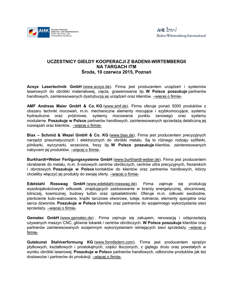 UCZESTNICY GIEŁDY KOOPERACJI Z BADENII-WIRTEMBERGII NA TARGACH ITM Środa, 10 czerwca 2015, Poznań Acsys Lasertechnik GmbH (www.acsys.de). Firma jest producentem urządzeń i systemów laserowych do obróbki materiałowej, cięcia, grawerowania itp. W Polsce poszukuje partnerów handlowych, zainteresowanych dystrybucją jej urządzeń oraz klientów. –więcej o firmieAMF Andreas Maier GmbH & Co. KG (www.amf.de). Firma oferuje ponad 5000 produktów z obszaru techniki mocowań, m.in. mechaniczne elementy mocujące i szybkomocujące, systemy hydrauliczne oraz próżniowe, systemy mocowania punktu zerowego oraz systemy modularne. Poszukuje w Polsce partnerów handlowych, zainteresowanych sprzedażą detaliczną jej rozwiązań oraz klientów. –więcej o firmieBiax – Schmid & Wezel GmbH & Co. KG (www.biax.de). Firma jest producentem precyzyjnych narzędzi pneumatycznych i elektrycznych do obróbki metalu. Są to różnego rodzaju szlifierki, pilnikarki, wyrzynarki, wrzeciona, frezy itp. W Polsce poszukuje klientów, zainteresowanych nabyciem jej produktów. –więcej o firmieBurkhardt+Weber Fertigungssysteme GmbH (www.burkhardt-weber.de). Firma jest producentem obrabiarek do metalu, m.in. 5-osiowych centrów obróbczych, centrów ultra precyzyjnych, frezarskich i obrotowych. Poszukuje w Polsce kontaktów do klientów oraz partnerów handlowych, którzy chcieliby włączyć jej produkty do swojej oferty. –więcej o firmieEdelstahl Rosswag GmbH (www.edelstahl-rosswag.de). Firma zajmuje się produkcją wysokojakościowych odkuwek, znajdujących zastosowanie w branży energetycznej, stoczniowej, lotniczej, kosmicznej, budowy turbin oraz optoelektroniki. Oferuje m.in. odkuwki swobodne, pierścienie kuto-walcowane, krążki tarczowe otworowe, tuleje, kołnierze, elementy specjalne oraz serca dzwonów. Poszukuje w Polsce klientów oraz partnerów do wzajemnego wykorzystania sieci sprzedaży. –więcej o firmieGematec GmbH (www.gematec.de) . Firma zajmuje się zakupem, renowacją i odsprzedażą używanych maszyn CNC, głównie tokarek i centrów obróbczych. W Polsce poszukuje klientów oraz partnerów zainteresowanych wzajemnym wykorzystaniem istniejących sieci sprzedaży. –więcej o firmieGutekunst Stahlverformung KG (www.formfedern.com). Firma jest producentem sprężyn płytkowych, kształtowych i prostokątnych, części tłoczonych, z giętego drutu oraz powstałych w wyniku obróbki laserowej. Poszukuje w Polsce partnerów handlowych, odbiorców produktów jak też dostawców i partnerów do produkcji. –więcej o firmie- Inductoheat Europe GmbH (www.inductoheat.eu). Firma oferuje standardowe i specjalne nagrzewnice i hartownice, nagrzewnice kuźnicze I induktory jak też elektroniczne przemienniki częstotliwości, posiada również hartownię usługową. Poszukuje w Polsce firm handlowych, agentów i dystrybutorów, zainteresowanych sprzedażą jej rozwiązań. –więcej o firmieKaindl Schleiftechnik Reiling GmbH (www.kaindl.de). Firma jest producentem szlifierek, maszyn do ostrzenia narzędzi oraz oprzyrządowania, jak wiertła czy ostrzałki. W Polsce poszukuje odbiorców zainteresowanych jej produktami. –więcej o firmieRenner GmbH Kompressoren (www.renner-kompressoren.de). Firma jest producentem sprężarek śrubowych z wtryskiem oleju i bezolejowych jak też kompresorów kolbowych i dużej rozpiętości mocy. Poszukuje w Polsce kandydatów na stanowisko Regionalny Dyrektor Sprzedaży w Polsce oraz klientów zainteresowanych jej rozwiązaniami. –więcej o firmie-ogłoszenie Regionalny Dyrektor SprzedażyRöhm GmbH (www.roehm.biz). Firma zajmuje się produkcją innowacyjnych rozwiązań do różnorodnych zastosowań. W ofercie firmy można znaleźć uchwyty wiertarskie, kły i uchwyty tokarskie, imadła, rozwiązania techniki automatyzacji, zaciski, cylindry, trzpienie, nowoczesne systemy mocowań, jak również rozwiązania specjalne. W Polsce poszukuje przedstawicieli handlowych, klientów oraz partnerów do sprzedaży detalicznej i hurtowej. –więcej o firmieRUD Ketten Rieger & Dietz GmbH & Co. KG (www.rud.com). Firma jest producentem zawiesi oraz szerokiej gamy łańcuchów używanych do zabezpieczenia ładunków w czasie manewrowania nimi i transportu, łańcuchów zabezpieczających opony pojazdów, śniegowych itp. Poszukuje w Polsce partnerów handlowych, dystrybutorów i klientów. -więcej o firmieSHW Werkzeugmaschinen GmbH (www.shw-wm.de). Firma zajmuje się budową maszyn do obróbki metalu, uniwersalnych frezarek i wiertarek, centrów obróbczych, frezarek łożowych itp. W Polsce poszukuje przedstawicieli handlowych, agentów i dystrybutorów, którzy byliby zainteresowani sprzedażą jej produktów, oraz klientów. Chciałaby też nawiązać kontakty z firmami polskimi zainteresowanymi wzajemnym wykorzystaniem sieci sprzedaży.–więcej o firmieWolf Maschinenbau AG (www.wolf-maschinenbau.de). Firma zajmuje się produkcją obrabiarek z cyklem obwodowym i liniowym. Jej produkty znajdują zastosowanie wszędzie, gdzie zachodzi potrzeba produkcji wielu precyzyjnych elementów w krótkim czasie, m.in. w przemyśle samochodowym, lotniczym i kosmicznym, elektrotechnice i elektronice, budowie maszyn oraz technice medycznej. Poszukuje w Polsce klientów zainteresowanych jej ofertą. –więcej o firmie-