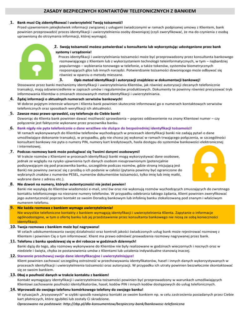 ZASADY BEZPIECZNYCH KONTAKTÓW TELEFONICZNYCH Z BANKIEM 1. Bank musi Cię zidentyfikować i uwierzytelnić Twoją tożsamość! Przed ujawnieniem jakiejkolwiek informacji związanej z usługami świadczonymi w ramach podpisanej umowy z Klientem, bank powinien przeprowadzić proces identyfikacji i uwierzytelnienia osoby dzwoniącej (czyli zweryfikować, że ma do czynienia z osobą uprawnioną do otrzymania informacji, której wymaga). 2. Swoją tożsamość możesz potwierdzać u konsultanta lub wykorzystując udostępnione przez bank systemy i urządzenia! Proces identyfikacji i uwierzytelniania tożsamości może być przeprowadzony przez konsultanta bankowego rozmawiającego z Klientem lub z wykorzystaniem technologii teleinformatycznych, w tym – najbardziej popularnego – wybierania tonowego w telefonie, a także tokenów, systemów biometrycznych rozpoznających głos lub innych narzędzi. Potwierdzanie tożsamości dzwoniącego może odbywać się również w oparciu o metody mieszane. 3. Opis metod identyfikacji i autoryzacji znajdziesz w dokumentacji bankowej! Stosowane przez banki mechanizmy identyfikacji i uwierzytelniania Klientów, jak również autoryzacji zlecanych telefonicznie transakcji, mają odzwierciedlenie w zapisach umów i regulaminów produktowych. Dokumenty te powinny również precyzować tryb informowania Klientów o zmianach stosowanych metod identyfikacji i uwierzytelniania. 4. Żądaj informacji o aktualnych numerach serwisów bankowych! W dobrze pojętym interesie własnym i Klienta bank powinien skutecznie informować go o numerach kontaktowych serwisów telefonicznych oraz sposobach weryfikacji ich aktualności. 5. Zawsze masz prawo sprawdzić, czy telefonuje do Ciebie bank! Dzwoniąc do Klienta bank powinien dawać możliwość sprawdzenia – poprzez oddzwonienie na znany Klientowi numer – czy połączenie jest faktycznie wykonane przez pracownika banku. 6. Bank nigdy nie pyta telefonicznie o dane wrażliwe nie służące do bezpośredniej identyfikacji tożsamości! W ramach wykonywanych do Klientów telefonów wychodzących w procesach identyfikacji banki nie zadają pytań o dane umożliwiające dokonanie transakcji, w przypadku, gdy nie chcesz jej wykonać w ramach trwającego połączenia, w szczególności konsultant bankowy nie pyta o numery PIN, numery kart kredytowych, hasła dostępu do systemów bankowości elektronicznej i internetowej. 7. Podczas rozmowy bank może posługiwać się Twoimi danymi osobowymi! W trakcie rozmów z Klientami w procesach identyfikacji banki mogą wykorzystywać dane osobowe, jednak ze względu na ryzyko ujawnienia tych danych osobom nieuprawnionym (potencjalnie podszywającym się pod pracownika banku, szczególnie podczas rozmów, gdzie stroną inicjującą jest Bank) nie powinny zwracać się z prośbą o ich podanie w całości (pytania powinny być ograniczone do wybranych znaków z numerów PESEL, numerów dokumentów tożsamości, tylko imię lub imię matki, wybrane dane z adresu etc.). 8. Nie dzwoń na numery, których autentyczności nie jesteś pewien! Banki nie wysyłają do Klientów wiadomości e-mail, sms’ów oraz nie wykonują rozmów wychodzących zmuszających do zwrotnego kontaktu telefonicznego na nieznane numery telefonów. W przypadku odebrania takiego żądania, Klient powinien zweryfikować jego autentyczność poprzez kontakt ze swoim Doradcą bankowym lub infolinią banku zlokalizowaną pod znanym i właściwym numerem telefonu. 9. Nie każda rozmowa z bankiem wymaga uwierzytelnienia! Nie wszystkie telefoniczne kontakty z bankiem wymagają identyfikacji i uwierzytelnienia Klienta. Zapytanie o informacje ogólnodostępne, w tym o ofertę banku lub jej przedstawienie przez konsultanta bankowego nie niosą ze sobą konieczności identyfikacji. 10. Twoja rozmowa z bankiem może być nagrywana! W celach udokumentowania swojej działalności oraz kontroli jakości świadczonych usług bank może rejestrować rozmowę z Klientem i powinien Cię o tym informować. Klient ma prawo odmówić prowadzenia rozmowy nagrywanej przez bank. 11. Telefonu z banku spodziewaj się w dni robocze w godzinach dziennych! Banki dążą do tego, aby rozmowy wykonywane do Klientów nie były realizowane w godzinach wieczornych i nocnych oraz w niedziele i święta, chyba że postanowienia umów z Klientami lub ustalenia indywidualne stanowią inaczej. 12. Starannie przechowuj swoje dane identyfikacyjne i uwierzytelniające! Klient powinien zachować szczególną ostrożność w przechowywaniu identyfikatorów, haseł i innych danych wykorzystywanych w procesach identyfikacji i uwierzytelnienia tożsamości oraz autoryzacji. W przypadku ich utraty powinien bezzwłocznie skontaktować się ze swoim bankiem. 13. Dbaj o poufność danych w trakcie kontaktu z bankiem! Kontakt wymagający identyfikacji i uwierzytelnienia tożsamości powinien być przeprowadzony w warunkach umożliwiających Klientowi zachowanie poufności identyfikatorów, haseł, kodów PIN i innych kodów dostępowych do usług telefonicznych. 14. Wprowadź do swojego telefonu komórkowego telefony do swojego banku! W sytuacjach „kryzysowych” w szybki sposób nawiążesz kontakt ze swoim bankiem np. w celu zastrzeżenia posiadanych przez Ciebie kart płatniczych, które zgubiłeś lub zostały Ci skradzione. Opracowano na podstawie: http://zbp.pl/dla-konsumentow/bezpieczny-bank/bankowosc-telefoniczna