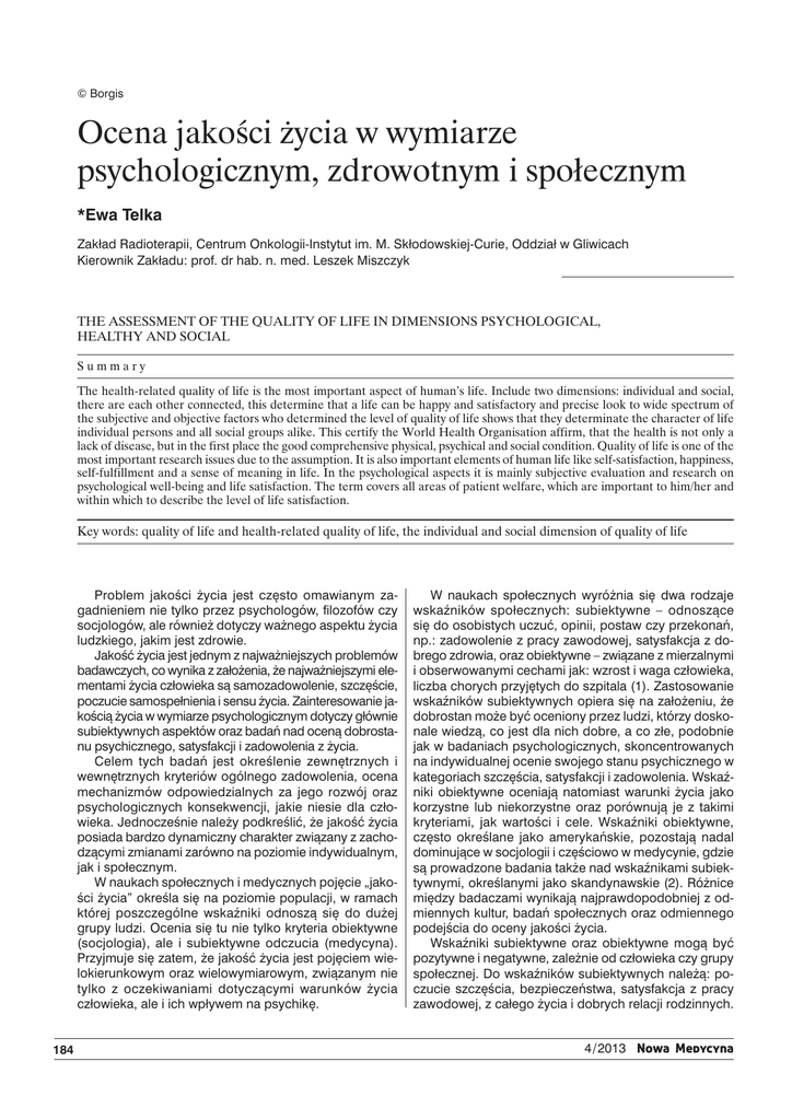 © Borgis Ocena jakości życia w wymiarze psychologicznym, zdrowotnym i społecznym *Ewa Telka Zakład Radioterapii, Centrum Onkologii-Instytut im. M. Skłodowskiej-Curie, Oddział w Gliwicach Kierownik Zakładu: prof. dr hab. n. med. Leszek Miszczyk The assessment of the quality of life in dimensions psychological, healthy and social Summary The health-related quality of life is the most important aspect of human’s life. Include two dimensions: individual and social, there are each other connected, this determine that a life can be happy and satisfactory and precise look to wide spectrum of the subjective and objective factors who determined the level of quality of life shows that they determinate the character of life individual persons and all social groups alike. This certify the World Health Organisation affirm, that the health is not only a lack of disease, but in the first place the good comprehensive physical, psychical and social condition. Quality of life is one of the most important research issues due to the assumption. It is also important elements of human life like self-satisfaction, happiness, self-fulfillment and a sense of meaning in life. In the psychological aspects it is mainly subjective evaluation and research on psychological well-being and life satisfaction. The term covers all areas of patient welfare, which are important to him/her and within which to describe the level of life satisfaction. Key words: quality of life and health-related quality of life, the individual and social dimension of quality of life Problem jakości życia jest często omawianym zagadnieniem nie tylko przez psychologów, filozofów czy socjologów, ale również dotyczy ważnego aspektu życia ludzkiego, jakim jest zdrowie. Jakość życia jest jednym z najważniejszych problemów badawczych, co wynika z założenia, że najważniejszymi elementami życia człowieka są samozadowolenie, szczęście, poczucie samospełnienia i sensu życia. Zainteresowanie jakością życia w wymiarze psychologicznym dotyczy głównie subiektywnych aspektów oraz badań nad oceną dobrostanu psychicznego, satysfakcji i zadowolenia z życia. Celem tych badań jest określenie zewnętrznych i wewnętrznych kryteriów ogólnego zadowolenia, ocena mechanizmów odpowiedzialnych za jego rozwój oraz psychologicznych konsekwencji, jakie niesie dla człowieka. Jednocześnie należy podkreślić, że jakość życia posiada bardzo dynamiczny charakter związany z zachodzącymi zmianami zarówno na poziomie indywidualnym, jak i społecznym. W naukach społecznych i medycznych pojęcie „jakości życia” określa się na poziomie populacji, w ramach której poszczególne wskaźniki odnoszą się do dużej grupy ludzi. Ocenia się tu nie tylko kryteria obiektywne (socjologia), ale i subiektywne odczucia (medycyna). Przyjmuje się zatem, że jakość życia jest pojęciem wielokierunkowym oraz wielowymiarowym, związanym nie tylko z oczekiwaniami dotyczącymi warunków życia człowieka, ale i ich wpływem na psychikę. 184 W naukach społecznych wyróżnia się dwa rodzaje wskaźników społecznych: subiektywne – odnoszące się do osobistych uczuć, opinii, postaw czy przekonań, np.: zadowolenie z pracy zawodowej, satysfakcja z dobrego zdrowia, oraz obiektywne – związane z mierzalnymi i obserwowanymi cechami jak: wzrost i waga człowieka, liczba chorych przyjętych do szpitala (1). Zastosowanie wskaźników subiektywnych opiera się na założeniu, że dobrostan może być oceniony przez ludzi, którzy doskonale wiedzą, co jest dla nich dobre, a co złe, podobnie jak w badaniach psychologicznych, skoncentrowanych na indywidualnej ocenie swojego stanu psychicznego w kategoriach szczęścia, satysfakcji i zadowolenia. Wskaźniki obiektywne oceniają natomiast warunki życia jako korzystne lub niekorzystne oraz porównują je z takimi kryteriami, jak wartości i cele. Wskaźniki obiektywne, często określane jako amerykańskie, pozostają nadal dominujące w socjologii i częściowo w medycynie, gdzie są prowadzone badania także nad wskaźnikami subiektywnymi, określanymi jako skandynawskie (2). Różnice między badaczami wynikają najprawdopodobniej z odmiennych kultur, badań społecznych oraz odmiennego podejścia do oceny jakości życia. Wskaźniki subiektywne oraz obiektywne mogą być pozytywne i negatywne, zależnie od człowieka czy grupy społecznej. Do wskaźników subiektywnych należą: poczucie szczęścia, bezpieczeństwa, satysfakcja z pracy zawodowej, z całego życia i dobrych relacji rodzinnych. 4/2013 Nowa Medycyna Ocena jakości życia w wymiarze psychologicznym, zdrowotnym i społecznym Natomiast do wskaźników obiektywnych należą: poziom bezrobocia, średnia długość życia człowieka, dochód krajowy brutto, wskaźnik śmiertelności i samobójstw (2-5). W licznych badaniach są one wykorzystywane do oceny jakości życia w kontekście zdrowia (6-9), zachowań i decyzji ekonomicznych (10) oraz niepełnosprawności (11). Obiektywne kryteria jakości życia są wykorzystywane najczęściej w socjologii i ekonomii, gdzie oblicza się globalne wskaźniki poziomu życia: ogólny dobrobyt, rozwój społeczeństw stosowany do poszczególnych jednostek i grup społecznych. Globalny wskaźnik jakości życia jest sumą różnych obiektywnych wskaźników cząstkowych odnoszących się do poszczególnych sfer życia: rodzinnej, psychicznej, fizycznej czy społecznej. Cummins (12) podkreśla, że oddzielny pomiar obu wskaźników jest niezbędny i chociaż kryteria obiektywne i subiektywne stanowią część pojęcia jakości życia, to jednak relacje występujące między nimi są słabe, czego dowodem jest zdrowie fizyczne człowieka wyrażone przez wskaźniki medyczne, a jego indywidualną ocenę kondycji fizycznej. Proponuje on interaktywny model jakości życia, w którym wskaźniki obiektywne i subiektywne wzajemnie na siebie oddziałują oraz są porównywane w celu wypracowa