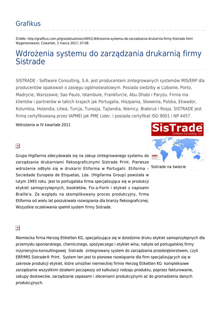 Grafikus Źródło: http://grafikus.com.pl/gra/aktualnosci/4053,Wdrozenia-systemu-do-zarzadzania-drukarnia-firmy-Sistrade.html Wygenerowano: Czwartek, 2 marca 2017, 07:08 Wdrożenia systemu do zarządzania drukarnią firmy Sistrade SISTRADE - Software Consulting, S.A. jest producentem zintegrowanych systemów MIS/ERP dla producentów opakowań o zasięgu ogólnoświatowym. Posiada siedziby w Lizbonie, Porto, Madrycie, Warszawie, Sao Paulo, Istambule, Frankfurcie, Abu Dhabi i Paryżu. Firma ma klientów i partnerów w takich krajach jak Portugalia, Hiszpania, Słowenia, Polska, Ekwador, Kolumbia, Holandia, Litwa, Turcja, Tunezja, Tajlandia, Niemcy, Białoruś i Rosja. SISTRADE jest firmą certyfikowaną przez IAPMEI jak PME Lider, i posiada certyfikat ISO 9001 i NP 4457. Wdrożenia w IV kwartale 2011 Grupa Higifarma zdecydowała się na zakup zintegrowanego systemu do zarządzania drukarniami fleksograficznymi Sistrade Print. Pierwsze wdrożenie odbyło się w drukarni Etiforma w Portugalii. Etiforma – Sistrade na świecie Sociedade Europeia de Etiquetas, Lda. (Higifarma Group) powstała w lutym 1993 roku. Jest to portugalska firma specjalizująca się w produkcji etykiet samoprzylepnych, bookletów, Fix-a-Form i etykiet z napisami Braille'a. Ze względu na skomplikowany proces produkcyjny, firma Etiforma od wielu lat poszukiwała rozwiązania dla branży fleksograficznej. Wszystkie oczekiwania spełnił system firmy Sistrade. Niemiecka firma Herzog Etiketten KG, specjalizująca się w dziedzinie druku etykiet samoprzylepnych dla przemysłu oponiarskiego, chemicznego, spożywczego i etykiet wina, nabyła od portugalskiej firmy inżynieryjno-konsultingowej Sistrade zintegrowany system do zarządzania przedsiębiorstwem, czyli ERP/MIS Sistrade® Print. System ten jest to pionowe rozwiązanie dla firm specjalizujących się w zakresie produkcji etykiet, które umożliwi niemieckiej firmie Herzog Etiketten KG kompleksowe zarządzanie wszystkimi działami począwszy od kalkulacji rodzaju produktu, poprzez fakturowanie, zakupy dostawców, zarządzanie zapasami i zleceniami produkcyjnymi aż do gromadzenia danych produkcyjnych. Litewska firma z Wilna, Spaudos Konturai, specjalizująca się w dziedzinie druku offsetowego, nabyła portugalski zintegrowany system do zarządzania przedsiębiorstwem – ERP/MIS Sistrade Print.Firma aktywnie inwestuje w najnowsze technologie drukowania i sprzęt, stając się liderem w dziedzinie druku czasopism, katalogów itp. Nabycie Sistrade Print pozwala firmie zarządzać istniejącymi procesami biznesowymi, od kontroli procesów biznesowych do procesu produkcyjnego. Oprogramowanie ERP Sistrade pozwala m.in. na stworzenie kalkulacji, fakturowanie, wydawanie zleceń produkcyjnych, gromadzenie danych produkcji online we wszystkich sektorach firmy, planowanie i nadzór produkcji, kontrolę kosztów poprzez raporty porównawcze, które umożliwiają szczegółowe porównanie szacunkowych kosztów i czasu w porównaniu do ilości produktów wytworzonych w czasie rzeczywistym. Uniflex - białoruska firma specjalizująca się w druku opakowań giętkich i etykiet samoprzylepnych nabyła zintegrowany system do zarządzania przedsiębiorstwem ERP|MIS Sistrade Print portugalskiej firmy Sistrade. Firma Uniflex po długim okresie negocjacji podjęła decyzję o nabyciu systemu Sistrade Print, który uwzględni wszystkie rodzaje działalności firmy, od opakowań giętkich do etykiet samoprzylepnych, pozwalając na parametryzację procesów i rodzajów pracy (kluczowy element projektu Sistrade Print). System można dostosować do każdego rodzaju pracy w dziedzinie fleksografii.Sistrade Print pozwala na zarządzanie i kontrolę procesów biznesowych (arkusze danych technicznych, kalkulacje, fakturowanie, CRM itd.) oraz procesów produkcji takich jak: wydawanie zleceń produkcyjnych, gromadzenie danych dotyczących produkcji on-line we wszystkich sektorach firmy, nadzór nad produkcją, kontrola kosztów poprzez raporty porównawcze, które umożliwiają szczegółowe porównanie szacunkowych kosztów i czasu z ilością produktów wyprodukowanych w czasie rzeczywistym.