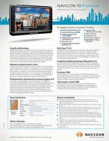 NAVIGON 70 Premium " 5,0 Wyświetlacz 5,0′ (12.7 cm) | Europe 43 Przegląd najważniejszych funkcji Bardzo duży wyświetlacz 5,0" Czujnik zbliżeniowy NOWOŚĆ Aktywny asystent pasa ruchu NOWOŚĆ Profesjonalne sterowanie za pomocą głosu 2.0 City View 3D 2.0 Urządzenie głośnomówiące Bluetooth 2.0 Czujnik zbliżeniowy dostępny jest jedynie u nas i pozwala na jeszcze bardziej komfortową obsługę urządzenia NAVIGON – w sposób bezdotykowy. Po zbliżeniu ręki do wyświetlacza przedstawiane są na przykład punkty NAVIGON MyBest POI w najbliższej okolicy. Rozszerzenie widocznego obszaru mapy dzięki ukrytym polom obsługi zapewnia idealny widok, gdyż wyświetlane są tylko najważniejsze dla Państwa informacje. Dzięki temu innowa – cyjnemu czujnikowi możecie Państwo całkowicie skoncentrować się na drodze i spokojnie dotrzeć do celu. Aktywny asystent pasa ruchu przedstawia realistycznie w formie dynamicznej animacji rzeczywisty przebieg drogi wraz z zakrętami. W odpowiednim czasie pokazuje nie tylko, na jakim zmienić pas ruchu, ale także w jakim momencie dokonać tego manewru. Dzięki temu możliwe jest oszacowanie odstępów pomiędzy różnymi manewrami i zmianami pasa ruchu. Wszystko to zapewnia lepszą orientację i tym samym bezpieczne podróżowanie, dzięki czemu możecie Państwo bez stresu docierać do celu. Profesjonalne sterowanie za pomocą głosu 2.0 City View 3D 2.0 pozwala na bezstresową jazdę po obcych miastach, gdyż przedstawia budynki w realistycznym wymiarze 3D. Wraz z kolorami fasad budynków, kształtami dachów i wszystkim, co ułatwia orientację. Poza tym domy w pobliżu oraz cele specjalne przedstawiane są w sposób przezroczysty, aby zapewnić stały podgląd na przebieg trasy i umiejscowienie punktów POI. Urządzenie głośnomówiące Bluetooth 2.0 umożliwia jednoczesne podłączenie dwóch telefonów i wygodne zmienianie pomiędzy telefonem służbowym i prywatnym. Wszystko to bez uciążliwej kolejnej instalacji. Dzięki temu nie musicie Państwo odrywać rąk od kierownicy i możecie przez cały czas skupić się na drodze. Premium TMC kanał wiadomości o ruchu drogowym (Traffic Message Channel) spełnia wysokie wymagania. Premium oznacza jeszcze aktualniejsze i bardziej szczegółowe informacje o wszystkich przeszkodach, które blokują, przekierowują lub wstrzymują ruch. Sterownie za pomocą głosu nowej generacji zmienia urządzenie NAVIGON w inteligentnego słuchacza: Wszystkie ważna funkcje mogą być wygodnie sterowne głosem. Z urządzeniem NAVIGON można rozmawiać normalnie, jak ze znajomym, które na przykład pyta się o najbliższą włoską restaurację. Albo można wypowiedzieć numer telefonu lub nazwisko z listy kontaktów, NAVIGON wybierze je w precyzyjny sposób. Dzięki temu można cały czas zachować kontrolę – prawie nie odrywają rąk od kierownicy. Informacja o trasie TMC Dane techniczne Ważne wskazówki Mapa Europy NAVIGON 70 Premium (43 krajów) Ekran: Ekran dotykowy w formacie 5,0′ 16 : 9 GPS: ST-AGPS System operacyjny: Windows CE Pamięć: 4 GB Flash / 128 MB RAM Procesor: STMicroelectronics Cartesio STA 2064 Akumulator: 1400 mAh bateria litowa Ciężar: 184 g Wymiary: 137,4 mm x 83 mm x 15,3 mm w przypadku komunikatu o zatorze funkcja ta pokazuje trasę alternatywną o zaktualizowanej odległości i czasie przybycia na miejsce. Użytkownik decyduje, czy w jego przypadku objazd jest korzystny, czy też chce utrzymać pierwotną trasę. Wymagania systemowe odnośnie komputera: Windows XP / Vista, napęd CD-ROM, gniazdo USB i czytnik kart (micro)SD/MMC (zalecany), Adobe Acrobat Reader 5.0 Języki: B, BG, CZ, DK, E, F, FIN, GR1, H, HR, I, LT, LV, N, NL, P, PL, RO, RUS1, S, SK, SL, TR i UK. Bezpłatny odbiór TMC możliwy jest w następujących krajach: A, B, CH, CZ, D, DK, E, I, N, NL, S. Odbiór Premium TMC w D, F, FIN, H, N, PL, S, SLO, UK jest płatny (w zależności od wariantu produuktu i kraju). Informacja o radarach nie jest dozwolona we wszystkich krajach (CH, FL). Należy uzyskać informacje o sytuacji prawnej w kraju, będącym celem podróży. Profesjonalne sterowanie za pomocą głosu 2.0 dostępne w językach: angielski, czeski, duński, francuski, grecki, hiszpański, holenderski, portugalski, szwedzki, włoski. Usługi Tekst mówiony, Syntezator mowy TMC dostępne w językach: angielski, czeski, duński, fiński, francuski, grecki, hiszpański, holenderski, norweski, portugalski, szwedzki, włoski. W przypadku pytań zapraszamy na naszą stronę www.navigon.com w dziale serwisowym. Stan: 05/2010 Zakres dostawy PNA – NAVIGON 70 Premium | Skrócona instrukcja Przewód do ładowania w samochodzie zintegrowany z anteną TMC Uchwyt | Preinstalowane mapy 43 krajów | Kabel USB Dodatkowe informacje można uzyskać na stronie www.navigon.com Premium TMC Informacja o trasie TMC Tekst mówiony Reality View Pro Informacja o radarach NAVIGON FreshMaps 80 % rabat 1 Oprócz klawiatury Bluetooth.