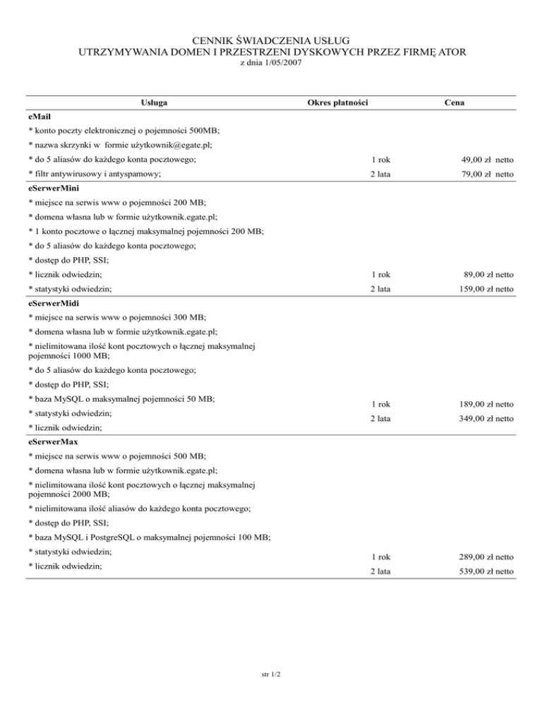 CENNIK ŚWIADCZENIA USŁUG UTRZYMYWANIA DOMEN I PRZESTRZENI DYSKOWYCH PRZEZ FIRMĘ ATOR z dnia 1/05/2007 Usługa Okres płatności Cena eMail * konto poczty elektronicznej o pojemności 500MB; * nazwa skrzynki w formie uż[email protected]; * do 5 aliasów do każdego konta pocztowego; 1 rok 49,00 zł netto * filtr antywirusowy i antyspamowy; 2 lata 79,00 zł netto * licznik odwiedzin; 1 rok 89,00 zł netto * statystyki odwiedzin; 2 lata 159,00 zł netto 1 rok 189,00 zł netto 2 lata 349,00 zł netto 1 rok 289,00 zł netto 2 lata 539,00 zł netto eSerwerMini * miejsce na serwis www o pojemności 200 MB; * domena własna lub w formie użytkownik.egate.pl; * 1 konto pocztowe o łącznej maksymalnej pojemności 200 MB; * do 5 aliasów do każdego konta pocztowego; * dostęp do PHP, SSI; eSerwerMidi * miejsce na serwis www o pojemności 300 MB; * domena własna lub w formie użytkownik.egate.pl; * nielimitowana ilość kont pocztowych o łącznej maksymalnej pojemności 1000 MB; * do 5 aliasów do każdego konta pocztowego; * dostęp do PHP, SSI; * baza MySQL o maksymalnej pojemności 50 MB; * statystyki odwiedzin; * licznik odwiedzin; eSerwerMax * miejsce na serwis www o pojemności 500 MB; * domena własna lub w formie użytkownik.egate.pl; * nielimitowana ilość kont pocztowych o łącznej maksymalnej pojemności 2000 MB; * nielimitowana ilość aliasów do każdego konta pocztowego; * dostęp do PHP, SSI; * baza MySQL i PostgreSQL o maksymalnej pojemności 100 MB; * statystyki odwiedzin; * licznik odwiedzin; str 1/2 Usługa Okres płatności Cena eSerwerPRO * miejsce na serwis www o pojemności 1000 MB; * domena własna lub w formie użytkownik.egate.pl; * nielimitowana ilość kont pocztowych o łącznej maksymalnej pojemności 3000 MB; * nielimitowana ilość aliasów do każdego konta pocztowego; * dostęp do PHP, SSI; * baza MySQL i PostgreSQL o maksymalnej pojemności 250 MB; * statystyki odwiedzin; 1 rok 349,00 zł netto 2 lata 649,00 zł netto .pl 1 rok 61,00 zł / 89,00 zł netto funkcjonalnej (.com.pl, .net.pl, media.pl itp.) 1 rok 46,00 zł / 68,00 zł netto regionalnej (.waw.pl, poznan.pl itp.) 1 rok 16,00 zł / 39,00 zł netto .com, .net, .org 1 rok 23,00 zł / 49,00 zł netto .eu 1 rok 24,00 zł / 39,00 zł netto .eu - odnowienie domeny z okresu kwarantanny 1 rok 100,00 zł netto * licznik odwiedzin; Rejestracja / odnowienie domeny - stawka vat na wszystkie pozycje z cennika - 22% str 2/2