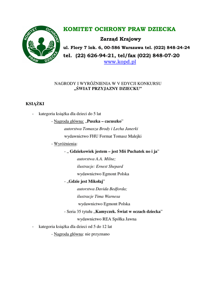 KOMITET OCHRONY PRAW DZIECKA Zarząd Krajowy ul. Flory 7 lok. 6, 00-586 Warszawa tel. (022) 848-24-24 tel. (22) 626-94-21, tel/fax (022) 848-07-20 www.kopd.pl NAGRODY I WYRÓŻNIENIA W V EDYCJI KONKURSU „ŚWIAT PRZYJAZNY DZIECKU” KSIĄŻKI - kategoria książka dla dzieci do 5 lat - Nagroda główna: „Puszka – cacuszko” autorstwa Tomasza Brody i Lecha Janerki wydawnictwo FHU Format Tomasz Malejki - Wyróżnienia: - „ Gdziekowiek jestem – jest Miś Puchatek no i ja” autorstwa A.A. Milne; ilustracje: Ernest Shepard wydawnictwo Egmont Polska - „Gdzie jest Mikołaj” autorstwa Davida Bedforda; ilustracje Tima Warnesa wydawnictwo Egmont Polska - Seria 35 tytułu „Kamyczek. Świat w oczach dziecka” wydawnictwo REA Spółka Jawna - kategoria książka dla dzieci od 5 do 12 lat - Nagroda główna: nie przyznano - Wyróżnienia: - Seria: „W lesie Marcina – O jeżu, który znalazł przyjaciela, O zebrze, która chciała być w kwiatki; O żyrafie, która chciała zobaczyć śnieg” autorstwa Anny Onichimowskiej ilustracje: Joanna Sedlaczek wydawnictwo ARKADY - „Polskie baśnie i legendy” wybór: Grzegorz Leszczyński ilustracje: Maria Ekier wydawnictwo NOWA ERA - „ Babcia na jabłoni” autorstwa Miry Lobe ilustracje Mirosław Pokora Wydawnictwo DWIE SIOSTRY - „Klementyna lubi kolor czerwony” autorstwa K. Boglar ilustracje Bohdan Butenko Wydawnictwo DWIE SIOSTRY - „Kupa – przyrodnicza wycieczka na stronę” autorstwa Nicoli Davies ilustracje Neala Laytona Wydawnictwo DWIE SIOSTRY - kategoria wydawnictwo edukacyjne - Nagroda Główna: Seria Zielnik: „Zielnik. Drzewa i krzewy liściaste”; „Zielnik. Kwiaty pól i łąk” autorstwa Agnieszki Rakłajtis – Zawady oraz „Zioła łąk i ogrodów” autorstwa Henryka Garbarczyka Wydawnictwo ARKADY - Wyróżnienia: - „Już w szkole. Lubie rysować i kolorować kl 0” autorstwa Katarzyny Skoczylas i Elżbiety Waszkiewicz - Seria zeszytów: „Już w szkole. Chcę wiedzieć więcej kl 1,2,3” autorstwa: Marianny Kumor i Hanny Klimkowskiej - „Już w szkole. Lubię pisać i rysować kl 1” autorstwa: Danuty Kochanowskiej i Anny Koślar Wydawnictwo NOWA ERA ZABAWKI - kategoria zabawka dla dzieci do 3 lat - Nagroda główna: „Moje pierwsze gry” firmy GRANNA - Wyróżnienia: „Przyjazne ZOO” LEGO Duplo – LEGO POLSKA - kategoria zabawka dla dzieci od 3 do 7 lat - Nagroda główna: „Ach te koty” gra planszowa firma KALIMBA Natalia Luniak -Wyróżnienia: - „Plus & Minus” - „Czarny kot” - „Liczydło” - „Memory” - „Kolorowanki na CD” Firma KALIMBA Natalia Luniak - „Pociąg pasażerski” firma LEGO Polska - kategoria zabawka dla dzieci od 7 do 12 lat - Nagroda główna: nie przyznano - Wyróżnienia: - „Przemocy powiedz NIE” historyjki obrazkowe firma Educarium - „Zabawkowy zestaw konstrukcyjny Eccolo-Mini” firma Ecco-Art MULTIMEDIA - Nagroda główna: „Karampuk” książka do słuchania 4 CD Akademia Rozwoju Wyobraźni „BUKA” s.c. - Wyróżnienie: „Reksio i kapiten Nemo” firma Aidem Media AKCESORIA - Nagroda główna: nie przyznano - Wyróżnienie: nie przyznano