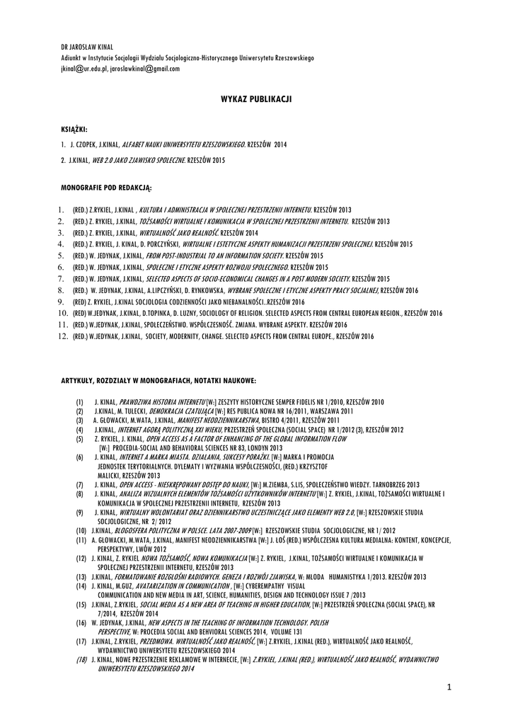 DR JAROSŁAW KINAL Adiunkt w Instytucie Socjologii Wydziału Socjologiczno-Historycznego Uniwersytetu Rzeszowskiego [email protected], [email protected] WYKAZ PUBLIKACJI KSIĄŻKI: 1. J. CZOPEK, J.KINAL, ALFABET NAUKI UNIWERSYTETU RZESZOWSKIEGO. RZESZÓW 2014 2. J.KINAL, WEB 2.0 JAKO ZJAWISKO SPOŁECZNE. RZESZÓW 2015 MONOGRAFIE POD REDAKCJĄ: 1. 2. 3. 4. 5. 6. 7. 8. 9. 10. 11. 12. (RED.) Z.RYKIEL, J.KINAL , KULTURA I ADMINISTRACJA W SPOŁECZNEJ PRZESTRZENII INTERNETU. RZESZÓW 2013 (RED.) Z. RYKIEL, J.KINAL, TOŻSAMOŚCI WIRTUALNE I KOMUNIKACJA W SPOŁECZNEJ PRZESTRZENII INTERNETU . RZESZÓW 2013 (RED.) Z. RYKIEL, J.KINAL, WIRTUALNOŚĆ JAKO REALNOŚĆ. RZESZÓW 2014 (RED.) Z. RYKIEL, J. KINAL, D. PORCZYŃSKI, WIRTUALNE I ESTETYCZNE ASPEKTY HUMANIZACJI PRZESTRZENI SPOŁECZNEJ. RZESZÓW 2015 (RED.) W. JEDYNAK, J.KINAL, FROM POST-INDUSTRIAL TO AN INFORMATION SOCIETY. RZESZÓW 2015 (RED.) W. JEDYNAK, J.KINAL, SPOŁECZNE I ETYCZNE ASPEKTY ROZWOJU SPOŁECZNEGO. RZESZÓW 2015 (RED.) W. JEDYNAK, J.KINAL, SELECTED ASPECTS OF SOCIO-ECONOMICAL CHANGES IN A POST MODERN SOCIETY. RZESZÓW 2015 (RED.) W. JEDYNAK, J.KINAL, A.LIPCZYŃSKI, D. RYNKOWSKA, WYBRANE SPOŁECZNE I ETYCZNE ASPEKTY PRACY SOCJALNEJ, RZESZÓW 2016 (RED) Z. RYKIEL, J.KINAL SOCJOLOGIA CODZIENNOŚCI JAKO NIEBANALNOŚCI..RZESZÓW 2016 (RED) W.JEDYNAK, J.KINAL, D.TOPINKA, D. LUZNY, SOCIOLOGY OF RELIGION. SELECTED ASPECTS FROM CENTRAL EUROPEAN REGION., RZESZÓW 2016 (RED.) W.JEDYNAK, J.KINAL, SPOŁECZEŃSTWO. WSPÓŁCZESNOŚĆ. ZMIANA. WYBRANE ASPEKTY. RZESZÓW 2016 (RED.) W.JEDYNAK, J.KINAL, SOCIETY, MODERNITY, CHANGE. SELECTED ASPECTS FROM CENTRAL EUROPE., RZESZÓW 2016 ARTYKUŁY, ROZDZIAŁY W MONOGRAFIACH, NOTATKI NAUKOWE: (1) (2) (3) (4) (5) (6) (7) (8) (9) (10) (11) (12) (13) (14) (15) (16) (17) (18) J. KINAL, PRAWDZIWA HISTORIA INTERNETU [W:] ZESZYTY HISTORYCZNE SEMPER FIDELIS NR 1/2010, RZESZÓW 2010 J.KINAL, M. TUŁECKI, DEMOKRACJA CZATUJĄCA [W:] RES PUBLICA NOWA NR 16/2011, WARSZAWA 2011 A. GŁOWACKI, M.WATA, J.KINAL, MANIFEST NEODZIENNIKARSTWA, BISTRO 4/2011, RZESZÓW 2011 J.KINAL, INTERNET AGORĄ POLITYCZNĄ XXI WIEKU, PRZESTRZEŃ SPOŁECZNA (SOCIAL SPACE) NR 1/2012 (3), RZESZÓW 2012 Z. RYKIEL, J. KINAL, OPEN ACCESS AS A FACTOR OF ENHANCING OF THE GLOBAL INFORMATION FLOW [W:] PROCEDIA-SOCIAL AND BEHAVIORAL SCIENCES NR 83, LONDYN 2013 J. KINAL, INTERNET A MARKA MIASTA. DZIAŁANIA, SUKCESY PORAŻKI. [W:] MARKA I PROMOCJA JEDNOSTEK TERYTORIALNYCH. DYLEMATY I WYZWANIA WSPÓŁCZESNOŚCI, (RED.) KRZYSZTOF MALICKI, RZESZÓW 2013 J. KINAL, OPEN ACCESS - NIESKRĘPOWANY DOSTĘP DO NAUKI, [W:] M.ZIEMBA, S.LIS, SPOŁECZEŃSTWO WIEDZY. TARNOBRZEG 2013 J. KINAL, ANALIZA WIZUALNYCH ELEMENTÓW TOŻSAMOŚCI UŻYTKOWNIKÓW INTERNETU [W:] Z. RYKIEL, J.KINAL, TOŻSAMOŚCI WIRTUALNE I KOMUNIKACJA W SPOŁECZNEJ PRZESTRZENII INTERNETU, RZESZÓW 2013 J. KINAL, WIRTUALNY WOLONTARIAT ORAZ DZIENNIKARSTWO UCZESTNICZĄCE JAKO ELEMENTY WEB 2.0, [W:] RZESZOWSKIE STUDIA SOCJOLOGICZNE, NR 2/ 2012 J.KINAL, BLOGOSFERA POLITYCZNA W POLSCE. LATA 2007-2009 [W:] RZESZOWSKIE STUDIA SOCJOLOGICZNE, NR 1/ 2012 A. GŁOWACKI, M.WATA, J.KINAL, MANIFEST NEODZIENNIKARSTWA [W:] J. ŁOŚ (RED.) WSPÓŁCZESNA KULTURA MEDIALNA: KONTENT, KONCEPCJE, PERSPEKTYWY, LWÓW 2012 J. KINAL, Z. RYKIEL NOWA TOŻSAMOŚĆ, NOWA KOMUNIKACJA [W:] Z. RYKIEL, J.KINAL, TOŻSAMOŚCI WIRTUALNE I KOMUNIKACJA W SPOŁECZNEJ PRZESTRZENII INTERNETU, RZESZÓW 2013 J.KINAL, FORMATOWANIE ROZGŁOŚNI RADIOWYCH. GENEZA I ROZWÓJ ZJAWISKA, W: MŁODA HUMANISTYKA 1/2013. RZESZÓW 2013 J. KINAL, M.GUZ, AVATARIZATION IN COMMUNICATION , [W:] CYBEREMPATHY VISUAL COMMUNICATION AND NEW MEDIA IN ART, SCIENCE, HUMANITIES, DESIGN AND TECHNOLOGY ISSUE 7 /2013 J.KINAL, Z.RYKIEL, SOCIAL MEDIA AS A NEW AREA OF TEACHING IN HIGHER EDUCATION, [W:] PRZESTRZEŃ SPOŁECZNA (SOCIAL SPACE), NR 7/2014, RZESZÓW 2014 W. JEDYNAK, J.KINAL, NEW ASPECTS IN THE TEACHING OF INFORMATION TECHNOLOGY. POLISH PERSPECTIVE, W: PROCEDIA SOCIAL AND BEHVIORAL SCIENCES 2014, VOLUME 131 J.KINAL, Z.RYKIEL, PRZEDMOWA. WIRTUALNOŚĆ JAKO REALNOŚĆ, [W:] Z.RYKIEL, J.KINAL (RED.), WIRTUALNOŚĆ JAKO REALNOŚĆ, WYDAWNICTWO UNIWERSYTETU RZESZOWSKIEGO 2014 J. KINAL, NOWE PRZESTRZENIE REKLAMOWE W INTERNECIE, [W:] Z.RYKIEL, J.KINAL (RED.), WIRTUALNOŚĆ JAKO REALNOŚĆ, WYDAWNICTWO UNIWERSYTETU RZESZOWSKIEGO 2014 1 (19) H. KOTARSKI, J. KINAL SOCIAL CAPITAL AND IT CAPITAL AS A FACTORS CREATING THE SOCIETY OF KNOWLEDGE. MEDITERRANEAN JOURNAL OF SOCIAL SCIENCES VOL 5 NO 13 (20) S.WILK, J.KINAL FLOODING IN POLAND IN 2010 AS A EXEMPLIFICATION OF EFFORTS OF THE POLISH SOCIAL WORK SERVICES IN CASE OF DISASTER (WSPÓLNIE Z DR S.WILKIEM). MEDITERRANEAN JOURNAL OF SOCIAL SCIENCES VOL 5 NO 13, (21) W. JEDYNAK, J.KINAL, ETHICAL AND TECHNOLOGICAL ASPECTS OF THE LEARNING PROCESS IN SOCIOLOGY,[W:] PROCEDIA SOCIAL AND BEHVIORAL SCIENCES 2014, VOLUME 140, 22.08.2014, PAGES 328-332 (22) J. KINAL, Z. RYKIEL, TWORZENIE I ZARZĄDZANIE REDAKCJĄ NISKOBUDŻETOWEGO MIĘDZYNARODOWEGO CZASOPISMA NAUKOWEGO. STUDIUM PRZYPADKU CZASOPISMA „PRZESTRZEŃ SPOŁECZNA” („SOCIAL SPACE”) , [W:] B. POWICHROWSKA, A. PROKOPIUK, W KIERUNKU GOSPODARKI ELEKTRONICZNEJ – WYZWANIA, NARZĘDZIA, DOBRE PRAKTYKI. TOM 2. PUBLIKACJE ELEKTRONICZNE W NAUCE I PRAKTYCE. BIAŁYSTOK 2014 (23) J.KINAL, NOWE MEDIA W KONTEKŚCIE AGENDA-SETTING. PRZEMIANA FORM WPŁYWU MEDIALNEGO W SPOŁECZEŃSTWIE POSTMEDIALNYM, [W:] W. JEDYNAK (RED.) SPOŁECZNE I ETYCZNE WYMIARY PRZEMIAN W ZMODERNIZOWANYM SPOŁECZEŃSTWIE. RZESZÓW 2014 (24) J. KINAL, M. KINAL - CROUDSOURCING (AS A PART OF THE INFORMATION SOCIETY) AND LOCAL DEVELOPMENT. THE ANALYSIS OF THE ACTIVITIES ASSOCIATED WITH THE INTRODUCTION OF CIVIL BUDGET OF RZESZOW IN 2014-2015. [W:] W. JEDYNAK, H. NAGY, L. ARDELEAN (RED.) LOCAL DEVELOPMENT IN THE CENTRAL EUROPEAN PERSPECTIVE. RZESZÓW 2015. (25) J. KINAL, BRAND PROMOTION OF VIRTUAL SPACE AS AN EXAMPLE OF CHANGES WITHIN THE MEANING OF THE CONCEPT OF "PROMOTION OF THE CITY". RZESZÓW 2015 (26) J.KINAL, BRAND PROMO