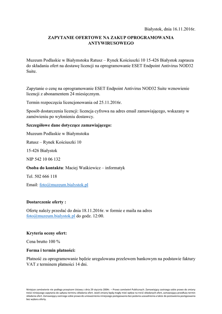 Białystok, dnia 16.11.2016r. ZAPYTANIE OFERTOWE NA ZAKUP OPROGRAMOWANIA ANTYWIRUSOWEGO Muzeum Podlaskie w Białymstoku Ratusz – Rynek Kościuszki 10 15-426 Białystok zaprasza do składania ofert na dostawę licencji na oprogramowanie ESET Endpoint Antivirus NOD32 Suite. Zapytanie o cenę na oprogramowanie ESET Endpoint Antivirus NOD32 Suite wznowienie licencji z abonamentem 24 miesięcznym. Termin rozpoczęcia licencjonowania od 25.11.2016r. Sposób dostarczenia licencji: licencja cyfrowa na adres email zamawiającego, wskazany w zamówieniu po wyłonieniu dostawcy. Szczegółowe dane dotyczące zamawiającego: Muzeum Podlaskie w Białymstoku Ratusz – Rynek Kościuszki 10 15-426 Białystok NIP 542 10 06 132 Osoba do kontaktu: Maciej Waśkiewicz – informatyk Tel. 502 666 118 Email: [email protected] Dostarczenie oferty : Ofertę należy przesłać do dnia 18.11.2016r. w formie e maila na adres [email protected] do godz. 12:00. Kryteria oceny ofert: Cena brutto 100 % Forma i termin płatności: Płatność za oprogramowanie będzie uregulowana przelewem bankowym na podstawie faktury VAT z terminem płatności 14 dni. Niniejsze zamówienie nie podlega przepisom Ustawy z dnia 29 stycznia 2004r. – Prawo zamówień Publicznych. Zamawiający zastrzega sobie prawo do zmiany treści niniejszego zapytania do upływu terminu składania ofert. Jeżeli zmiany będą mogły mieć wpływ na treść składanych ofert, zamawiający przedłuży termin składania ofert. Zamawiający zastrzega sobie prawo do unieważnienia niniejszego postępowania bez podania uzasadnienia a także do postawienia postępowania bez wyboru oferty.