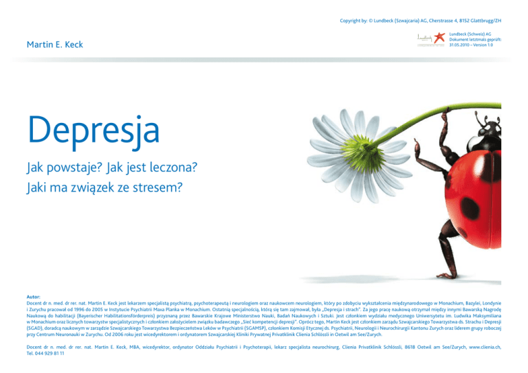 Copyright by: © Lundbeck (Szwajcaria) AG, Cherstrasse 4, 8152 Glattbrugg/ZH Martin E. Keck competence in cns Lundbeck (Schweiz) AG Dokument letztmals geprüft: 31.05.2010 – Version 1.0 Depresja Jak powstaje? Jak jest leczona? Jaki ma związek ze stresem? Autor: Docent dr n. med. dr rer. nat. Martin E. Keck jest lekarzem specjalistą psychiatrą, psychoterapeutą i neurologiem oraz naukowcem neurologiem, który po zdobyciu wykształcenia międzynarodowego w Monachium, Bazylei, Londynie i Zurychu pracował od 1996 do 2005 w Instytucie Psychiatrii Maxa Planka w Monachium. Ostatnią specjalnością, którą się tam zajmował, była „Depresja i strach”. Za jego pracę naukową otrzymał między innymi Bawarską Nagrodę Naukową do habilitacji (Bayerischer Habilitationsförderpreis) przyznaną przez Bawarskie Krajowe Ministerstwo Nauki, Badań Naukowych i Sztuki. Jest członkiem wydziału medycznego Uniwersytetu im. Ludwika Maksymiliana w Monachium oraz licznych towarzystw specjalistycznych i członkiem założycielem związku badawczego „Sieć kompetencji depresji”. Oprócz tego, Martin Keck jest członkiem zarządu Szwajcarskiego Towarzystwa ds. Strachu i Depresji (SGAD), doradcą naukowym w zarządzie Szwajcarskiego Towarzystwa Bezpieczeństwa Leków w Psychiatrii (SGAMSP), członkiem Komisji Etycznej ds. Psychiatrii, Neurologii i Neurochirurgii Kantonu Zurych oraz liderem grupy roboczej przy Centrum Neuronauki w Zurychu. Od 2006 roku jest wicedyrektorem i ordynatorem Szwajcarskiej Kliniki Prywatnej Privatklinik Clienia Schlössli in Oetwil am See/Zurych. Docent dr n. med. dr rer. nat. Martin E. Keck, MBA, wicedyrektor, ordynator Oddziału Psychiatrii i Psychoterapii, lekarz specjalista neurochirurg, Clienia Privatklinik Schlössli, 8618 Oetwil am See/Zurych, www.clienia.ch, Tel. 044 929 81 11 Wstęp Ważne jest długotrwałe i specjalistyczne, psychoterapeutyczne i farmakologiczne leczenie depresji, prowadzące do całkowitego wyleczenia. Ponieważ u 80% pacjentów z końcowymi objawami dochodzi do nawrotu choroby. W przypadku terapii zachowawczej, aby zapobiec nawrotom choroby, pacjenci kontrolowani są przez minimum sześć miesięcy po ustąpieniu symptomów choroby. Im częściej pojawiały się fazy depresyjne i im cięższej przebiegały, tym bardziej konieczna jest długotrwała terapia. Oznacza to, że pacjenci są poddawani terapii zachowawczej przez cały czas jej trwania. Choroby depresyjne należą do najważniejszych na całym świecie i najbardziej znaczących obrazów choroby. W różnych formach dotyczą do 20% ludności. Myślenie, uczucia, organizm, kontakty społeczne -wpływają na całe życie. Mimo ich ogromnego znaczenia, depresja jest często nierozpoznawana lub też niewystarczająco leczona. Powoduje to duże cierpienie i utratę jakości życia osób dotkniętych tym schorzeniem i ich bliskich. Dodatkowo, w minionych latach stało się jasne, że depresja jest chorobą wywołaną chronicznym stresem, stąd też określenie „depresja wywołana stresem”. Stanowi czynnik ryzyka dla innych ważnych chorób społecznych, takich jak zawał serca, udar mózgu, osteoporoza i cukrzyca. Nieleczona depresja może skrócić przewidywaną długość życia. Depresja jest ciężką, ale uleczalną chorobą. Nie jest zwykłym smutkiem, błędem, brakiem woli! Z postępu minionych lat powstał nowy i daleko idący obraz możliwości leczenia depresji. Niniejszy poradnik opiera się na aktualnym stanie badań i powinien pomóc w lepszym zrozumieniu choroby zwanej „depresją”. Jest skierowany w równym stopniu do osób dotkniętych, ich bliskich i przyjaciół oraz do wszystkich zainteresowanych. Poradnik nie może w żadnym wypadku zastąpić indywidualnych konsultacji lekarskich i diagnostyki - ma jedynie stanowić zachętę do głębszych rozmów. Z najlepszymi życzeniami Docent dr n. med. dr rer. nat. Martin E. Keck Najważniejsze informacje w skrócie 1. Depresja to ciężka, a w niektórych przypadkach nawet zagrażająca życiu choroba, wymagająca fachowego leczenia. 2. Główną oznaką depresji jest smutny nastrój lub uczucie wewnętrznej pustki, wyczerpanie (wypalenie), przeciążenie, napady lęku, wewnętrzny niepokój, zaburzenie myślenia i snu. 3. 4. 5. 8. Depresje są uleczalne. Podczas leczenia można wykorzystać różne wypróbowane formy psychoterapii, nowoczesne leki poprawiające nastrój (antydepresanty), metody zwalczania stresu, techniki rozluźniające i -uzupełniająco - metody medycyny komplementarnej (na przykład ziołolecznictwo). 9. Osoby z depresją nie potrafią już cieszyć się życiem i mają bardzo duże trudności z samodzielnym podejmowaniem prostych decyzji. Nowoczesne antydepresanty nie powodują prawie żadnych skutków ubocznych. Często występują tylko na początku terapii. Nie uzależniają. Nie zmieniają osobowości. Nie są również środkami pobudzającymi lub uspokajającymi. Depresji towarzyszą często uporczywe dolegliwości cielesne, jak na przykład bóle żołądkowo-jelitowe, bóle głowy, podbrzusza lub pleców. U wielu chorujących, objawy te wysuwają się na pierwszy plan. 10. Antydepresanty nie działają od razu. Najczęściej upływają dni lub Nieuzasadnione poczucie winy może być istotnym objawem depresji. 6. Tak jak wszyscy ciężko chorujący ludzie, osoby z depresją potrzebują zrozumienia i wsparcia ich otoczenia. 7. Depresję cechują nerwowe zaburzenia metabolizmu w mózgu. Stężenie substancji hormonalnych (serotonina, noradrenalina, dopamina) nie jest zrównoważone. Przyczyną jest najczęściej długotrwała nadaktywność hormonów stresu. Nieleczenie tej nadaktywności może również prowadzić do chorób następczych, takich jak nadciśnienie krwi, zawał serca, udar mózgu, cukrzyca i osteoporoza. Dlatego też ważna jest dokładna i długotrwała terapia. tygodnie do uzyskania poprawy. 11. Jeśli leczenie farmakologiczne jest konieczne, to bardzo regularne zażywanie